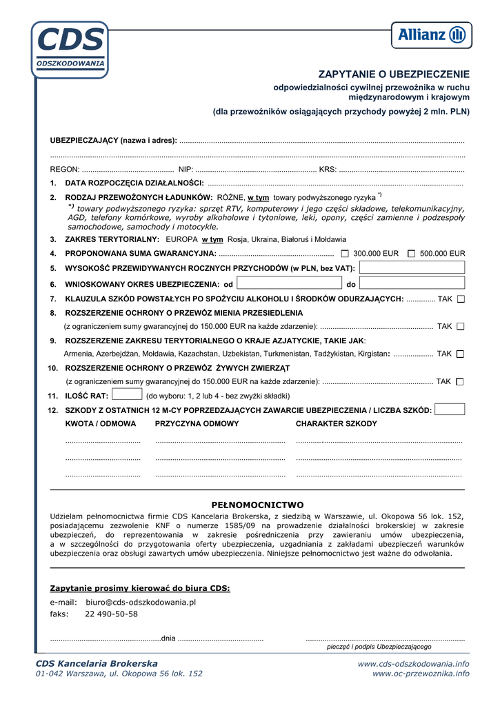 ZAPYTANIE O UBEZPIECZENIE odpowiedzialności cywilnej przewoźnika w ruchu międzynarodowym i krajowym (dla przewoźników osiągających przychody powyżej 2 mln. PLN) UBEZPIECZAJĄCY (nazwa i adres): ........................................................................................................................................ ...................................................................................................................................................................................................... REGON: ............................................ NIP: .......................................................... KRS: ............................................................ 1. DATA ROZPOCZĘCIA DZIAŁALNOŚCI: .......................................................................................................................... 2. RODZAJ PRZEWOŻONYCH ŁADUNKÓW: RÓŻNE, w tym towary podwyższonego ryzyka *) towary podwyższonego ryzyka: sprzęt RTV, komputerowy i jego części składowe, telekomunikacyjny, AGD, telefony komórkowe, wyroby alkoholowe i tytoniowe, leki, opony, części zamienne i podzespoły samochodowe, samochody i motocykle. 3. ZAKRES TERYTORIALNY: EUROPA w tym Rosja, Ukraina, Białoruś i Mołdawia 4. PROPONOWANA SUMA GWARANCYJNA: ....................................................... 5. WYSOKOŚĆ PRZEWIDYWANYCH ROCZNYCH PRZYCHODÓW (w PLN, bez VAT): 6. WNIOSKOWANY OKRES UBEZPIECZENIA: od 7. KLAUZULA SZKÓD POWSTAŁYCH PO SPOŻYCIU ALKOHOLU I ŚRODKÓW ODURZAJĄCYCH: .............. TAK 8. ROZSZERZENIE OCHRONY O PRZEWÓZ MIENIA PRZESIEDLENIA *) 300.000 EUR 500.000 EUR do (z ograniczeniem sumy gwarancyjnej do 150.000 EUR na każde zdarzenie): ...................................................... TAK 9. ROZSZERZENIE ZAKRESU TERYTORIALNEGO O KRAJE AZJATYCKIE, TAKIE JAK: Armenia, Azerbejdżan, Mołdawia, Kazachstan, Uzbekistan, Turkmenistan, Tadżykistan, Kirgistan: ................... TAK 10. ROZSZERZENIE OCHRONY O PRZEWÓZ ŻYWYCH ZWIERZĄT (z ograniczeniem sumy gwarancyjnej do 150.000 EUR na każde zdarzenie): ..................................................... TAK 11. ILOŚĆ RAT: (do wyboru: 1, 2 lub 4 - bez zwyżki składki) 12. SZKODY Z OSTATNICH 12 M-CY POPRZEDZAJĄCYCH ZAWARCIE UBEZPIECZENIA / LICZBA SZKÓD: KWOTA / ODMOWA PRZYCZYNA ODMOWY CHARAKTER SZKODY .................................... .............................................................. ............ ................................................................... .................................... .............................................................. ............................................................................... .................................... .............................................................. ............................................................................... PEŁNOMOCNICTWO Udzielam pełnomocnictwa firmie CDS Kancelaria Brokerska, z siedzibą w Warszawie, ul. Okopowa 56 lok. 152, posiadającemu zezwolenie KNF o numerze 1585/09 na prowadzenie działalności brokerskiej w zakresie ubezpieczeń, do reprezentowania w zakresie pośredniczenia przy zawieraniu umów ubezpieczenia, a w szczególności do przygotowania oferty ubezpieczenia, uzgadniania z zakładami ubezpieczeń warunków ubezpieczenia oraz obsługi zawartych umów ubezpieczenia. Niniejsze pełnomocnictwo jest ważne do odwołania. Zapytanie prosimy kierować do biura CDS: e-mail: [email protected] faks: 22 490-50-58 .....................................................dnia ......................................... ............................................................................ pieczęć i podpis Ubezpieczającego CDS Kancelaria Brokerska 01-042 Warszawa, ul. Okopowa 56 lok. 152 www.cds-odszkodowania.info www.oc-przewoznika.info