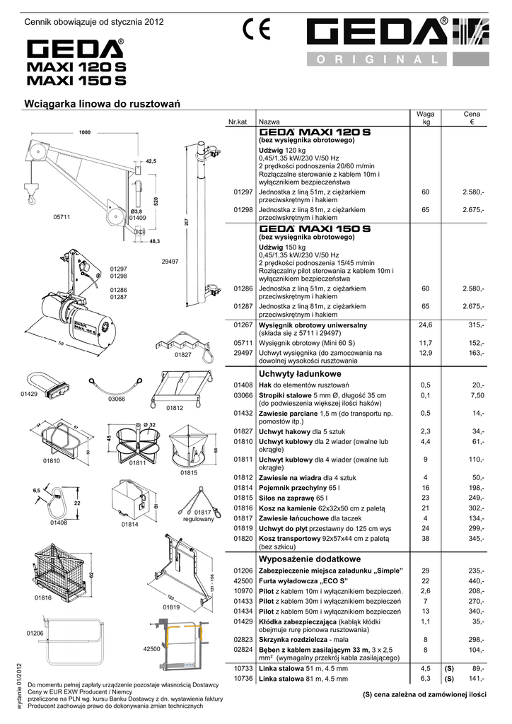 Cennik obowiązuje od stycznia 2012 Wciągarka linowa do rusztowań Nr.kat Nazwa Waga kg Cena € 60 2.580,- 65 2.675,- 60 2.580,- 65 2.675,- 1000 (bez wysięgnika obrotowego) Udźwig 120 kg 0,45/1,35 kW/230 V/50 Hz 2 prędkości podnoszenia 20/60 m/min Rozłączalne sterowanie z kablem 10m i wyłącznikiem bezpieczeństwa 01297 Jednostka z liną 51m, z ciężarkiem przeciwskrętnym i hakiem 01298 Jednostka z liną 81m, z ciężarkiem przeciwskrętnym i hakiem 520 42,5 Ø3,8 05711 01409 (bez wysięgnika obrotowego) Udźwig 150 kg 0,45/1,35 kW/230 V/50 Hz 2 prędkości podnoszenia 15/45 m/min Rozłączalny pilot sterowania z kablem 10m i wyłącznikiem bezpieczeństwa 01286 Jednostka z liną 51m, z ciężarkiem przeciwskrętnym i hakiem 01287 Jednostka z liną 81m, z ciężarkiem przeciwskrętnym i hakiem 48,3 29497 01297 01298 01286 01287 01827 01267 Wysięgnik obrotowy uniwersalny (składa się z 5711 i 29497) 05711 Wysięgnik obrotowy (Mini 60 S) 29497 Uchwyt wysięgnika (do zamocowania na dowolnej wysokości rusztowania 24,6 315,- 11,7 12,9 152,163,- 0,5 0,1 20,7,50 0,5 14,- 2,3 4,4 34,61,- 9 110,- 4 16 23 21 4 24 38 50,198,249,302,134,299,345,- Zabezpieczenie miejsca załadunku „Simple” Furta wyładowcza „ECO S” Pilot z kablem 10m i wyłącznikiem bezpieczeń. Pilot z kablem 30m i wyłącznikiem bezpieczeń Pilot z kablem 50m i wyłącznikiem bezpieczeń Kłódka zabezpieczająca (kabłąk kłódki obejmuje rurę pionowa rusztowania) 02823 Skrzynka rozdzielcza - mała 02824 Bęben z kablem zasilającym 33 m, 3 x 2,5 mm² (wymagalny przekrój kabla zasilającego) 29 22 2,6 7 13 1,1 235,440,208,270,340,35,- 8 8 298,104,- 10733 Linka stalowa 51 m, 4.5 mm 10736 Linka stalowa 81 m, 4.5 mm 4,5 6,3 Uchwyty ładunkowe 01429 03066 01812 01810 01811 01815 01408 01817 regulowany 01814 01408 Hak do elementów rusztowań 03066 Stropiki stalowe 5 mm Ø, długość 35 cm (do podwieszenia większej ilości haków) 01432 Zawiesie parciane 1,5 m (do transportu np. pomostów itp.) 01827 Uchwyt hakowy dla 5 sztuk 01810 Uchwyt kubłowy dla 2 wiader (owalne lub okrągłe) 01811 Uchwyt kubłowy dla 4 wiader (owalne lub okrągłe) 01812 Zawiesie na wiadra dla 4 sztuk 01814 Pojemnik przechylny 65 l 01815 Silos na zaprawę 65 l 01816 Kosz na kamienie 62x32x50 cm z paletą 01817 Zawiesie łańcuchowe dla taczek 01819 Uchwyt do płyt przestawny do 125 cm wys 01820 Kosz transportowy 92x57x44 cm z paletą (bez szkicu) Wyposażenie dodatkowe 01816 01819 01206 wydanie 01/2012 42500 Do momentu pełnej zapłaty urządzenie pozostaje własnością Dostawcy Ceny w EUR EXW Producent / Niemcy przeliczone na PLN wg. kursu Banku Dostawcy z dn. wystawienia faktury Producent zachowuje prawo do dokonywania zmian technicznych 01206 42500 10970 01433 01434 01429 (S) (S) 89,141,- (S) cena zależna od zamówionej ilości