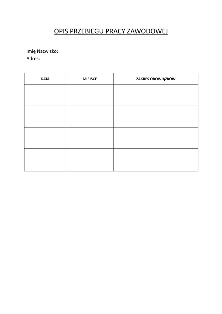 OPIS PRZEBIEGU PRACY ZAWODOWEJ Imię Nazwisko: Adres: DATA MIEJSCE ZAKRES OBOWIĄZKÓW