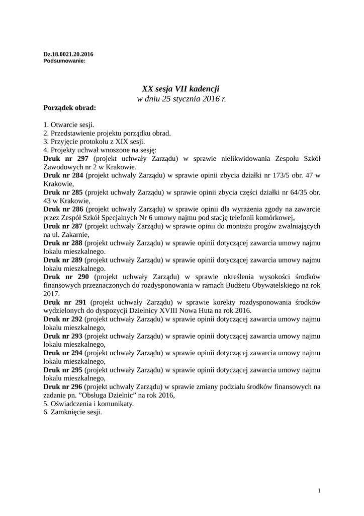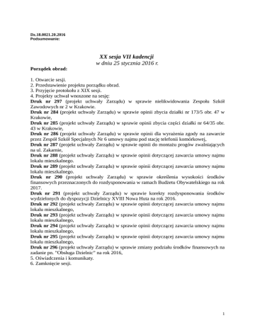 Dz.18.0021.20.2016 Podsumowanie: XX sesja VII kadencji w dniu 25 stycznia 2016 r. Porządek obrad: 1. Otwarcie sesji. 2. Przedstawienie projektu porządku obrad. 3. Przyjęcie protokołu z XIX sesji. 4. Projekty uchwał wnoszone na sesję: Druk nr 297 (projekt uchwały Zarządu) w sprawie nielikwidowania Zespołu Szkół Zawodowych nr 2 w Krakowie. Druk nr 284 (projekt uchwały Zarządu) w sprawie opinii zbycia działki nr 173/5 obr. 47 w Krakowie, Druk nr 285 (projekt uchwały Zarządu) w sprawie opinii zbycia części działki nr 64/35 obr. 43 w Krakowie, Druk nr 286 (projekt uchwały Zarządu) w sprawie opinii dla wyrażenia zgody na zawarcie przez Zespół Szkół Specjalnych Nr 6 umowy najmu pod stację telefonii komórkowej, Druk nr 287 (projekt uchwały Zarządu) w sprawie opinii do montażu progów zwalniających na ul. Zakarnie, Druk nr 288 (projekt uchwały Zarządu) w sprawie opinii dotyczącej zawarcia umowy najmu lokalu mieszkalnego. Druk nr 289 (projekt uchwały Zarządu) w sprawie opinii dotyczącej zawarcia umowy najmu lokalu mieszkalnego. Druk nr 290 (projekt uchwały Zarządu) w sprawie określenia wysokości środków finansowych przeznaczonych do rozdysponowania w ramach Budżetu Obywatelskiego na rok 2017. Druk nr 291 (projekt uchwały Zarządu) w sprawie korekty rozdysponowania środków wydzielonych do dyspozycji Dzielnicy XVIII Nowa Huta na rok 2016. Druk nr 292 (projekt uchwały Zarządu) w sprawie opinii dotyczącej zawarcia umowy najmu lokalu mieszkalnego, Druk nr 293 (projekt uchwały Zarządu) w sprawie opinii dotyczącej zawarcia umowy najmu lokalu mieszkalnego, Druk nr 294 (projekt uchwały Zarządu) w sprawie opinii dotyczącej zawarcia umowy najmu lokalu mieszkalnego, Druk nr 295 (projekt uchwały Zarządu) w sprawie opinii dotyczącej zawarcia umowy najmu lokalu mieszkalnego, Druk nr 296 (projekt uchwały Zarządu) w sprawie zmiany podziału środków finansowych na zadanie pn. ”Obsługa Dzielnic” na rok 2016, 5. Oświadczenia i komunikaty. 6. Zamknięcie sesji. 1 Podjęte uchwały: XX/271/16 XX/272/16 XX/273/16 XX/274/16 XX/275/16 XX/276/16 XX/276/16 XX/277/16 XX/278/16 XX/279/16 XX/280/16 XX/281/16 XX/282/16 XX/283/16 XX/284/16 w sprawie nielikwidowania Zespołu Szkół Zawodowych nr 2 w Krakowie w sprawie opinii do zbycia działki nr 173/5 obr. 47 w Krakowie w sprawie opinii do zbycia części działki nr 64/35 obr. 43 w Krakowie w sprawie opinii wyrażenia zgody na zawarcia przez Zespół Szkół Specjalnych Nr 6 umowy najmu pod stację telefonii komórkowej w sprawie opinii do montażu progów zwalniających na ul. Zakarnie w sprawie opinii dotyczącej zawarcia umowy najmu lokalu mieszkalnego w sprawie opinii dotyczącej zawarcia umowy najmu lokalu mieszkalnego w sprawie opinii dotyczącej zawarcia umowy najmu lokalu mieszkalnego w sprawie określenia wysokości środków finansowych przeznaczonych do rozdysponowania w ramach Budżetu Obywatelskiego na rok 2017 w sprawie rozdysponowania środków wydzielonych do dyspozycji Dzielnicy XVIII Nowa Huta na rok 2016 w sprawie opinii dotyczącej zawarcia umowy najmu lokalu mieszkalnego w sprawie opinii dotyczącej zawarcia umowy najmu lokalu mieszkalnego w sprawie opinii dotyczącej zawarcia umowy najmu lokalu mieszkalnego w sprawie opinii dotyczącej zawarcia umowy najmu lokalu mieszkalnego w sprawie zmiany wysokości środków finansowych na zadanie pn. „Obsługa Dzielnic” na rok 2016 2 Dz-18.0021.20.2016 PROTOKÓŁ XX SESJI RADY DZIELNICY XVIII Nowa Huta XX sesja Rady Dzielnicy XVIII Nowa Huta odbyła się 25 stycznia 2016 r. w siedzibie Dzielnicy XVIII os. Centrum B 6. W załączeniu: 1) Lista obecności radnych– zał. nr 1, 2) Autopoprawka zarządu do projektu uchwały na Druku Nr 291 – zał. nr 2. 3) Poprawki radnej Krystyny Frankiewicz – zał. 3, 4, 5. 4) Poprawka radnej Miłosławy Ciężak – zał. nr 6. 5) Poprawka radnego Mariana Basia – zał. nr 7. 6) Oryginały uchwał – zał. nr 8. XX sesję Rady Dzielnicy XVIII Nowa Huta otworzył o godz. 18.00 Przewodniczący Rady i Zarządu Dzielnicy XVIII, Pan Stanisław Moryc, który serdecznie przywitał obecnych na sali i stwierdził quorum. 2. Przedstawienie projektu porządku obrad. Przewodniczący przystąpił do zatwierdzenia porządku obrad. Projekt porządku został przesłany pocztą elektroniczną lub doręczony do skrytek wraz z zaproszeniem na sesję. Projekt porządku obrad obejmował: 1. Otwarcie sesji. 2. Przedstawienie projektu porządku obrad. 3. Przyjęcie protokołu z XIX sesji. 4. Projekty uchwał wnoszone na sesję: Druk nr 284 (projekt uchwały Zarządu) w sprawie opinii zbycia działki nr 173/5 obr. 47 w Krakowie, Druk nr 285 (projekt uchwały Zarządu) w sprawie opinii zbycia części działki nr 64/35 obr. 43 w Krakowie, Druk nr 286 (projekt uchwały Zarządu) w sprawie opinii dla wyrażenia zgody na zawarcie przez Zespół Szkół Specjalnych Nr 6 umowy najmu pod stację telefonii komórkowej, Druk nr 287 (projekt uchwały Zarządu) w sprawie opinii do montażu progów zwalniających na ul. Zakarnie, Druk nr 288 (projekt uchwały Zarządu) w sprawie opinii dotyczącej zawarcia umowy najmu lokalu mieszkalnego. Druk nr 289 (projekt uchwały Zarządu) w sprawie opinii dotyczącej zawarcia umowy najmu lokalu mieszkalnego. Druk nr 290 (projekt uchwały Zarządu) w sprawie określenia wysokości środków finansowych przeznaczonych do rozdysponowania w ramach Budżetu Obywatelskiego na rok 2017. Druk nr 291 (projekt uchwały Zarządu) w sprawie korekty rozdysponowania środków wydzielonych do dyspozycji Dzielnicy XVIII Nowa Huta na rok 2016. 5. Oświadczenia i komunikaty. 6. Zamknięcie sesji. 3 Przewodniczący poinformował radnych, że zarząd przygotował autopoprawkę do projektu uchwały: na Druku Nr 291 -w sprawie korekty rozdysponowania środków wydzielonych do dyspozycji Dzielnicy XVIII Nowa Huta na rok 2016. Prowadzący obrady zapytał czy ktoś chciałby zgłosić uwagi, zapytania i inne propozycje do pr