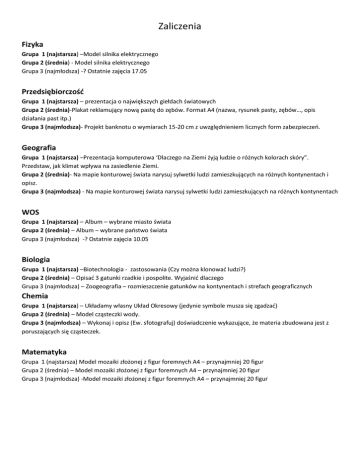 Zaliczenia Fizyka Grupa 1 (najstarsza) –Model silnika elektrycznego Grupa 2 (średnia) - Model silnika elektrycznego Grupa 3 (najmłodsza) -? Ostatnie zajęcia 17.05 Przedsiębiorczośd Grupa 1 (najstarsza) – prezentacja o największych giełdach światowych Grupa 2 (średnia)-Plakat reklamujący nową pastę do zębów. Format A4 (nazwa, rysunek pasty, zębów…, opis działania past itp.) Grupa 3 (najmłodsza)- Projekt banknotu o wymiarach 15-20 cm z uwzględnieniem licznych form zabezpieczeo. Geografia Grupa 1 (najstarsza) –Prezentacja komputerowa ‘Dlaczego na Ziemi żyją ludzie o różnych kolorach skóry”. Przedstaw, jak klimat wpływa na zasiedlenie Ziemi. Grupa 2 (średnia)- Na mapie konturowej świata narysuj sylwetki ludzi zamieszkujących na różnych kontynentach i opisz. Grupa 3 (najmłodsza) - Na mapie konturowej świata narysuj sylwetki ludzi zamieszkujących na różnych kontynentach WOS Grupa 1 (najstarsza) – Album – wybrane miasto świata Grupa 2 (średnia) – Album – wybrane paostwo świata Grupa 3 (najmłodsza) -? Ostatnie zajęcia 10.05 Biologia Grupa 1 (najstarsza) –Biotechnologia - zastosowania (Czy można klonowad ludzi?) Grupa 2 (średnia) – Opisad 3 gatunki rzadkie i pospolite. Wyjaśnid dlaczego Grupa 3 (najmłodsza) – Zoogeografia – rozmieszczenie gatunków na kontynentach i strefach geograficznych Chemia Grupa 1 (najstarsza) – Układamy własny Układ Okresowy (jedynie symbole musza się zgadzad) Grupa 2 (średnia) – Model cząsteczki wody. Grupa 3 (najmłodsza) – Wykonaj i opisz (Ew. sfotografuj) doświadczenie wykazujące, że materia zbudowana jest z poruszających się cząsteczek. Matematyka Grupa 1 (najstarsza) Model mozaiki złożonej z figur foremnych A4 – przynajmniej 20 figur Grupa 2 (średnia) – Model mozaiki złożonej z figur foremnych A4 – przynajmniej 20 figur Grupa 3 (najmłodsza) -Model mozaiki złożonej z figur foremnych A4 – przynajmniej 20 figur Kultura (grupa I,II,III) Drodzy Uczniowie! Jeśli zdecydujecie się na zaliczenie kultury, wybierzcie jedno z dwóch zadań, wykonajcie je i dostarczcie do szkoły w terminie wyznaczonym na zaliczenie. Zadanie 1 Przeprowadź wywiad z osobą dorosłą (mam, babcia, dziadek, sąsiadka, nauczyciel itp.) na temat tradycji kultury, zwyczajów i obyczajów. Wywiad może mieć formę zapisu papierowego, nagrania na płycie CD bądź innym nośniku. Oto pomocnicze pytania do wywiadu. a) Proszę powiedzieć kilka słów o sobie; jak się Pani/Pan nazywa, jaki zawód wykonuje, gdzie mieszka? b) Jak Pan/Pani spędza wolny czas? c) Czy zachowały się jakieś zabawy, gry, rozrywki lub inne sposoby spędzania wolnego czasu, które były popularne w Pani/Pana dziecińskie, młodości? d) Jak Pan/Pani ocenia rozrywki i zabawy współczesnego młodego pokolenia? e) Jakie tradycje kultywuje się w Pani/Pana domu, kręgu rodzinnym związane np. ze świętami? f) Czy w Pani/Pana rodzinie są jakieś tradycje typowe tylko dla Pani/Pana najbliższych, przekazywane z pokolenia na pokolenie? Jeśli tak, to proszę o nich opowiedzieć. g) Czy korzysta Pani/Pan z oferty instytucji kultury? Jeśli tak, to z jakich instytucji i z jakich imprez? Pytań może być więcej lub mniej. Wywiad powinien zaczynać się powitaniem i przedstawieniem rozmowy, a kończyć podziękowaniem za rozmowę. Zadanie 2 Wykonaj makietę (dowolność formy, techniki, materiałów do wykonania) Twojej małej ojczyzny, ze szczególnym uwzględnieniem miejsc kultury i rozrywki (domy kultury, szkoły, kina, muzea, teatry, galerie, ważne dla Ciebie miejsca). Naucz się opowiadać o tych miejscach. Życzę miłej pracy - Robert Chamczyk Język polski Grupa najmłodsza (III): WYOBRAŹNIA CZARODZIEJKA: Puśd wodze fantazji. Napisz dłuższe opowiadanie (lub rozdział powieści) o dowolnej tematyce. Wykorzystaj w nim opisy miejsca, postaci, sytuacji, wprowadź dialogi. Pamiętaj o bogatym słownictwie i poprawności językowej. Wykonaj ilustracje do swojej pracy. Możesz oprawid swój tekst. Zaprojektuj i sam wykonaj okładki do utworu. Grupa średnia (II) ”Refleksyjny OPTymista” Opowiadanie fantastyczne (patrz grupa III ) zaproponowane jako zaliczenie na zajęciach j.polskiego lub Zaprezentuj tomik własnej poezji . Przedmiotem swoich poszukiwao humanistycznych uczyo otaczającą rzeczywistośd, jak również wszystko to, co związane jest z człowiekiem. Jeśli trudno wyrazid Ci swoje myśli i emocje w liryce, zaprezentuj je w formie kartek z pamiętnika. Pamiętaj, by pokazad przede wszystkim własny punkt widzenia. Pamiętaj też o bogatym słownictwie i poprawności językowej. Wykonaj ilustracje do swojej pracy. Zaprojektuj i sam wykonaj okładki do swego zbiorku. Grupa najstarsza (I) NA SCENIE Zaprezentuj własną sztukę teatralną o dowolnym temacie. Pamiętaj o szczególnym zapisie tego typu tekstu: tekst główny stanowią dialogi i monologi bohaterów, tekst poboczny informuje o tym, co dzieje się na scenie (zapisywany jest kursywą). Wykaż się pomysłowością, oryginalnością ujęcia tematu, bogactwem słownictwa. Zaprojektuj i sam wykonaj okładki do swego utworu. Plastyka Grupa 1 (najstarsza)- praca trójwymiarowa technika do wyboru: glina, masa papierowa, mydło itp.( rzeźba do 30 cm wysokości)- POSTAĆ ZE SNU Grupa 2 (średnia)- kolaż format A4 ( wyklejanka)- NIESAMOWITA HISTORIA lub zrobid passe-partout i dokooczyd prace zaczęte podczas zajęd Grupa 3 (najmłodsza)- komiks- OPOWIADANIE O PRZYJACIELU, KTÓRY ZAWSZE POMAGA. ( po tej historyjce nie musisz pytad, dlaczego to moja najlepsza koleżanka, kolega)