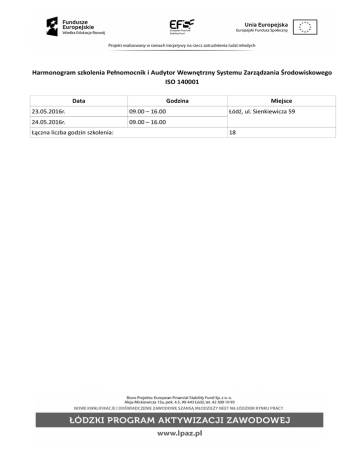 Harmonogram szkolenia Pełnomocnik i Audytor Wewnętrzny Systemu Zarządzania Środowiskowego ISO 140001 Data Godzina 23.05.2016r. 09.00 – 16.00 24.05.2016r. 09.00 – 16.00 Łączna liczba godzin szkolenia: Miejsce Łódź, ul. Sienkiewicza 59 18