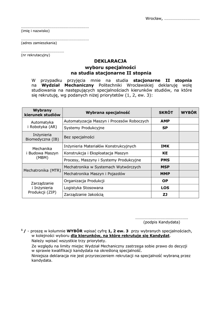 Wrocław, ................................. ............................................................... (imię i nazwisko) ............................................................... (adres zamieszkania) ........................................ (nr rekrutacyjny) DEKLARACJA wyboru specjalności na studia stacjonarne II stopnia W przypadku przyjęcia mnie na studia stacjonarne II stopnia na Wydział Mechaniczny Politechniki Wrocławskiej deklaruję wolę studiowania na następujących specjalnościach kierunków studiów, na które się rekrutuję, wg podanych niżej priorytetów (1, 2, ew. 3): Wybrany kierunek studiów Automatyka i Robotyka (AR) Inżynieria Biomedyczna (IB) Mechanika i Budowa Maszyn (MBM) Mechatronika (MTR) Zarządzanie i Inżynieria Produkcji (ZIP) Wybrana specjalność SKRÓT Automatyzacja Maszyn i Procesów Roboczych Systemy Produkcyjne WYBÓR AMP SP Bez specjalności Inżynieria Materiałów Konstrukcyjnych Konstrukcja i Eksploatacja Maszyn IMK KE Procesy, Maszyny i Systemy Produkcyjne PMS Mechatronika w Systemach Wytwórczych MSP Mechatronika Maszyn i Pojazdów MMP Organizacja Produkcji OP Logistyka Stosowana LOS Zarządzanie Jakością ZJ ................................................. (podpis Kandydata) 1 / - proszę w kolumnie WYBÓR wpisać cyfrę 1, 2 ew. 3 przy wybranych specjalnościach, w kolejności wyboru dla kierunków, na które rekrutuje się Kandydat. Należy wpisać wszystkie trzy priorytety. Ze względu na limity miejsc Wydział Mechaniczny zastrzega sobie prawo do decyzji w sprawie kwalifikacji kandydata na określoną specjalność. Niniejsza deklaracja nie jest przyrzeczeniem rekrutacji na specjalność wybraną przez kandydata.