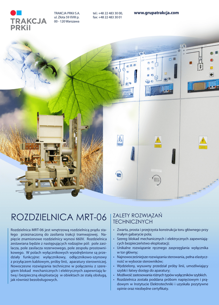 TRAKCJA PRKiI S.A. ul. Złota 59 XVIII p. 00 - 120 Warszawa tel.: +48 22 483 30 00, fax: +48 22 483 30 01 www.grupatrakcja.com ROZDZIELNICA MRT-06 ZALETY ROZWIĄZAŃ TECHNICZNYCH Rozdzielnica MRT-06 jest wnętrzową rozdzielnicą prądu stałego przeznaczoną do zasilania trakcji tramwajowej. Napięcie znamionowe rozdzielnicy wynosi 660V. Rozdzielnica zestawiana będzie z następujących rodzajów pól: pole zasilacza, pole zasilacza rezerwowego, pole zespołu prostownikowego. W polach wyłącznikowych wyodrębnione są przedziały funkcyjne: wyłącznikowy, odłącznikowo-szynowy z przyłączem kablowym, próby linii, aparatury sterowniczej. Nowoczesne rozwiązania techniczne w połączeniu z szeregiem blokad mechanicznych i elektrycznych zapewniają łatwą i bezpieczną eksploatację w obiektach ze stałą obsługą, jak również bezobsługowych. • Zwarta, prosta i przejrzysta konstrukcja toru głównego przy małym gabarycie pola; • Szereg blokad mechanicznych i elektrycznych zapewniających bezpieczeństwo eksploatacji; • Unikalne rozwiązanie ręcznego zasprzęglania wyłącznika w tor główny; • Najnowocześniejsze rozwiązania sterowania, pełna elastyczność w wyborze sterowników; • Wydzielony, wysuwny przedział próby linii, umożliwiający szybki i łatwy dostęp do aparatury; • Możliwość zastosowania różnych typów wyłączników szybkich. • Rozdzielnica została poddana próbom napięciowym i prądowym w Instytucie Elektrotechniki i uzyskała pozytywne opinie oraz niezbędne certyfikaty. 1 – Przedział aparatury sterowniczej; 2 – Wysuwny człon z aparaturą próby linii; 3 – Ruchoma kotara; 4 – Szyna obejściowa; 5 – Szyna główna; 6 – Odłącznik szyny obejściowej; 7 – Wyłącznik; 8 – Ruchoma szuflada wyłącznika; 9 – Sprzęg obwodu próby linii; 10 – Wózek transportowy; 11 – Przyłącze kablowe PODSTAWOWE DANE ZNAMIONOWE Napięcie znamionowe rozdzielnicy 660 V DC Prąd znamionowy ciągły szyn zbiorczych do 6000 A Prąd znamionowy ciągły szyny obejściowej do 4000 A Prąd znamionowy ciągły zasilacza trakcyjnego 2000, 4000 *A* - w zależności od odł. Prąd znamionowy ciągły pola zespołu prostownikowego 2000 A Prąd znamionowy krótkotrwały wytrzymywany szyn zbiorczych 100/0,25 kA/1s Prąd znamionowy krótkotrwały wytrzymywany - szyny obejściowej, zasilacza trakcyjnego 75/0,25 kA/1s Prąd znamionowy szczytowy wytrzymywany szyn zbiorczych 150 kA Prąd znamionowy szczytowy wytrzymywany - szyny obejściowej, zasilacza trakcyjnego 100 kA Napięcie udarowe wytrzymywane 8 kV/9,6 kV Napięcie wytrzymywane o częstotliwości sieciowej 3,6/4,3 kV Gabaryt 600/2000/1700 mm szer./wys./gł. www.grupatrakcja.com
