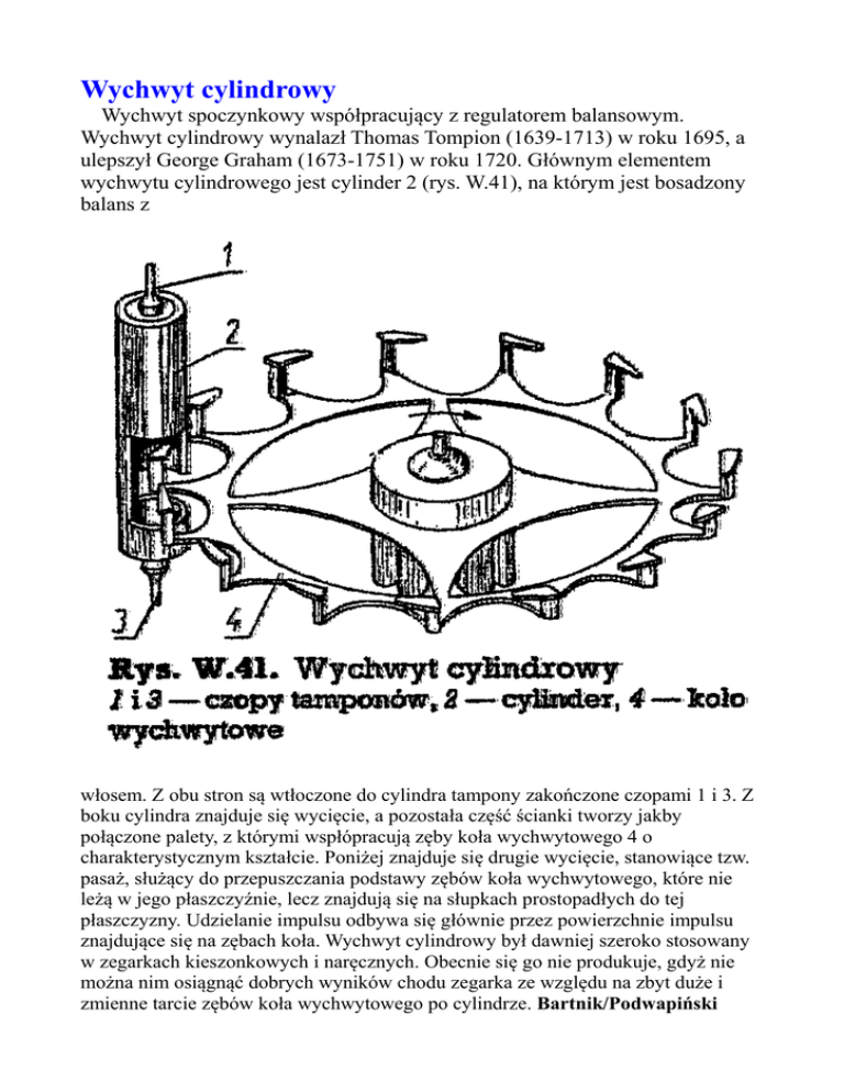 Wychwyt cylindrowy Wychwyt spoczynkowy współpracujący z regulatorem balansowym. Wychwyt cylindrowy wynalazł Thomas Tompion (1639-1713) w roku 1695, a ulepszył George Graham (1673-1751) w roku 1720. Głównym elementem wychwytu cylindrowego jest cylinder 2 (rys. W.41), na którym jest bosadzony balans z włosem. Z obu stron są wtłoczone do cylindra tampony zakończone czopami 1 i 3. Z boku cylindra znajduje się wycięcie, a pozostała część ścianki tworzy jakby połączone palety, z którymi wspłópracują zęby koła wychwytowego 4 o charakterystycznym kształcie. Poniżej znajduje się drugie wycięcie, stanowiące tzw. pasaż, służący do przepuszczania podstawy zębów koła wychwytowego, które nie leżą w jego płaszczyźnie, lecz znajdują się na słupkach prostopadłych do tej płaszczyzny. Udzielanie impulsu odbywa się głównie przez powierzchnie impulsu znajdujące się na zębach koła. Wychwyt cylindrowy był dawniej szeroko stosowany w zegarkach kieszonkowych i naręcznych. Obecnie się go nie produkuje, gdyż nie można nim osiągnąć dobrych wyników chodu zegarka ze względu na zbyt duże i zmienne tarcie zębów koła wychwytowego po cylindrze. Bartnik/Podwapiński