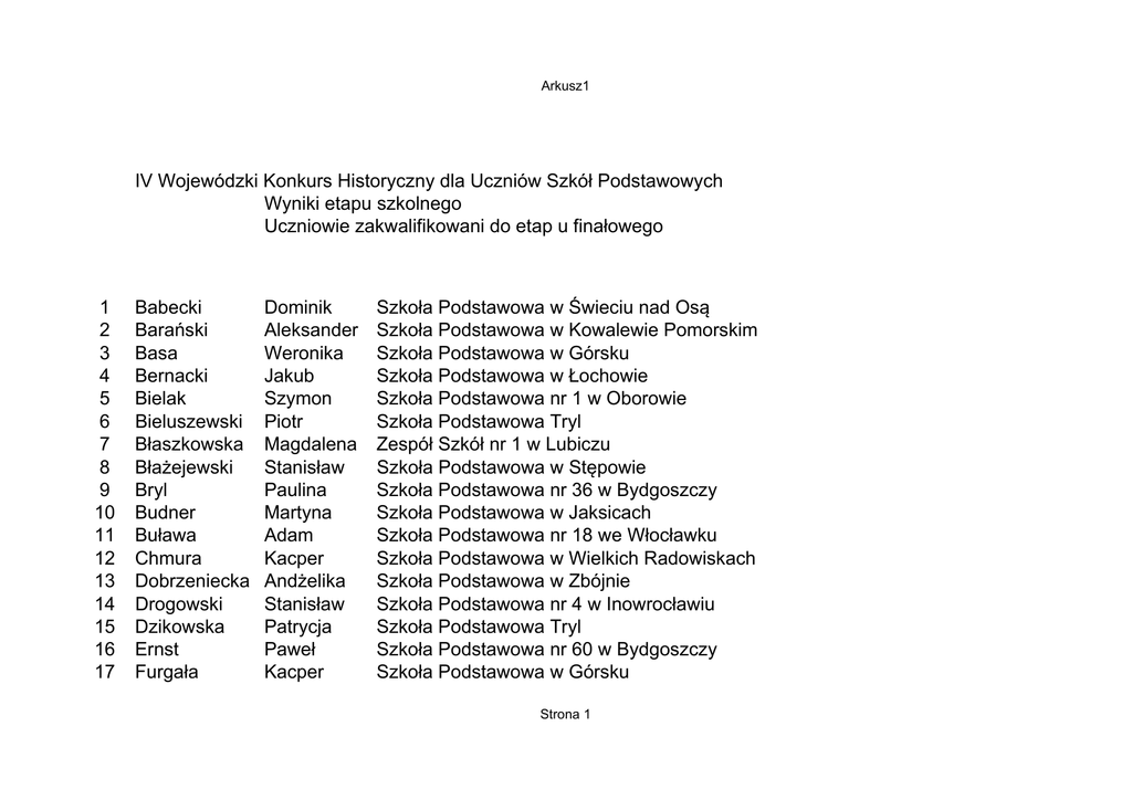 Arkusz1 IV Wojewódzki Konkurs Historyczny dla Uczniów Szkół Podstawowych Wyniki etapu szkolnego Uczniowie zakwalifikowani do etap u finałowego 1 2 3 4 5 6 7 8 9 10 11 12 13 14 15 16 17 Babecki Barański Basa Bernacki Bielak Bieluszewski Błaszkowska Błażejewski Bryl Budner Buława Chmura Dobrzeniecka Drogowski Dzikowska Ernst Furgała Dominik Aleksander Weronika Jakub Szymon Piotr Magdalena Stanisław Paulina Martyna Adam Kacper Andżelika Stanisław Patrycja Paweł Kacper Szkoła Podstawowa w Świeciu nad Osą Szkoła Podstawowa w Kowalewie Pomorskim Szkoła Podstawowa w Górsku Szkoła Podstawowa w Łochowie Szkoła Podstawowa nr 1 w Oborowie Szkoła Podstawowa Tryl Zespół Szkół nr 1 w Lubiczu Szkoła Podstawowa w Stępowie Szkoła Podstawowa nr 36 w Bydgoszczy Szkoła Podstawowa w Jaksicach Szkoła Podstawowa nr 18 we Włocławku Szkoła Podstawowa w Wielkich Radowiskach Szkoła Podstawowa w Zbójnie Szkoła Podstawowa nr 4 w Inowrocławiu Szkoła Podstawowa Tryl Szkoła Podstawowa nr 60 w Bydgoszczy Szkoła Podstawowa w Górsku Strona 1 Arkusz1 18 19 20 21 22 23 24 25 26 27 28 29 30 31 32 33 34 35 36 37 38 39 40 41 42 Górski Grajek Grzybowska Hempel Hopke Hopke Idczak Jagielski Jaruszewski Jaworska Kaszyński Kempa Kijewska Kirsz Komorowska Kossmann Kozakiewicz Kozakiewicz Kozłowski Kuliński Kwieciński Łaganowski Mackiewicz Malinowski Mosakowski Jakub Agnieszka Alicja Zuzanna Jakub Mikołaj Agata Jakub Adam Agata Wiktor Maksymilian Wiktoria Joanna Nadia Piotr Piotr Zuzanna Filip Oskar Jan Jakub Julia Konrad Filip Szkoła Podstawowa nr 7 we Włocławku Szkoła Podstawowa w Gąsawie Szkoła Podstawowa w Krojczynie Szkoła Podstawowa nr 7 we Włocławku Szkoła Podstawowa w Łążynie Szkoła Podstawowa w Łążynie Szkoła Podstawowa nr 11 w Inowrocławiu Zespół Szkół nr 1 w Lubiczu Szkoła Podstawowa nr 36 w Bydgoszczy Szkoła Podstawowa nr 16 w Bydgoszczy Szkoła Podstawowa Towarzystwa Salezjańskiego im.św. Dominika Savio w Toruniu Szkoła Podstawowa nr 14 w Bydgoszczy Szkoła Podstawowa nr 23 we Włoclawku Szkoła Podstawowa w Zawdzie Szkoła Podstawowa nr 7 we Włocławku Szkoła Podstawowa nr 5 w Toruniu Szkoła Podstawowa w Tłuchowie Publiczna Szkoła Podstawowa nr 1 w Aleksandrowie Kujawskim Zespół Szkół nr 1 w Lubiczu Szkoła Podstawowa nr 20 we Włocławku Szkoła Podstawowa nr 4 w Inowrocławiu Szkoła Podstawowa nr 2 w Mogilnie Katolicka Szkoła Podstawowa w Bydgoszczy Szkoła Podstawowa nr 1 w Świeciu Prywatna Szkoła Podstawowa Zespołu Edukacja Wiedza Strona 2 Arkusz1 43 44 45 46 47 48 49 50 51 52 53 54 55 56 57 58 59 60 61 62 63 64 65 66 67 Nadolski Miłosz Nowakowski Hubert Olter Marcin Ostrowska Weronika Ostrowski Dawid Perlik Mikołaj Piasecki Tomasz Pieszak Wiktoria Piotrkowska Julia Piórkowski Paweł Polakowski Franciszek Prill Jędrzej Przychodny Janusz Rosłonowski Szymon Rozmarynowska Aleksandra Rutkowska Marta Serkowski Oskar Sobiechowska Amelia Sołtys Mateusz Suski Feliks Szulc Eryk Szydłowska Maria Szydzik Adam Szymański Wit Szypura Julia Szkoła Podstawowa w Tłuchowie Szkoła Podstawowa w Górsku Szkoła Podstawowa nr 36 w Bydgoszczy Szkoła Podstawowa w Pokrzydowie Szkoła Podstawowa w Tłuchowie Szkoła Podstawowa nr 60 w Bydgoszczy Szkoła Podstawowa nr 6 w Inowrocławiu Szkoła Podstawowa nr 2 w Mogilnie Szkoła Podstawowa w Kowalu Społeczna Szkoła Podstawowa Stowarzyszenia Edukacja w Toruniu Szkoła Podstawowa nr 12 w Bydgoszczy Szkoła Podstawowa nr 4 w Inowrocławiu Zespół Szkół w Działyniu Zespół Szkół w Kikole Szkoła Podstawowa nr 48 w Bydgoszczy Szkoła Podstawowa nr 5 w Lipnie Szkoła Podstawowa w Wierzchosławicach Szkoła Podstawowa nr 48 w Bydgoszczy Publiczna Szkoła Podstawowa nr 1 w Aleksandrowie Kujawskim Publiczna Szkoła Podstawowa im. ks Jana Długosza we Włocławku Szkoła Podstawowa nr 10 w Bydgoszczy Szkoła Podstawowa nr 6 w Inowrocławiu Szkoła Podstawowa nr 3 w Mogilnie Szkoła Podstawowa nr 4 w Inowrocławiu Katolicka Szkoła Podstawowa w Inowrocławiu Strona 3 Arkusz1 68 69 70 71 72 73 74 75 76 Śliwiński Śmigielska Tkaczyński Tschurl Ubysz Wołowska Woźniczka Zawada Zglinicka Dominik Olga Marcel Wiktor Krzysztof Julia Maciej Michał Katarzyna Szkoła Podstawowa nr 1 w Brodnicy Szkoła Podstawowa nr 46 w Bydgoszczy Szkoła Podstawowa w Wałdowie Szlacheckim Szkoła Podstawowa nr 11 w Inowrocławiu Szkoła Podstawowa nr 8 we Włocławku Szkoła Podstawowa w Górsku Katolicka Szkoła Podstawowa w Inowrocławiu Szkoła Podstawowa w Strzelnie Szkoła Podstawowa w Zbójnie Strona 4