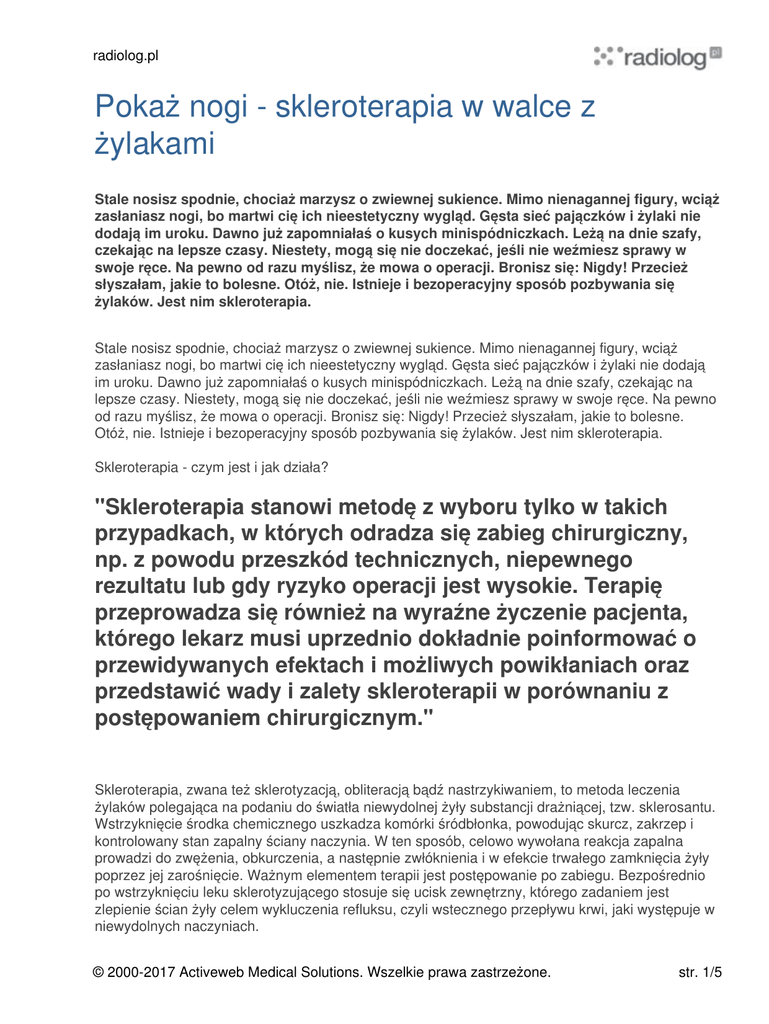 radiolog.pl Pokaż nogi - skleroterapia w walce z żylakami Stale nosisz spodnie, chociaż marzysz o zwiewnej sukience. Mimo nienagannej figury, wciąż zasłaniasz nogi, bo martwi cię ich nieestetyczny wygląd. Gęsta sieć pajączków i żylaki nie dodają im uroku. Dawno już zapomniałaś o kusych minispódniczkach. Leżą na dnie szafy, czekając na lepsze czasy. Niestety, mogą się nie doczekać, jeśli nie weźmiesz sprawy w swoje ręce. Na pewno od razu myślisz, że mowa o operacji. Bronisz się: Nigdy! Przecież słyszałam, jakie to bolesne. Otóż, nie. Istnieje i bezoperacyjny sposób pozbywania się żylaków. Jest nim skleroterapia. Stale nosisz spodnie, chociaż marzysz o zwiewnej sukience. Mimo nienagannej figury, wciąż zasłaniasz nogi, bo martwi cię ich nieestetyczny wygląd. Gęsta sieć pajączków i żylaki nie dodają im uroku. Dawno już zapomniałaś o kusych minispódniczkach. Leżą na dnie szafy, czekając na lepsze czasy. Niestety, mogą się nie doczekać, jeśli nie weźmiesz sprawy w swoje ręce. Na pewno od razu myślisz, że mowa o operacji. Bronisz się: Nigdy! Przecież słyszałam, jakie to bolesne. Otóż, nie. Istnieje i bezoperacyjny sposób pozbywania się żylaków. Jest nim skleroterapia. Skleroterapia - czym jest i jak działa? "Skleroterapia stanowi metodę z wyboru tylko w takich przypadkach, w których odradza się zabieg chirurgiczny, np. z powodu przeszkód technicznych, niepewnego rezultatu lub gdy ryzyko operacji jest wysokie. Terapię przeprowadza się również na wyraźne życzenie pacjenta, którego lekarz musi uprzednio dokładnie poinformować o przewidywanych efektach i możliwych powikłaniach oraz przedstawić wady i zalety skleroterapii w porównaniu z postępowaniem chirurgicznym." Skleroterapia, zwana też sklerotyzacją, obliteracją bądź nastrzykiwaniem, to metoda leczenia żylaków polegająca na podaniu do światła niewydolnej żyły substancji drażniącej, tzw. sklerosantu. Wstrzyknięcie środka chemicznego uszkadza komórki śródbłonka, powodując skurcz, zakrzep i kontrolowany stan zapalny ściany naczynia. W ten sposób, celowo wywołana reakcja zapalna prowadzi do zwężenia, obkurczenia, a następnie zwłóknienia i w efekcie trwałego zamknięcia żyły poprzez jej zarośnięcie. Ważnym elementem terapii jest postępowanie po zabiegu. Bezpośrednio po wstrzyknięciu leku sklerotyzującego stosuje się ucisk zewnętrzny, którego zadaniem jest zlepienie ścian żyły celem wykluczenia refluksu, czyli wstecznego przepływu krwi, jaki występuje w niewydolnych naczyniach. © 2000-2017 Activeweb Medical Solutions. Wszelkie prawa zastrzeżone. str. 1/5 radiolog.pl Odmianą skleroterapii służącą zamykaniu bardzo drobnych żyłek, tzw. teleangiektazji jest mikroskleroterapia. Tego rodzaju zabieg przeprowadza się przy użyciu okularów powiększających i bardzo delikatnych, miniaturowych igiełek. Obserwowany w ciągu ostatnich lat postęp techniczny nie ominął także i skleroterapii. USG z Dopplerem umożliwia precyzyjną diagnostykę z nieinwazyjną wizualizacją naczyń, dzięki czemu rozwinęła się echoskleroterapia, czyli technika skleroterapii, w której lek podawany jest do żyły pod kontrolą USG. Środki obliterujące Rodzaj substancji, która będzie użyta do skleroterapii ustala flebolog - specjalista chorób żył wykonujący zabieg. O jego wyborze decyduje wielkość i średnica niewydolnej żyły, a także preferencje osobiste. Stężenie środka obliterującego dobiera się w zależności od rozmiaru i lokalizacji chorego naczynia. Substancje sklerotyzujące różnią się między sobą odczynowością. Wyróżnia się trzy grupy sklerosantów: 1. środki hipertoniczne - roztwory soli kuchennej lub glukozy o wysokich stężeniach, które uszkadzają naczynia poprzez odwodnienie; 2. roztwory detergentów - odwadniają, a tym samym uszkadzają wewnętrzną warstwę śródbłonka naczynia; 3. leki bazujące na związkach jodu - działają drażniąco na błonę komórek śródbłonka, powodując jej uszkodzenie. W chwili obecnej, najczęściej stosuje się takie substancje chemiczne, jak salicylan sodu oraz siarczan sodowy tetradecylu, a z preparatów Fibrovein i Polidokanol (Aetoxysclerol). Używane w trakcie leczenia środki nie są toksyczne dla organizmu i stanowią odpowiednio rozcieńczone fabrycznie leki. Gwarantuje to większe bezpieczeństwo i skuteczność przeprowadzanego zbiegu. Najnowocześniejszą techniką sklerotyzacji jest tzw. skleroterapia piankowa Tessariego. Metoda ta polega na wstrzyknięciu do żylaka leku w postaci specjalnie spreparowanej pianki. Piankę wytwarza się poprzez zmieszanie sklerosantu z powietrzem w proporcji 1:5. Istotną zaletą tej techniki jest to, że środek w postaci pianki nie rozpływa się w żyle i zakleja tylko wybrane naczynia. Ponadto, taka postać leku oddziałuje na ścianę naczynia na większej powierzchni, zapewniając tym samym mniejsze zużycie sklerosantu. Wskazania Skleroterapia stanowi metodę z wyboru tylko w takich przypadkach, w których odradza się zabieg chirurgiczny, np. z powodu przeszkód technicznych, niepewnego rezultatu lub gdy ryzyko operacji jest wysokie. Terapię przeprowadza się również na wyraźne życzenie pacjenta, którego lekarz musi uprzednio dokładnie poinformować o przewidywanych efektach i możliwych powikłaniach oraz przedstawić wady i zalety skleroterapii w porównaniu z postępowaniem chirurgicznym. Warto mieć tutaj na uwadze, że żylaki to nie tylko defekt natury estetycznej, ale też poważny problem zdrowotny. Najczęstszymi wskazaniami do zabiegu skleroterapii są: - teleangiektazje (pajączki żylne skóry), © 2000-2017 Activeweb Medical Solutions. Wszelkie prawa zastrzeżone. str. 2/5 radiolog.pl - wenulektazje (rozszerzone naczynka śródskórne), - zmiany w obrębie żył siatkowatych, - małe żylaki (1-3 mm), - żylaki pozostałe lub nawracające po operacji, - żylaki umiejsco
