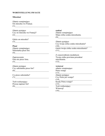 WORTSTELLUNG IM SATZ Mieszkać Zdanie oznajmujące On mieszka we Francji. (1)________________________________ Zdanie pytające Czy on mieszka we Francji? (2)________________________________ Gdzie on mieszka? (3)________________________________ Pisać Zdanie oznajmujące Sekretarka pisze list. (4)________________________________ Zaprzeczenie Ona nie pisze listu. (5)________________________________ Zdanie pytające Czy sekretarka pisze list? (6)________________________________ Co pisze sekretarka? (7)________________________________ Tryb rozkazujący Proszę napisać list! (8)________________________________ szukać Zdanie oznajmujące Moja córka szuka mieszkania. (9)________________________________ Zdanie pytające Czy twoja córka szuka mieszkania? (10)_______________________________ Gdzie twoja córka szuka mieszkania? (11)_______________________________ Z czasownikiem modalnym Twoja córka powinna poszukać mieszkania. (12)_______________________________ wstawać zdanie oznajmujące Petra wstaje (13)_______________________________ Zdanie pytające Czy Petra już wstaje? (14)_______________________________ Kiedy Petra wstaje? (15)_______________________________ Tryb rozkazujący Wstawaj! (16)_______________________________ ----------Schlüssel---------Wortstellung im Satz Mieszkać Zdanie oznajmujące On mieszka we Francji. Er wohnt in Frankreich. Zdanie pytające Czy on mieszka we Francji? Wohnt er in Frankreich? Gdzie on mieszka? Wo wohnt er? Pisać Zdanie oznajmujące Sekretarka pisze list. Die Sekretärin schreibt einen Brief. Zaprzeczenie Ona nie pisze listu. Sie schreibt keinen Brief. Zdanie pytające Czy sekretarka pisze list? Schreibt die Sekretärin einen Brief? Co pisze sekretarka? Was schreibt die Sekretärin? Tryb rozkazujący Proszę napisać list! Schreiben Sie bitte den Brief. suchen - szukać Zdanie oznajmujące Moja córka szuka mieszkania. Meine Tochter sucht eine Wohnung. Zdanie pytające Czy twoja córka szuka mieszkania? Sucht deine Tochter eine Wohnung? Gdzie twoja córka szuka mieszkania? Wo sucht deine Tochter eine Wohnung? Z czasownikiem modalnym Twoja córka powinna poszukać mieszkania. Deine Tochter soll eine Wohnung suchen. aufstehen - wstawać zdanie oznajmujące Petra wstaje Petra steht auf. Zdanie pytające Czy Petra już wstaje? Steht Petra schon auf? Kiedy Petra wstaje? Wann steht Petra auf? Tryb rozkazujący Wstawaj! Steh auf!