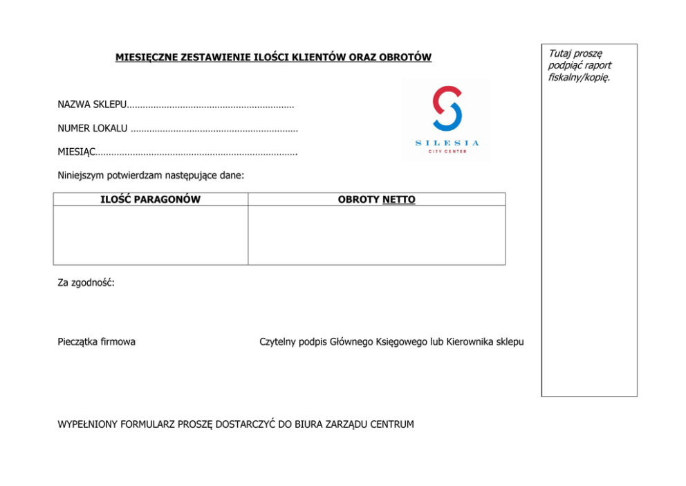 MIESIĘCZNE ZESTAWIENIE ILOŚCI KLIENTÓW ORAZ OBROTÓW NAZWA SKLEPU……………………………………………………… NUMER LOKALU ……………………………………………………… MIESIĄC…………………………………………………………………. Niniejszym potwierdzam następujące dane: ILOŚĆ PARAGONÓW OBROTY NETTO Za zgodność: Pieczątka firmowa Czytelny podpis Głównego Księgowego lub Kierownika sklepu WYPEŁNIONY FORMULARZ PROSZĘ DOSTARCZYĆ DO BIURA ZARZĄDU CENTRUM Tutaj proszę podpiąć raport fiskalny/kopię.