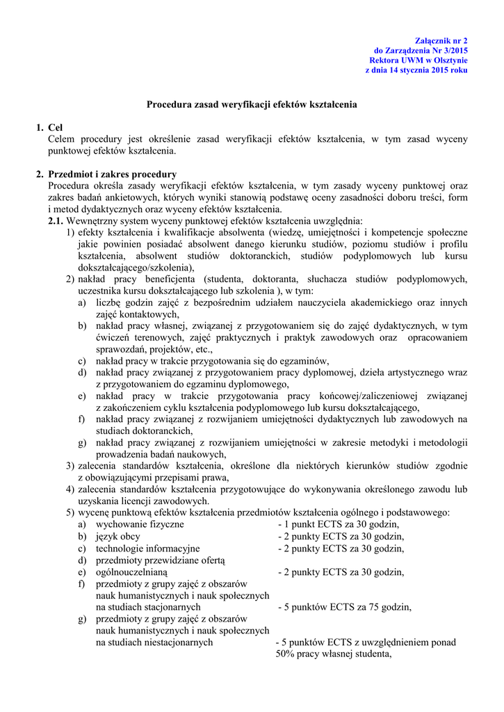 Załącznik nr 2 do Zarządzenia Nr 3/2015 Rektora UWM w Olsztynie z dnia 14 stycznia 2015 roku Procedura zasad weryfikacji efektów kształcenia 1. Cel Celem procedury jest określenie zasad weryfikacji efektów kształcenia, w tym zasad wyceny punktowej efektów kształcenia. 2. Przedmiot i zakres procedury Procedura określa zasady weryfikacji efektów kształcenia, w tym zasady wyceny punktowej oraz zakres badań ankietowych, których wyniki stanowią podstawę oceny zasadności doboru treści, form i metod dydaktycznych oraz wyceny efektów kształcenia. 2.1. Wewnętrzny system wyceny punktowej efektów kształcenia uwzględnia: 1) efekty kształcenia i kwalifikacje absolwenta (wiedzę, umiejętności i kompetencje społeczne jakie powinien posiadać absolwent danego kierunku studiów, poziomu studiów i profilu kształcenia, absolwent studiów doktoranckich, studiów podyplomowych lub kursu dokształcającego/szkolenia), 2) nakład pracy beneficjenta (studenta, doktoranta, słuchacza studiów podyplomowych, uczestnika kursu dokształcającego lub szkolenia ), w tym: a) liczbę godzin zajęć z bezpośrednim udziałem nauczyciela akademickiego oraz innych zajęć kontaktowych, b) nakład pracy własnej, związanej z przygotowaniem się do zajęć dydaktycznych, w tym ćwiczeń terenowych, zajęć praktycznych i praktyk zawodowych oraz opracowaniem sprawozdań, projektów, etc., c) nakład pracy w trakcie przygotowania się do egzaminów, d) nakład pracy związanej z przygotowaniem pracy dyplomowej, dzieła artystycznego wraz z przygotowaniem do egzaminu dyplomowego, e) nakład pracy w trakcie przygotowania pracy końcowej/zaliczeniowej związanej z zakończeniem cyklu kształcenia podyplomowego lub kursu dokształcającego, f) nakład pracy związanej z rozwijaniem umiejętności dydaktycznych lub zawodowych na studiach doktoranckich, g) nakład pracy związanej z rozwijaniem umiejętności w zakresie metodyki i metodologii prowadzenia badań naukowych, 3) zalecenia standardów kształcenia, określone dla niektórych kierunków studiów zgodnie z obowiązującymi przepisami prawa, 4) zalecenia standardów kształcenia przygotowujące do wykonywania określonego zawodu lub uzyskania licencji zawodowych. 5) wycenę punktową efektów kształcenia przedmiotów kształcenia ogólnego i podstawowego: a) wychowanie fizyczne - 1 punkt ECTS za 30 godzin, b) język obcy - 2 punkty ECTS za 30 godzin, c) technologie informacyjne - 2 punkty ECTS za 30 godzin, d) przedmioty przewidziane ofertą e) ogólnouczelnianą - 2 punkty ECTS za 30 godzin, f) przedmioty z grupy zajęć z obszarów nauk humanistycznych i nauk społecznych na studiach stacjonarnych - 5 punktów ECTS za 75 godzin, g) przedmioty z grupy zajęć z obszarów nauk humanistycznych i nauk społecznych na studiach niestacjonarnych - 5 punktów ECTS z uwzględnieniem ponad 50% pracy własnej studenta, h) przedmioty realizowane w ramach „kształcenia modułowego” przewidziane ofertą wydziałową - 2 punkty ECTS za 30 godzin, i) ergonomia, ochrona własności intelektualnej - 0,25 punktu ECTS za 2 godziny, j) etykieta, szkolenie w zakresie bezpieczeństwa i higieny pracy, informacja patentowa – 0,5 punktu ECTS za 4 godziny. 6) wycenę punktową efektów kształcenia związaną z przygotowaniem i wykonaniem pracy dyplomowej oraz przygotowaniem do egzaminu dyplomowego: a) praca licencjacka - 10 punktów ECTS, b) praca inżynierska - 15 punktów ECTS, c) praca magisterska - 20 punktów ECTS, d) dzieło artystyczne w zakresie sztuki i dyscyplin artystycznych - 20 punktów ECTS, chyba, że standard kształcenia lub efekty kształcenia określone przez Senat w trybie art. 11 ust. 1 ustawy – Prawo o szkolnictwie wyższym, stanowią inaczej. 2.2. Weryfikację efektów kształcenia przeprowadza się na podstawie sprawdzających prac pisemnych, prac projektowych, publikacji, sprawozdań, jak też innych form sprawdzania i potwierdzania nabytej wiedzy oraz uzyskanych umiejętności i kompetencji, m.in.: egzaminów ustnych, ocen aktywności na zajęciach dydaktycznych, etc., 2.3. Proces weryfikacji efektów kształcenia musi umożliwiać dokonywanie bieżącej (w trakcie semestru) oceny osiągania efektów kształcenia związanych z danym przedmiotem/modułem zajęć; podstawą tej oceny są wyniki cząstkowych zaliczeń (etapów) przedmiotów/modułów zajęć z uwzględnieniem ich procentowego udziału lub wagi w ocenie końcowej, 2.4. Analiza wyników weryfikacji stanowi podstawę do oceny trafności i skuteczności (efektywności) stosowanych form i metod dydaktycznych oraz zakresu wymagań stawianych beneficjentom procesu dydaktycznego, określanych w kryteriach cząstkowych i progach zaliczalności poszczególnych etapów zaliczania przedmiotu/modułu zajęć. 2.4.1. W analizie efektywności stosowanych form i metod dydaktycznych wykorzystuje się wyniki ogólnouczelnianych badań: a) jakości zajęć dydaktycznych w zakresie oceny form i metod nauczania, b) losów zawodowych absolwentów w zakresie oceny pracy własnej beneficjenta w procesie osiągania efektów kształcenia i jej roli w dalszym samokształceniu, c) opinii pracodawców w zakresie oceny zasadności i skuteczności stosowanych form zajęć w realizacji danego przedmiotu/modułu zajęć, gwarantujących lub sprzyjających nabyciu umiejętności i kompetencji niezbędnych do wykonywania pracy, np. umiejętności praktycznych. 2.5. Inne źródło wiedzy mogą stanowić wyniki badań ankietowych, prowadzonych w danej jednostce na podstawie własnych ankiet, np. ankiet autoewaluacyjnych, ankiet do weryfikacji efektów kierunkowych, ankiet do weryfikacji efektów przedmiotowych, etc. 2. Uprawnienia, kompetencje i odpowiedzialność organów kolegialnych zarządzających i administrujących procesem dydaktycznym: 1) Senat uczelni uprawniony jest do: a) ustalania priorytetowych działań w zakresie polityki jakości kształcenia, b) ustalania wytycznych do tworzenia progra