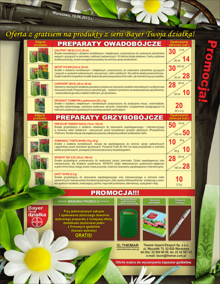 Warszaw a , 19.06.2 013 r. Oferta z gratisem na produkty z serii Bayer Twoja działka! PREPARATY OWADOBÓJCZE CALYPSO® 480 SC (2 ml, 20 ml) Środek owadobójczy o działaniu kontaktowym i żołądkowym, przeznaczony do zwalczania szkodników ssących i gryzących w ziemniaku i roślinach sadowniczych. W roślinie działa układowo. Cechy użytkowe środka powodują, że jest szczególnie przydatny do ochrony upraw amatorskich. 30 DECIS® 015 EW (2x5 ml, 30 ml) Środek o działaniu kontaktowym i żołądkowym, przeznaczony do zwalczania szkodników gryzących i ssących w uprawach sadowniczych, warzywnych, roślin ozdobnych. Na roślinie działa powierzchniowo. Dzięki maleńkim kropelkom środek doskonale pokrywa powierzchnie roślin, jak również korpusy owadów. 30 ® CONFIDOR 200 SL (20 ml, 50 ml) Odmienny mechanizm działania pozwala na skuteczne niszczenie owadów niewrażliwych na dotychczas stosowane środki.Preparat niszczy szkodniki gdy: - zostanie naniesiony na owada podczas opryskiwania, - owad pobierze go wraz z sokiem roślinnym, po opryskaniu. Zdjęcie produktu Opakowanie zbiorcze (szt.) 2 ml 20 ml 2x5 ml 30 ml 28 14 28 20 ml 50 ml 10 PROVADO® COMBI PIN z aplikatorem (20 x 2 g) Środek o działaniu żołądkowym i kontaktowym przeznaczony do zwalczania mszyc, wciornastków, mączlika szklarniowego, czerwców (wełnowce, tarczniki, miseczniki) i przędziorków występujących na roślinach ozdobnych uprawianych w pomieszczeniach zamkniętych. 20 x 2 g PREPARATY GRZYBOBÓJCZE Opakowanie zbiorcze (szt.) 20 PREVICUR® ENERGY 840 SL (15 ml, 100 ml) Środek grzybobójczy o działaniu układowym do stosowania zapobiegawczego i interwencyjnego w ochronie roślin ozdobnych i warzywnych przed kompleksem grzybów glebowych (Phytophthora i Pythium). Środek stosuje się doglebowo poprzez odkażanie podłoża i podlewanie roślin. 50 POMARSOL® FORTE 80 WG (10 g, 45 g) Środek o działaniu kontaktowym, stosuje się zapobiegawczo do ochrony upraw sadowniczych i jagodników przed chorobami grzybowymi. Pomarsol Forte 80 WG ma dużą przydatność w ochronie sadów przydomowych, począwszy od wczesnej wiosny do późnej jesieni. 10 INFINITO® 687,5 SC (25 ml, 100 ml) Środek grzybobójczy przeznaczony do zwalczania zarazy ziemniaka. Działa zapobiegawczo oraz interwencyjnie. Ma działanie systemiczne. INFINITO dzięki właściwościom systemiczno-wgłębnym w pełni chroni liście, łodygi, bulwy i nowe przyrosty; może być stosowany zapobiegawczo i interwencyjnie. 28 15 ml 100 ml 50 10 g 45 g 10 25 ml 100 ml 28 ® ZATO 50 WG (2,5 g) Środek grzybobójczy do stosowania zapobiegawczego oraz interwencyjnego w ochronie roślin sadowniczych i warzyw przed chorobami grzybowymi. Zato zawiera trifloksystrobinę - substancję o szerokim spektrum działania, zwalczającą: parcha, mączniaki prawdziwe, alternariozę, szarą pleśń i rdzę. 10 2,5 g PROMOCJA!!! >>>>> WARUNKI PROMOCJI <<<<< Antypoślizgowa podkładka pod telefon komórkowy Tacka na pieniądze Długopis firmowy Przy jednorazowym zakupie 1 opakowania zbiorczego dowolnie wybranego preparatu z niniejszej oferty, dodatkowo dostaniesz jeden z firmowych gadżetów (losowo wybrany) GRATIS! www.themar.com.pl Themar Import-Eksport Sp. z o.o. ul. Wyczółki 75, 02-820 Warszawa tel./fax: 22 894 60 00, tel. 22 42 567 43 e-mail: [email protected] Oferta ważna do wyczerpania zapasów gadżetów. Prom o c j a ! Zdjęcie produktu