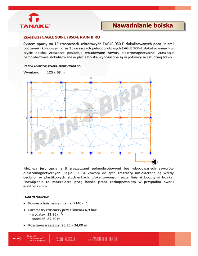 Nawadnianie boiska ZRASZACZE EAGLE 900-E I 950-E RAIN BIRD System oparty na 12 zraszaczach sektorowych EAGLE 950-E zlokalizowanych poza liniami bocznymi i końcowymi oraz 3 zraszaczach pełnoobrotowych EAGLE 900-E zlokalizowanych w płycie boiska. Zraszacze posiadają wbudowane zawory elektromagnetyczne. Zraszacze pełnoobrotowe zlokalizowane w płycie boiska wyposażone są w pokrywy ze sztucznej trawy. PRZYKŁAD ROZWIĄZANIA PROJEKTOWEGO Wymiary: 105 x 68 m Możliwa jest opcja z 3 zraszaczami pełnoobrotowymi bez wbudowanych zaworów elektromagnetycznych (Eagle 900-S). Zawory do tych zraszaczy umieszczane są wtedy osobno, w plastikowych studzienkach, zlokalizowanych poza liniami bocznymi boiska. Rozwiązanie to zabezpiecza płytę boiska przed rozkopywaniem w przypadku awarii elektrozaworu. DANE TECHNICZNE • Powierzchnia nawadniania: 7140 m² • Parametry zraszaczy przy ciśnieniu 6,9 bar: - wydatek: 11,86 m3/h - promień: 27,70 m • Rozstawa zraszaczy: 26,25 x 34,00 m TANAKE ul. Puławska 426 02-884 Warszawa tel. (22) 336 90 40 fax (22) 336 90 49 nts@ ta nake .com .pl w w w. n t s . t a n a k e . c o m . p l • Liczba sekcji nawadniających : - 4 sekcje x 1 zraszacz Eagle 950-E 900 - 8 sekcji x 1 zraszacz Eagle 950-E 1800 - 3 sekcje x 1 zraszacz Eagle 900-E 3600 Razem: 15 sekcji • Wymagane parametry źródła wody: Wydatek: 12 m3/h Ciśnienie : 7,5 bar PRZYKŁADOWE ZUŻYCIE WODY I CZAS TRWANIA NAWADNIANIA Zraszacz 900 – 6 min. x 4 szt. = 24 min. Zraszacz 1800 – 12 min. x 8 szt. = 96 min. Zraszacz 3600 – 24 min. x 3 szt. = 72 min. Razem: 192 min. (3 h 12 min.) Całkowity czas nawadniania 3 h 12 min. Zużycie wody 38 m3 Dawka polewowa 5,3 mm PRZYKŁAD ZASTOSOWANIA Stadion Borussii Dortmund – SIGNAL IDUNA PARK 12 zraszaczy EAGLE 950-E TANAKE ul. Puławska 426 02-884 Warszawa 3 zraszacze EAGLE 900-E z pokrywą ze sztucznej trawy tel. (22) 336 90 40 fax (22) 336 90 49 nts@ ta nake .com .pl w w w. n t s . t a n a k e . c o m . p l