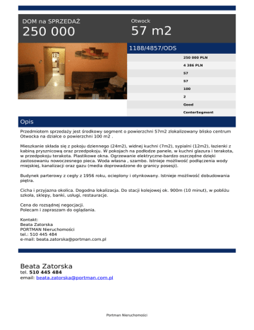 Otwock DOM na SPRZEDAŻ 57 m2 250 000 1188/4857/ODS 250 000 PLN 4 386 PLN 57 57 100 2 Good CenterSegment Opis Przedmiotem sprzedaży jest środkowy segment o powierzchni 57m2 zlokalizowany blisko centrum Otwocka na działce o powierzchni 100 m2 . Mieszkanie składa się z pokoju dziennego (24m2), widnej kuchni (7m2), sypialni (12m2), łazienki z kabiną prysznicową oraz przedpokoju. W pokojach na podłodze panele, w kuchni glazura i terakota, w przedpokoju terakota. Plastikowe okna. Ogrzewanie elektryczne-bardzo oszczędne dzięki zastosowaniu nowoczesnego pieca. Woda własna , szambo. Istnieje możliwość podłączenia wody miejskiej, kanalizacji oraz gazu (media doprowadzone do granicy posesji). Budynek parterowy z cegły z 1956 roku, ocieplony i otynkowany. Istnieje możliwość dobudowania piętra. Cicha i przyjazna okolica. Dogodna lokalizacja. Do stacji kolejowej ok. 900m (10 minut), w pobliżu szkoła, sklepy, banki, usługi, restauracje. Cena do rozsądnej negocjacji. Polecam i zapraszam do oglądania. Kontakt: Beata Zatorska PORTMAN Nieruchomości tel.: 510 445 484 e-mail: [email protected] Beata Zatorska tel. 510 445 484 email: [email protected] Portman Nieruchomości Powered by TCPDF (www.tcpdf.org)