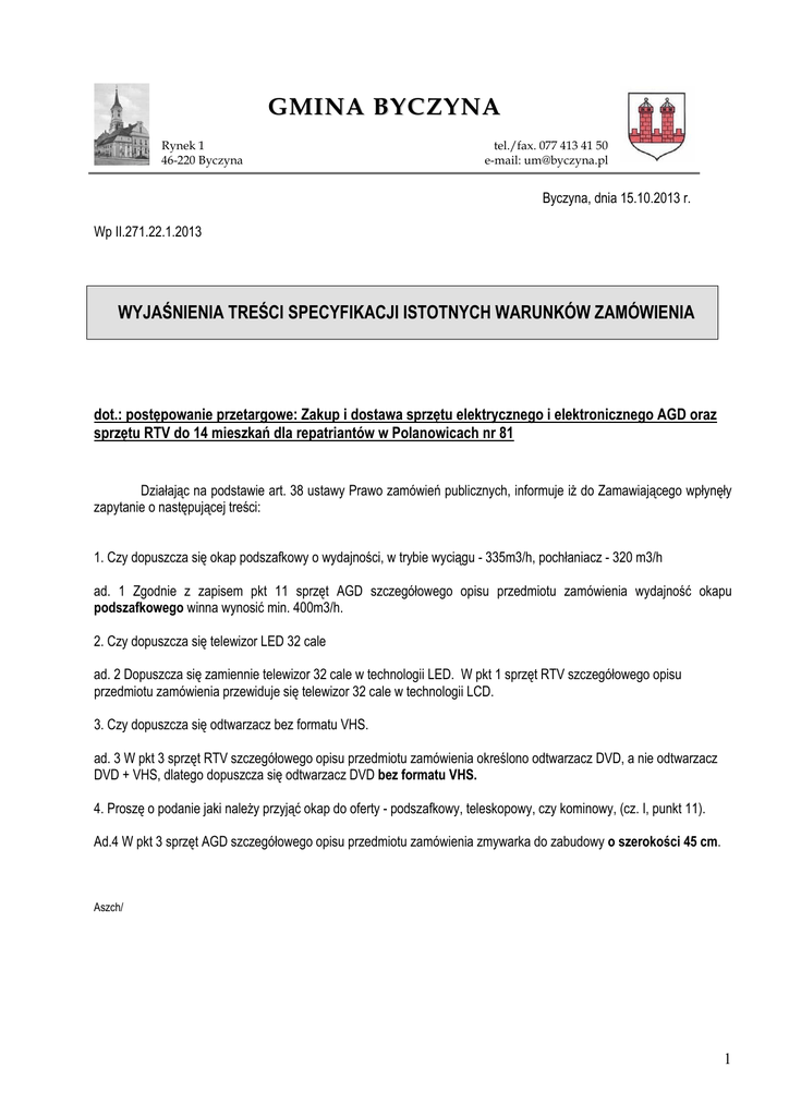 GMINA BYCZYNA Rynek 1 46-220 Byczyna tel./fax. 077 413 41 50 e-mail: [email protected] Byczyna, dnia 15.10.2013 r. Wp II.271.22.1.2013 WYJAŚNIENIA TREŚCI SPECYFIKACJI ISTOTNYCH WARUNKÓW ZAMÓWIENIA dot.: postępowanie przetargowe: Zakup i dostawa sprzętu elektrycznego i elektronicznego AGD oraz sprzętu RTV do 14 mieszkań dla repatriantów w Polanowicach nr 81 Działając na podstawie art. 38 ustawy Prawo zamówień publicznych, informuje iŜ do Zamawiającego wpłynęły zapytanie o następującej treści: 1. Czy dopuszcza się okap podszafkowy o wydajności, w trybie wyciągu - 335m3/h, pochłaniacz - 320 m3/h ad. 1 Zgodnie z zapisem pkt 11 sprzęt AGD szczegółowego opisu przedmiotu zamówienia wydajność okapu podszafkowego winna wynosić min. 400m3/h. 2. Czy dopuszcza się telewizor LED 32 cale ad. 2 Dopuszcza się zamiennie telewizor 32 cale w technologii LED. W pkt 1 sprzęt RTV szczegółowego opisu przedmiotu zamówienia przewiduje się telewizor 32 cale w technologii LCD. 3. Czy dopuszcza się odtwarzacz bez formatu VHS. ad. 3 W pkt 3 sprzęt RTV szczegółowego opisu przedmiotu zamówienia określono odtwarzacz DVD, a nie odtwarzacz DVD + VHS, dlatego dopuszcza się odtwarzacz DVD bez formatu VHS. 4. Proszę o podanie jaki naleŜy przyjąć okap do oferty - podszafkowy, teleskopowy, czy kominowy, (cz. I, punkt 11). Ad.4 W pkt 3 sprzęt AGD szczegółowego opisu przedmiotu zamówienia zmywarka do zabudowy o szerokości 45 cm. Aszch/ 1
