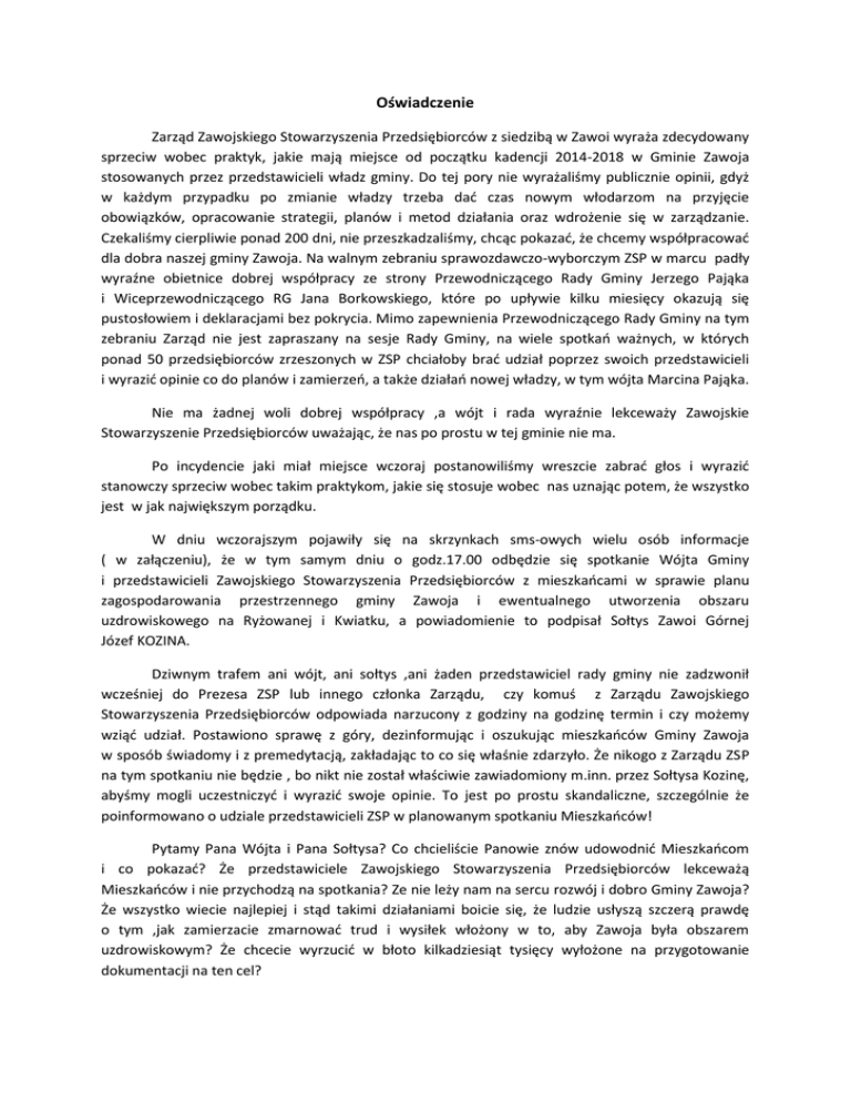 Oświadczenie Zarząd Zawojskiego Stowarzyszenia Przedsiębiorców z siedzibą w Zawoi wyraża zdecydowany sprzeciw wobec praktyk, jakie mają miejsce od początku kadencji 2014-2018 w Gminie Zawoja stosowanych przez przedstawicieli władz gminy. Do tej pory nie wyrażaliśmy publicznie opinii, gdyż w każdym przypadku po zmianie władzy trzeba dać czas nowym włodarzom na przyjęcie obowiązków, opracowanie strategii, planów i metod działania oraz wdrożenie się w zarządzanie. Czekaliśmy cierpliwie ponad 200 dni, nie przeszkadzaliśmy, chcąc pokazać, że chcemy współpracować dla dobra naszej gminy Zawoja. Na walnym zebraniu sprawozdawczo-wyborczym ZSP w marcu padły wyraźne obietnice dobrej współpracy ze strony Przewodniczącego Rady Gminy Jerzego Pająka i Wiceprzewodniczącego RG Jana Borkowskiego, które po upływie kilku miesięcy okazują się pustosłowiem i deklaracjami bez pokrycia. Mimo zapewnienia Przewodniczącego Rady Gminy na tym zebraniu Zarząd nie jest zapraszany na sesje Rady Gminy, na wiele spotkań ważnych, w których ponad 50 przedsiębiorców zrzeszonych w ZSP chciałoby brać udział poprzez swoich przedstawicieli i wyrazić opinie co do planów i zamierzeń, a także działań nowej władzy, w tym wójta Marcina Pająka. Nie ma żadnej woli dobrej współpracy ,a wójt i rada wyraźnie lekceważy Zawojskie Stowarzyszenie Przedsiębiorców uważając, że nas po prostu w tej gminie nie ma. Po incydencie jaki miał miejsce wczoraj postanowiliśmy wreszcie zabrać głos i wyrazić stanowczy sprzeciw wobec takim praktykom, jakie się stosuje wobec nas uznając potem, że wszystko jest w jak największym porządku. W dniu wczorajszym pojawiły się na skrzynkach sms-owych wielu osób informacje ( w załączeniu), że w tym samym dniu o godz.17.00 odbędzie się spotkanie Wójta Gminy i przedstawicieli Zawojskiego Stowarzyszenia Przedsiębiorców z mieszkańcami w sprawie planu zagospodarowania przestrzennego gminy Zawoja i ewentualnego utworzenia obszaru uzdrowiskowego na Ryżowanej i Kwiatku, a powiadomienie to podpisał Sołtys Zawoi Górnej Józef KOZINA. Dziwnym trafem ani wójt, ani sołtys ,ani żaden przedstawiciel rady gminy nie zadzwonił wcześniej do Prezesa ZSP lub innego członka Zarządu, czy komuś z Zarządu Zawojskiego Stowarzyszenia Przedsiębiorców odpowiada narzucony z godziny na godzinę termin i czy możemy wziąć udział. Postawiono sprawę z góry, dezinformując i oszukując mieszkańców Gminy Zawoja w sposób świadomy i z premedytacją, zakładając to co się właśnie zdarzyło. Że nikogo z Zarządu ZSP na tym spotkaniu nie będzie , bo nikt nie został właściwie zawiadomiony m.inn. przez Sołtysa Kozinę, abyśmy mogli uczestniczyć i wyrazić swoje opinie. To jest po prostu skandaliczne, szczególnie że poinformowano o udziale przedstawicieli ZSP w planowanym spotkaniu Mieszkańców! Pytamy Pana Wójta i Pana Sołtysa? Co chcieliście Panowie znów udowodnić Mieszkańcom i co pokazać? Że przedstawiciele Zawojskiego Stowarzyszenia Przedsiębiorców lekceważą Mieszkańców i nie przychodzą na spotkania? Ze nie leży nam na sercu rozwój i dobro Gminy Zawoja? Że wszystko wiecie najlepiej i stąd takimi działaniami boicie się, że ludzie usłyszą szczerą prawdę o tym ,jak zamierzacie zmarnować trud i wysiłek włożony w to, aby Zawoja była obszarem uzdrowiskowym? Że chcecie wyrzucić w błoto kilkadziesiąt tysięcy wyłożone na przygotowanie dokumentacji na ten cel? Że w winy Wójta przepada ponad 600 000 zł dotacji z Narodowego Funduszu Ochrony Środowiska i Gospodarki Wodnej na odwiert badawczy, bo Wójtowi szkoda 15 000 zł na projekt badań geologicznych, ale nie szkoda wyłożonych tysięcy złotych na filmik promujący nie wiadomo co i kogo – z którego można się dowiedzieć od Pana Wójta Pająka , że w”.. gminie Zawoja hoduje się miód..”, z czego się już w całej Małopolsce śmieją! Że Wójt nie ma żadnego pomysłu na kontynuację budowy chodnika z kanalizacją na Policzne ,nawet do wyciągu Mosorny Groń i traci tym samym przyznaną i zapisaną w umowie dotację Marszałka Województwa na ten cel i rozwiązuje bardzo dobrą umowę z wykonawcą? Komu Panowie chcecie dokuczyć? Komu Panowie chcecie zrobić na złość? Komu ma służyć ta buta i arogancja, zarozumialstwo i pewność siebie? Sprawia wam to radość, że mogliście powiedzieć Mieszkańcom Górnej Zawoi, że nie przyszli przedstawiciele Zawojskiego Stowarzyszenia Przedsiębiorców, mimo” rzekomego powiadomienia”? Pytamy i żądamy publicznej odpowiedzi i podania dowodnie, w jaki sposób Pan Sołtys Kozina (reprezentujący także Pana Wójta, co wynika z powiadomienia), ustalił z Zarządem ZSP termin i datę spotkania oraz żeby przedstawił dowodnie, czy rozmawiał z kimkolwiek z Zarządu ZSP (jako organizator tego spotkania) o udziale kogoś z Zarządu w tym spotkaniu. Takie działania niczemu nie służą i są jedynie dowodem, że władza w gminie nie szanuje Przedsiębiorców (poza oczywiście wybranymi, o czym się można łatwo przekonać), a tym samym Mieszkańców! Zapomina Pan Wójt i Pan Sołtys, że żyją z podatków, których przedsiębiorcy z Zawoi Górnej do budżetu gminy Zawoja odprowadzają najwięcej w całej gminie, bo ponad 65%! Wyrażamy kategoryczny sprzeciw takim praktykom, które stają się nagminne, są na porządku dziennym i żądamy powtórzenia tego spotkania w uzgodnionym wspólnie terminie z właściwymi ogłoszeniami Sołtysa, także w Kościele Parafialnym w Zawoi Górnej i zorganizowanego w Szkole na Wilcznej albo Remizie OSP Zawoja Górna. Panie Wójcie i Panie Sołtysie! Na drodze przy domu pani Tosi ( z pełnym szacunkiem dla Niej) to sobie możemy porozmawiać o pogodzie i o tym, czy w tym roku będą grzyby! A nie o planie zagospodarowania przestrzennego Gminy Zawoja. Zrobiliście sobie kpiny z ludzi, ale widzimy, że wchodzić to zaczyna WAM w nawyk. W bardzo nied