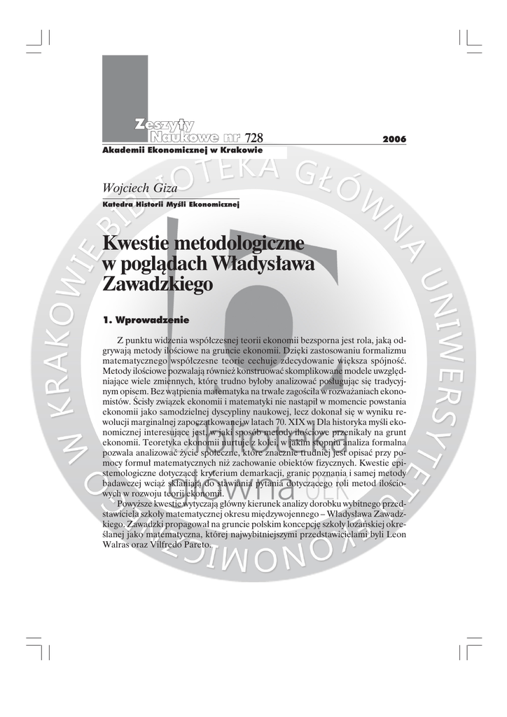 728 2006 Akademii Ekonomicznej w Krakowie Wojciech Giza Katedra Historii Myśli Ekonomicznej Kwestie metodologiczne w poglądach Władysława Zawadzkiego 1. Wprowadzenie Z punktu widzenia współczesnej teorii ekonomii bezsporna jest rola, jaką odgrywają metody ilościowe na gruncie ekonomii. Dzięki zastosowaniu formalizmu matematycznego współczesne teorie cechuje zdecydowanie większa spójność. Metody ilościowe pozwalają również konstruować skomplikowane modele uwzględniające wiele zmiennych, które trudno byłoby analizować posługując się tradycyjnym opisem. Bez wątpienia matematyka na trwałe zagościła w rozważaniach ekonomistów. Ścisły związek ekonomii i matematyki nie nastąpił w momencie powstania ekonomii jako samodzielnej dyscypliny naukowej, lecz dokonał się w wyniku rewolucji marginalnej zapoczątkowanej w latach 70. XIX w. Dla historyka myśli ekonomicznej interesujące jest, w jaki sposób metody ilościowe przenikały na grunt ekonomii. Teoretyka ekonomii nurtuje z kolei, w jakim stopniu analiza formalna pozwala analizować życie społeczne, które znacznie trudniej jest opisać przy pomocy formuł matematycznych niż zachowanie obiektów fizycznych. Kwestie epistemologiczne dotyczące: kryterium demarkacji, granic poznania i samej metody badawczej wciąż skłaniają do stawiania pytania dotyczącego roli metod ilościowych w rozwoju teorii ekonomii. Powyższe kwestie wytyczają główny kierunek analizy dorobku wybitnego przedstawiciela szkoły matematycznej okresu międzywojennego – Władysława Zawadzkiego. Zawadzki propagował na gruncie polskim koncepcję szkoły lozańskiej określanej jako matematyczna, której najwybitniejszymi przedstawicielami byli Leon Walras oraz Vilfredo Pareto. 138 Wojciech Giza 2. Obszary badawcze Władysława Zawadzkiego Władysław Zawadzki (1885–1939), mimo iż słusznie jest uznawany za przedstawiciela szkoły matematycznej, nie ograniczał się jedynie do analizy zagadnień równowagi ekonomicznej lansowanej przez szkołę lozańską. Zarówno jego biografia, jak i analiza prac naukowych dowodzą wszechstronności jego umysłu1. Zawadzki pochodził z Wileńszczyzny. Po ukończeniu w 1903 r. szkoły średniej udał się na studia matematyczno-fizyczne do Moskwy, a następnie do Lipska. Jednak jego zainteresowania sprawami społecznymi skłoniły go do zmiany kierunku studiów. W 1905 r. rozpoczął studia filozoficzno-humanistyczne na Uniwersytecie Jagiellońskim w Krakowie. Również w tym okresie brał czynny udział w wystąpieniach rewolucyjnych sympatyzując z PPS. Po stłumieniu przez władze carskie ruchów rewolucyjnych Zawadzki wyjechał do Paryża podejmując studia ekonomiczno-społeczne w Szkole Nauk Politycznych (1906–1909). Okres pobytu w Paryżu oraz Londynie, gdzie rozwijał swoje zainteresowania naukowe, jest kluczowy w jego biografii. Oprócz zagadnień związanych z polityką społeczną2 zapoznał się z dorobkiem szkoły lozańskiej, której poglądy będzie propagował w swoich kolejnych pracach. Również wówczas jego poglądy polityczne uległy ewolucji. Zawadzki odszedł od socjalizujących poglądów Georges’a Sorela i Wernera Sombarta na rzecz koncepcji konserwatywnych. Okres parysko-londyński kończy się w 1914 r. jego powrotem do kraju. Również w 1914 r. wydaje w Paryżu oraz Wilnie jedną ze swoich najważniejszych prac: Zastosowanie matematyki do ekonomii politycznej3. W 1917 r. Zawadzki rozpoczyna wykłady z ekonomii politycznej na Politechnice Warszawskiej, a w 1918 r. – w Wyższej Szkole Handlowej w Warszawie. W 1919 r. powołany zostaje na nowo utworzoną Katedrę Ekonomii Politycznej w Wilnie, gdzie wykłada do 1931 r. W tym okresie powstaje kolejna znacząca jego praca: Teoria produkcji4. Oprócz pracy naukowej czynnie angażuje się w życie polityczne, czego wyrazem jest powołanie go w latach 1928–1929 na kierownika i doradcę biura ekonomicznego przy klubie posłów konserwatywnych w Sejmie. W latach 1932–1935 piastuje stanowisko ministra skarbu. Od 1936 r. aż do śmierci zatrudniony jest jako profesor Szkoły Głównej Handlowej w Warszawie, gdzie prowadzi wykłady z teorii ekonomii i teorii pieniądza. Aleksy Wakar omawiając koncepcje Zawadzkiego wyróżnił następujące zagadnienia: 1 Prace pozwalające lepiej poznać sylwetkę Władysława Zawadzkiego to: memoriał Konstantego Krzeczkowskiego, Ś.p. Władysław Zawadzki, „Ekonomista” 1939, nr 1, s. 3–7, oraz artykuł Aleksego Wakara, Prace ekonomiczne Władysława Zawadzkiego, „Ekonomista” 1939, nr 1, s. 30–49. Wakar załączył do swojego artykułu bibliografię prac Zawadzkiego. 2 Zawadzki, kończąc w 1909 r. Szkołę Nauk Politycznych, przedstawił pracę z zakresu polityki społecznej Sociétés coopératives de vente przyjętą przez profesora Emila Cheyssona. 3 Zob. W. Zawadzki, Zastosowanie matematyki do ekonomii politycznej, Nakładem J. Zawadzkiego, Wilno 1914. Francuskie wydanie tej pracy: Les mathématiques appliqués á l’économie politique, Bibliotéque Genérale d’Economie Politique, M. Riviére, Paris 1914. 4 Zob. W. Zawadzki, Teoria produkcji, Biblioteka Wyższej Szkoły Handlowej w Warszawie, Warszawa 1923. Kwestie metodologiczne w poglądach Władysława Zawadzkiego 139 – teoria równowagi ekonomicznej, której Zawadzki poświęcił wspomnianą już pracę: Zastosowanie matematyki do ekonomii oraz artykuł: Pojęcie równowagi ekonomicznej i jego naukowe znaczenie5; – dwie koncepcje równowagi ekonomicznej, stanowiące rozwinięcie jego stanowiska metodologicznego6; – teoria produkcji, w której autor problem równowagi rozpatruje w związku z podłożem życia gospodarczego, na którym dane zjawiska występują. Zagadnieniom tym poświęcił książkę: Teoria produkcji opublikowaną w 1923 r. oraz artykuł: O teorii produkcji7; – polityka społeczna, analizowana głównie w pracy: Postulaty ochrony robotnika a konkretne warunki gospodarcze8 oraz w