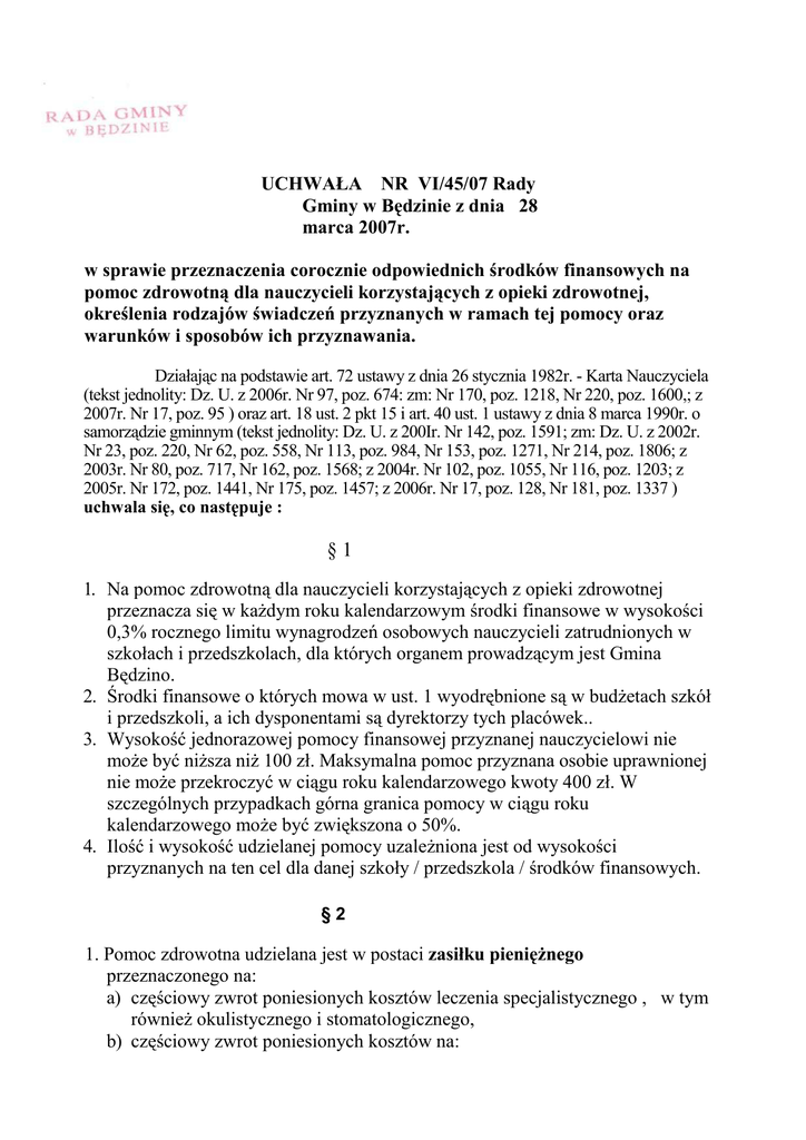 UCHWAŁA NR VI/45/07 Rady Gminy w Będzinie z dnia 28 marca 2007r. w sprawie przeznaczenia corocznie odpowiednich środków finansowych na pomoc zdrowotną dla nauczycieli korzystających z opieki zdrowotnej, określenia rodzajów świadczeń przyznanych w ramach tej pomocy oraz warunków i sposobów ich przyznawania. Działając na podstawie art. 72 ustawy z dnia 26 stycznia 1982r. - Karta Nauczyciela (tekst jednolity: Dz. U. z 2006r. Nr 97, poz. 674: zm: Nr 170, poz. 1218, Nr 220, poz. 1600,; z 2007r. Nr 17, poz. 95 ) oraz art. 18 ust. 2 pkt 15 i art. 40 ust. 1 ustawy z dnia 8 marca 1990r. o samorządzie gminnym (tekst jednolity: Dz. U. z 200Ir. Nr 142, poz. 1591; zm: Dz. U. z 2002r. Nr 23, poz. 220, Nr 62, poz. 558, Nr 113, poz. 984, Nr 153, poz. 1271, Nr 214, poz. 1806; z 2003r. Nr 80, poz. 717, Nr 162, poz. 1568; z 2004r. Nr 102, poz. 1055, Nr 116, poz. 1203; z 2005r. Nr 172, poz. 1441, Nr 175, poz. 1457; z 2006r. Nr 17, poz. 128, Nr 181, poz. 1337 ) uchwala się, co następuje : §1 1. Na pomoc zdrowotną dla nauczycieli korzystających z opieki zdrowotnej przeznacza się w kaŜdym roku kalendarzowym środki finansowe w wysokości 0,3% rocznego limitu wynagrodzeń osobowych nauczycieli zatrudnionych w szkołach i przedszkolach, dla których organem prowadzącym jest Gmina Będzino. 2. Środki finansowe o których mowa w ust. 1 wyodrębnione są w budŜetach szkół i przedszkoli, a ich dysponentami są dyrektorzy tych placówek.. 3. Wysokość jednorazowej pomocy finansowej przyznanej nauczycielowi nie moŜe być niŜsza niŜ 100 zł. Maksymalna pomoc przyznana osobie uprawnionej nie moŜe przekroczyć w ciągu roku kalendarzowego kwoty 400 zł. W szczególnych przypadkach górna granica pomocy w ciągu roku kalendarzowego moŜe być zwiększona o 50%. 4. Ilość i wysokość udzielanej pomocy uzaleŜniona jest od wysokości przyznanych na ten cel dla danej szkoły / przedszkola / środków finansowych. §2 1. Pomoc zdrowotna udzielana jest w postaci zasiłku pienięŜnego przeznaczonego na: a) częściowy zwrot poniesionych kosztów leczenia specjalistycznego , w tym równieŜ okulistycznego i stomatologicznego, b) częściowy zwrot poniesionych kosztów na: -2- zakup sprzętu rehabilitacyjnego nie podlegającego zwrotowi z NFZ, - zakup okularów jednak nie więcej niŜ 50% wartości ich zakupu i nie częściej niŜ co 2 lata, - zakup protetyki stomatologicznej jednak nie więcej niŜ 50% wartości jej zakupu, c) częściowy zwrot poniesionych kosztów na zakup leków związanych z leczeniem specjalistycznym, d) częściowy zwrot poniesionych kosztów związanych z długotrwałym leczeniem chorób przewlekłych , a w szczególności związanych z wykonywanym zawodem. §3 1. Warunkiem otrzymania przez nauczyciela pomocy zdrowotnej o której mowa w § 1 jest: 1) zatrudnienie na stanowisku nauczyciela w danej szkole ( przedszkolu ) w wymiarze co najmniej Vi obowiązkowego wymiaru zajęć lub posiadanie statusu nauczyciela emeryta ( rencisty ) danej szkoły ( przedszkola ), 2) konieczność korzystania z lekarskiej pomocy specjalistycznej, długotrwała lub przewlekła choroba oraz ponoszenie wysokich kosztów związanych z jej leczeniem, 3) trudna sytuacja Ŝyciowa, rodzinna i materialna nauczyciela wnioskującego o pomoc, 4) złoŜenie wniosku w sprawie udzielenia pomocy zdrowotnej przez uprawnionego nauczyciela lub inicjatora o którym mowa w § 5 wg wzoru stanowiącego załącznik nr 1 do niniejszej uchwały, 5) dołączenie do wniosku o którym mowa w pkt 4: - zaświadczenia potwierdzającego leczenie od lekarza pierwszego kontaktu lub lekarza specjalisty , - kserokopii imiennych rachunków / faktur / potwierdzających poniesienie kosztów o których mowa w § 2 niniejszej uchwały, - oświadczenia o sytuacji materialnej rodziny wraz z wyliczoną wysokością dochodu przypadającą na jednego członka rodziny - załącznik nr 2 do niniejszej uchwały. 2. Za szczególne przypadki o których mowa w § 1 ust. 3 uwaŜa się: 1) nagły znaczny wzrost kosztów leczenia w stosunku do dochodów na członka rodziny, 2) nagłe zdarzenie losowe powodujące wzrost kosztów leczenia, 3) konieczność zakupu leków ratujących Ŝycie lub zapobiegających kalectwu nie objętych refundacją z NFZ, 4) konieczność zakupu drogiego sprzętu rehabilitacyjnego nie podlegającego refundacji z NFZ. -3§4 1. Wniosek wraz z załącznikami o pomoc zdrowotną zainteresowany nauczyciel składa w swojej macierzystej szkole (przedszkolu ). 2. Decyzję o przyznaniu pomocy podejmuje dyrektor szkoły ( przedszkola ), po konsultacjach z przedstawicielami związków zawodowych działających na terenie danej szkoły ( przedszkola ), z zastrzeŜeniem § 6. 3. Dyrektor szkoły ( przedszkola ) moŜe powołać w swojej placówce Komisję ds. rozpatrywania wniosków o przyznanie pomocy zdrowotnej, jako ciało opiniotwórcze. W takim przypadku komisja dokonuje oceny kosztów poniesionych na leczenie, rehabilitację itp. w oparciu o załączone do wniosków zaświadczenia, rachunki lub inne dokumenty oraz ustala relacje między poniesionymi kosztami na leczenie a dochodem na członka rodziny, proponuje podjęcie decyzji o przyjęciu wniosku lub jego odrzuceniu, proponuje wysokość pomocy zdrowotnej dla wnioskodawcy. Z kaŜdego posiedzenia komisja sporządza protokół, w którym wyszczególnia : - ilość złoŜonych wniosków, nazwiska i imiona nauczycieli, którym proponuje przyznanie pomocy, proponowaną wysokość zasiłków pienięŜnych dla tych nauczycieli. 4. Wnioski o pomoc zdrowotną rozpatrywane są co najmniej raz na kwartał, a w przypadkach szczególnych o których mowa w § 3 ust. 2 pkt 2 w terminie do 14 dni od daty złoŜenia wniosku. 5. O przyznaniu lub nie przyznaniu pomocy zdrowotnej , wysokości tej pomocy oraz terminie jej wypłaty - dyrektor informuje wnioskodawcę w formie pisemnej. §5 1. Z inicjatywą w sprawie udzielenia pomocy zdrowotnej nauczycielowi wystąpić mogą równieŜ przełoŜeni 