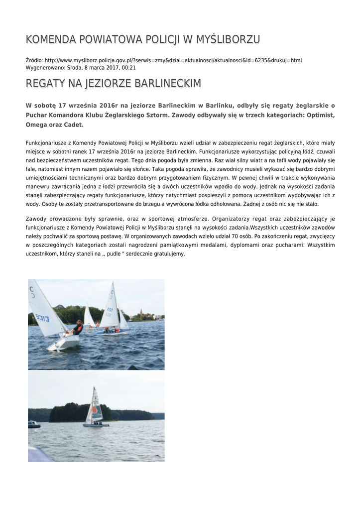 KOMENDA POWIATOWA POLICJI W MYŚLIBORZU Źródło: http://www.mysliborz.policja.gov.pl/?serwis=zmy&dzial=aktualnosci/aktualnosci&id=6235&drukuj=html Wygenerowano: Środa, 8 marca 2017, 00:21 REGATY NA JEZIORZE BARLINECKIM W sobotę 17 września 2016r na jeziorze Barlineckim w Barlinku, odbyły się regaty żeglarskie o Puchar Komandora Klubu Żeglarskiego Sztorm. Zawody odbywały się w trzech kategoriach: Optimist, Omega oraz Cadet. Funkcjonariusze z Komendy Powiatowej Policji w Myśliborzu wzieli udział w zabezpieczeniu regat żeglarskich, które miały miejsce w sobotni ranek 17 września 2016r na jeziorze Barlineckim. Funkcjonariusze wykorzystując policyjną łódź, czuwali nad bezpieczeństwem uczestników regat. Tego dnia pogoda była zmienna. Raz wiał silny wiatr a na tafli wody pojawiały się fale, natomiast innym razem pojawiało się słońce. Taka pogoda sprawiła, że zawodnicy musieli wykazać się bardzo dobrymi umiejętnościami technicznymi oraz bardzo dobrym przygotowaniem fizycznym. W pewnej chwili w trakcie wykonywania manewru zawracania jedna z łodzi przewróciła się a dwóch uczestników wpadło do wody. Jednak na wysokości zadania stanęli zabezpieczający regaty funkcjonariusze, którzy natychmiast pospieszyli z pomocą uczestnikom wydobywając ich z wody. Osoby te zostały przetransportowane do brzegu a wywrócona łódka odholowana. Żadnej z osób nic się nie stało. Zawody prowadzone były sprawnie, oraz w sportowej atmosferze. Organizatorzy regat oraz zabezpieczający je funkcjonariusze z Komendy Powiatowej Policji w Myśliborzu stanęli na wysokości zadania.Wszystkich uczestników zawodów należy pochwalić za sportową postawę. W organizowanych zawodach wzieło udział 70 osób. Po zakończeniu regat, zwycięzcy w poszczególnych kategoriach zostali nagrodzeni pamiątkowymi medalami, dyplomami oraz pucharami. Wszystkim uczestnikom, którzy staneli na ,, pudle " serdecznie gratulujemy. asp. Jacek Poleszczuk Ocena: 0/5 (0) Tweetnij