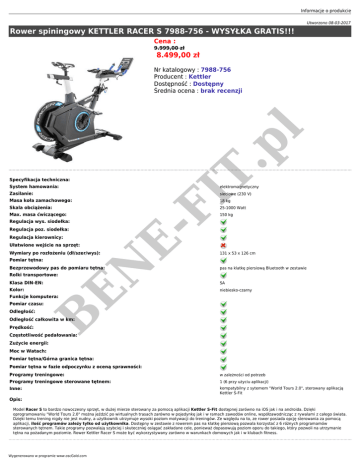 Informacje o produkcie Utworzono 08-03-2017 Rower spiningowy KETTLER RACER S 7988-756 - WYSYŁKA GRATIS!!! Cena : 9.999,00 zł 8.499,00 zł Specyfikacja techniczna: System hamowania: Zasilanie: Masa koła zamachowego: Skala obciążenia: Max. masa ćwiczącego: Regulacja wys. siodełka: B EN E- Regulacja poz. siodełka: FI T .p l Nr katalogowy : 7988-756 Producent : Kettler Dostępność : Dostępny Średnia ocena : brak recenzji elektromagnetyczny sieciowe (230 V) 18 kg 25-1000 Watt 150 kg Regulacja kierownicy: Ułatwione wejście na sprzęt: Wymiary po rozłożeniu (dł/szer/wys): 131 x 53 x 126 cm Pomiar tętna: Bezprzewodowy pas do pomiaru tętna: pas na klatkę piersiową Bluetooth w zestawie Rolki transportowe: Klasa DIN-EN: SA Kolor: niebiesko-czarny Funkcje komputera: Pomiar czasu: Odległość: Odległość całkowita w km: Prędkość: Częstotliwość pedałowania: Zużycie energii: Moc w Watach: Pomiar tętna/Górna granica tętna: Pomiar tętna w fazie odpoczynku z oceną sprawności: Programy treningowe: w zależności od potrzeb Programy treningowe sterowane tętnem: 1 (6 przy użyciu aplikacji) Inne: kompatybilny z sytemem "World Tours 2.0", sterowany aplikacją Kettler S-Fit Opis: Model Racer S to bardzo nowoczesny sprzęt, w dużej mierze sterowany za pomocą aplikacji Kettler S-Fit dostępnej zarówno na iOS jak i na androida. Dzięki oprogramowaniu "World Tours 2.0" można jeździć po wirtualnych trasach zarówno w pojedynkę jak i w ramach zawodów online, współzawodnicząc z rywalami z całego świata. Dzięki temu trening nigdy nie jest nudny, a użytkownik utrzymuje wysoki poziom motywacji do treningów. Ze względu na to, ze rower posiada opcję sterowania za pomocą aplikacji, ilość programów zależy tylko od użytkownika. Dostępny w zestawie z rowerem pas na klatkę piersiową pozwala korzystać z 6 różnych programamów sterowanych tętnem. Takie programy pozwalają szybciej i skuteczniej osiągać zakładane cele, ponieważ dopasowują poziom oporu do takiego, który pozwoli na utrzymanie tętna na pożadanym poziomie. Rower Kettler Racer S może być wykorzystywany zarówno w warunkach domowych jak i w klubach fitness. Wygenerowano w programie www.oscGold.com