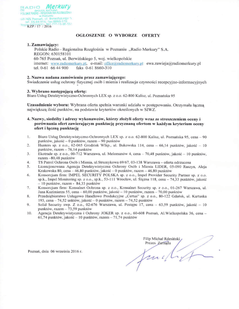 ) . : i. ] ..k l ],] /l;! l. ]]r,n ,Ęil".ł#ft l] ]i.j_,I lAli|,1i|L]li ,1] ij ji a'] ] ił i] ,l! l'!i,, t]\ | ] l,!]lii,,,1 r ],]kżii]]jii|ri]6: ],rl] , OGŁOSZENIE O WYBORŻf, OFERTY 1. zBmawiający: Polskie Radio Regionalna RozgłośniaW Pomaniu ..Radio Merkury" S,A. REGoN: 630158101 60-765 Poaan, ul, Belwińskiego 5, woj. łielkopo]skie intemet: wWW,radjomerkurv,Dl, e-mai1| officearradionerku.v,nl ęwa,zawieja@radiomerkury,pl 6644900 fak§ 0-6] 8660-310 tęl,0-61 \az*a tradana 7amó$ i€niu przez /amawiającego: Swiadczenie usług ochrony fizycznej osób i mienia i realiżacja czynności recepcyjno-infomacyjnych 2. 3. wybrano następującą ofertę: Bjxro Uslug Det€ktywisryczno_ochTonnyci LEx sp, Z o,o,62_800 Ka]isz, ul, Poznańska95 Uzasadrrienie wyboru: Wybrana oferta spełnia WaruŃi udziału \ł, postępowaniu. otrzymała łączrą najwięksżąilośćpunktów, na podstawie kryteriów okreśJonych w SIWż, złołliof€rty \łraz ze §tre§zczeniem oćenJ i p.zvznaną ofeńom w każdym kryteriUm oceny 4. Nazrły, §iedzib"Y i adre§y \łTkonawców, którzy porównania of€ń żawieraj:!cJm punktacj€ ołert i ląćzną punktAcję ], Biuro Usług Detektywistyczno,ochronnych LEx sp, z o,o, 62-800 Ka]isz, ul. Poaanska 95, cena _ 90 punktóW.jakość 0 punłtów, rażem 90punktów Hunters sp. z o,o,, 62 065 Grodzisk W]kp.. ul, Bnkou,ska 114, cena 66,]4 punktów, jakość- 10 iazem 76.]4 punłtóW Ekorrade §p, Z o,o,. 00-712 Warszawa, ul. Melomanów 4. cena punktów. 3, raz em 80,48 puDków Ts Palrol ochrona osób 5, 6, 8, 9- l0, Mienia, ui_Strumykowa 69/67. 03_138 Warszawa oferta odrzucona Licencjonowana Agencja Detektlvistyczna ockony osób i Mienia LIDER, 05_090 Raszyn, Aleja Krakowska 80, cena 46,80 puŃtó§,, jakość0 punktó\ł, razem 46,80 puŃtów Konsorcjun finn: IMPEL SECURITY POLSKĄ sp Z o,o,. Inpel Provider security Partner sp, z o,o. sp,k,,Impel Monitoring sp, ż o,o,, Sp,k,, 53_11l Wroclaw, ul, slęZna l l8, cena 74,]j punktow_jakość ] 1- i - 70.48 punktów. iakośćl0 punkó,W. 0 punktów. razem - 84.33 punków Konsorcjum finn: Konsahet ochrona sp, Z o,o,, Konsa]net Securiry §p, z o,o.,01_267 walszawa. ut_ Jana Kazimierza 55, cena 60,00 puŃtów,jakość l0punków razem 70,00 punktów Przedsiębiorst§,o UsIugowo Handlolvo Produkcyjne,,ceńus" sp, z o.o,,80-]22 Gdań§k, uL Kańuska 193. cena - 74.52 unków, jakość0 punktów, razem 74.52 punłtów solid Securiry swp, Z o,o., 02_ó76 Warszawa, ui, Po§tępu 17. cena 63.59 puŃtów, jakośćl0 prmktótł, raz enl 73,59 punktów Agencja DetektJwistyczna i ochron}, JOKER sp, z o,o,, 60-608 Poaań. Al,wielkopolska 36, cena ó1,74 pxnków,jakość - 10 punków, razem 7t,74 puŃtów Fi]ip Michał Rd€§ński Poznan. dnia 06 września20i6 r,