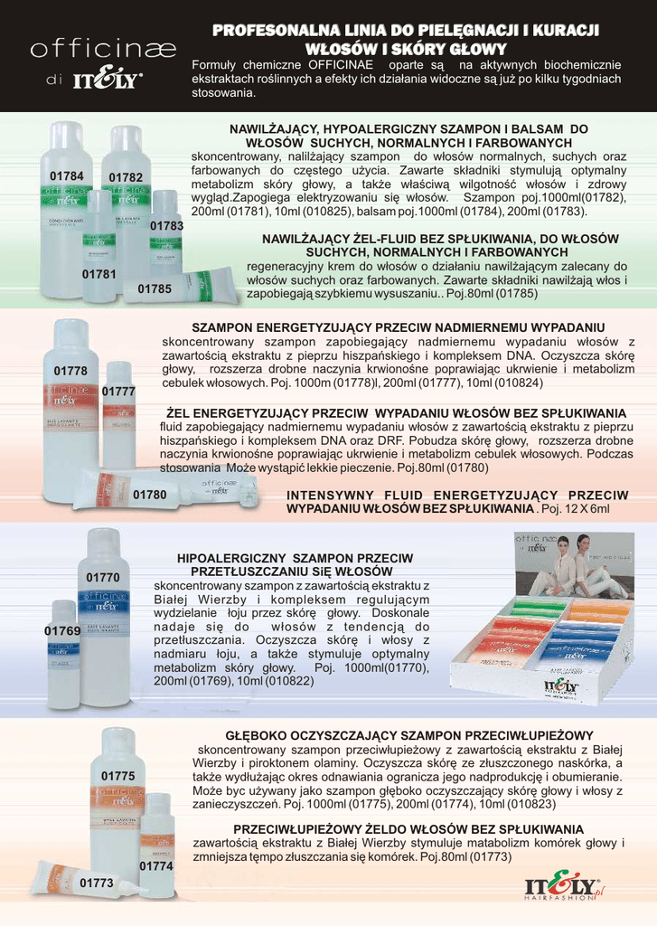 PROFESONALNA LINIA DO PIELÊGNACJI I KURACJI W£OSÓW I SKÓRY G£OWY Formu³y chemiczne OFFICINAE oparte s¹ na aktywnych biochemicznie ekstraktach roœlinnych a efekty ich dzia³ania widoczne s¹ ju¿ po kilku tygodniach stosowania. 01784 NAWIL¯AJ¥CY, HYPOALERGICZNY SZAMPON I BALSAM DO W£OSÓW SUCHYCH, NORMALNYCH I FARBOWANYCH skoncentrowany, nalil¿aj¹cy szampon do w³osów normalnych, suchych oraz farbowanych do czêstego u¿ycia. Zawarte sk³adniki stymuluj¹ optymalny metabolizm skóry g³owy, a tak¿e w³aœciw¹ wilgotnoœæ w³osów i zdrowy wygl¹d.Zapogiega elektryzowaniu siê w³osów. Szampon poj.1000ml(01782), 200ml (01781), 10ml (010825), balsam poj.1000ml (01784), 200ml (01783). 01782 01783 01781 01785 01778 01777 NAWIL¯AJ¥CY ¯EL-FLUID BEZ SP£UKIWANIA, DO W£OSÓW SUCHYCH, NORMALNYCH I FARBOWANYCH regeneracyjny krem do w³osów o dzia³aniu nawil¿aj¹cym zalecany do w³osów suchych oraz farbowanych. Zawarte sk³adniki nawil¿aj¹ w³os i zapobiegaj¹ szybkiemu wysuszaniu.. Poj.80ml (01785) SZAMPON ENERGETYZUJ¥CY PRZECIW NADMIERNEMU WYPADANIU skoncentrowany szampon zapobiegaj¹cy nadmiernemu wypadaniu w³osów z zawartoœci¹ ekstraktu z pieprzu hiszpañskiego i kompleksem DNA. Oczyszcza skórê g³owy, rozszerza drobne naczynia krwionoœne poprawiaj¹c ukrwienie i metabolizm cebulek w³osowych. Poj. 1000m (01778)l, 200ml (01777), 10ml (010824) ¯EL ENERGETYZUJ¥CY PRZECIW WYPADANIU W£OSÓW BEZ SP£UKIWANIA fluid zapobiegaj¹cy nadmiernemu wypadaniu w³osów z zawartoœci¹ ekstraktu z pieprzu hiszpañskiego i kompleksem DNA oraz DRF. Pobudza skórê g³owy, rozszerza drobne naczynia krwionoœne poprawiaj¹c ukrwienie i metabolizm cebulek w³osowych. Podczas stosowania Mo¿e wyst¹piæ lekkie pieczenie. Poj.80ml (01780) 01780 01770 01769 HIPOALERGICZNY SZAMPON PRZECIW PRZET£USZCZANIU SiÊ W£OSÓW skoncentrowany szampon z zawartoœci¹ ekstraktu z Bia³ej Wierzby i kompleksem reguluj¹cym wydzielanie ³oju przez skórê g³owy. Doskonale nadaje siê do w³osów z tendencj¹ do przet³uszczania. Oczyszcza skórê i w³osy z nadmiaru ³oju, a tak¿e stymuluje optymalny metabolizm skóry g³owy. Poj. 1000ml(01770), 200ml (01769), 10ml (010822) G£ÊBOKO OCZYSZCZAJ¥CY SZAMPON PRZECIW£UPIE¯OWY skoncentrowany szampon przeciw³upie¿owy z zawartoœci¹ ekstraktu z Bia³ej Wierzby i piroktonem olaminy. Oczyszcza skórê ze z³uszczonego naskórka, a tak¿e wyd³u¿aj¹c okres odnawiania ogranicza jego nadprodukcjê i obumieranie. Mo¿e byc u¿ywany jako szampon g³êboko oczyszczaj¹cy skórê g³owy i w³osy z zanieczyszczeñ. Poj. 1000ml (01775), 200ml (01774), 10ml (010823) 01775 01774 01773 INTENSYWNY FLUID ENERGETYZUJ¥CY PRZECIW WYPADANIU W£OSÓW BEZ SP£UKIWANIA . Poj. 12 X 6ml PRZECIW£UPIE¯OWY ¯ELDO W£OSÓW BEZ SP£UKIWANIA zawartoœci¹ ekstraktu z Bia³ej Wierzby stymuluje matabolizm komórek g³owy i zmniejsza têmpo z³uszczania siê komórek. Poj.80ml (01773)
