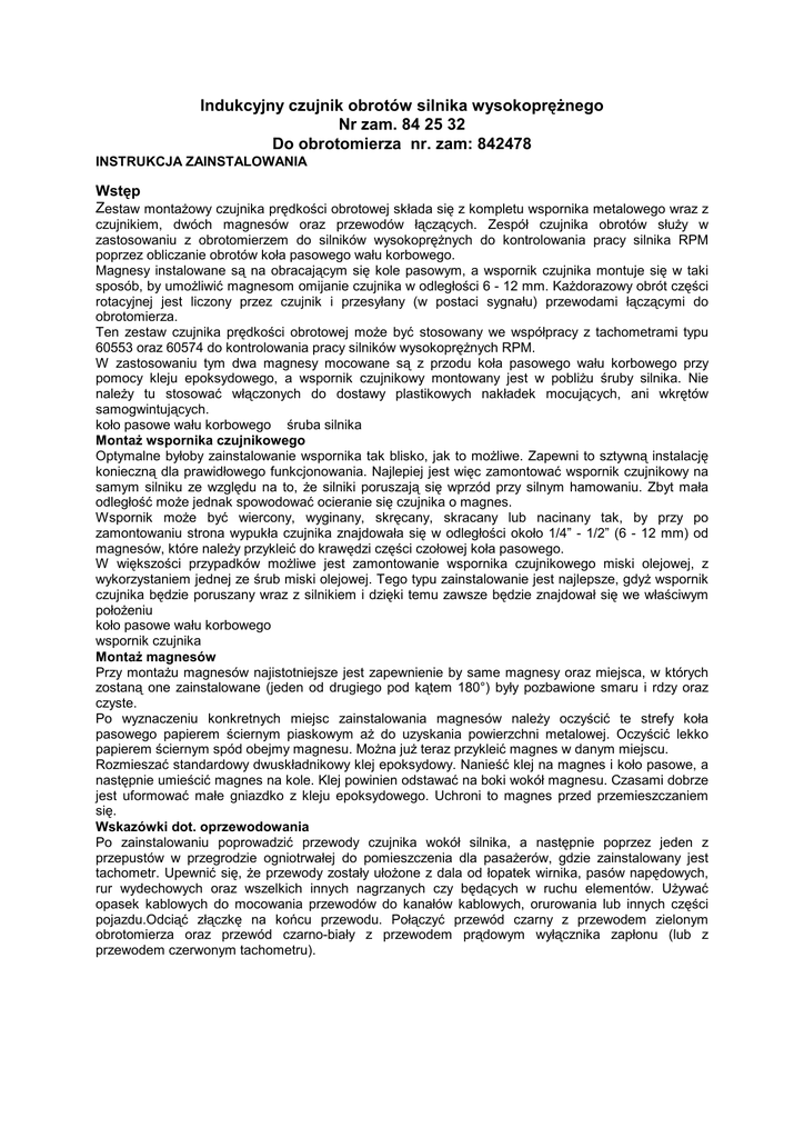 Indukcyjny czujnik obrotów silnika wysokoprężnego Nr zam. 84 25 32 Do obrotomierza nr. zam: 842478 INSTRUKCJA ZAINSTALOWANIA Wstęp Zestaw montażowy czujnika prędkości obrotowej składa się z kompletu wspornika metalowego wraz z czujnikiem, dwóch magnesów oraz przewodów łączących. Zespół czujnika obrotów służy w zastosowaniu z obrotomierzem do silników wysokoprężnych do kontrolowania pracy silnika RPM poprzez obliczanie obrotów koła pasowego wału korbowego. Magnesy instalowane są na obracającym się kole pasowym, a wspornik czujnika montuje się w taki sposób, by umożliwić magnesom omijanie czujnika w odległości 6 - 12 mm. Każdorazowy obrót części rotacyjnej jest liczony przez czujnik i przesyłany (w postaci sygnału) przewodami łączącymi do obrotomierza. Ten zestaw czujnika prędkości obrotowej może być stosowany we współpracy z tachometrami typu 60553 oraz 60574 do kontrolowania pracy silników wysokoprężnych RPM. W zastosowaniu tym dwa magnesy mocowane są z przodu koła pasowego wału korbowego przy pomocy kleju epoksydowego, a wspornik czujnikowy montowany jest w pobliżu śruby silnika. Nie należy tu stosować włączonych do dostawy plastikowych nakładek mocujących, ani wkrętów samogwintujących. koło pasowe wału korbowego śruba silnika Montaż wspornika czujnikowego Optymalne byłoby zainstalowanie wspornika tak blisko, jak to możliwe. Zapewni to sztywną instalację konieczną dla prawidłowego funkcjonowania. Najlepiej jest więc zamontować wspornik czujnikowy na samym silniku ze względu na to, że silniki poruszają się wprzód przy silnym hamowaniu. Zbyt mała odległość może jednak spowodować ocieranie się czujnika o magnes. Wspornik może być wiercony, wyginany, skręcany, skracany lub nacinany tak, by przy po zamontowaniu strona wypukła czujnika znajdowała się w odległości około 1/4” - 1/2” (6 - 12 mm) od magnesów, które należy przykleić do krawędzi części czołowej koła pasowego. W większości przypadków możliwe jest zamontowanie wspornika czujnikowego miski olejowej, z wykorzystaniem jednej ze śrub miski olejowej. Tego typu zainstalowanie jest najlepsze, gdyż wspornik czujnika będzie poruszany wraz z silnikiem i dzięki temu zawsze będzie znajdował się we właściwym położeniu koło pasowe wału korbowego wspornik czujnika Montaż magnesów Przy montażu magnesów najistotniejsze jest zapewnienie by same magnesy oraz miejsca, w których zostaną one zainstalowane (jeden od drugiego pod kątem 180°) były pozbawione smaru i rdzy oraz czyste. Po wyznaczeniu konkretnych miejsc zainstalowania magnesów należy oczyścić te strefy koła pasowego papierem ściernym piaskowym aż do uzyskania powierzchni metalowej. Oczyścić lekko papierem ściernym spód obejmy magnesu. Można już teraz przykleić magnes w danym miejscu. Rozmieszać standardowy dwuskładnikowy klej epoksydowy. Nanieść klej na magnes i koło pasowe, a następnie umieścić magnes na kole. Klej powinien odstawać na boki wokół magnesu. Czasami dobrze jest uformować małe gniazdko z kleju epoksydowego. Uchroni to magnes przed przemieszczaniem się. Wskazówki dot. oprzewodowania Po zainstalowaniu poprowadzić przewody czujnika wokół silnika, a następnie poprzez jeden z przepustów w przegrodzie ogniotrwałej do pomieszczenia dla pasażerów, gdzie zainstalowany jest tachometr. Upewnić się, że przewody zostały ułożone z dala od łopatek wirnika, pasów napędowych, rur wydechowych oraz wszelkich innych nagrzanych czy będących w ruchu elementów. Używać opasek kablowych do mocowania przewodów do kanałów kablowych, orurowania lub innych części pojazdu.Odciąć złączkę na końcu przewodu. Połączyć przewód czarny z przewodem zielonym obrotomierza oraz przewód czarno-biały z przewodem prądowym wyłącznika zapłonu (lub z przewodem czerwonym tachometru). Obrotomierz cyfrowy do silników wysokoprężnych 6625 Nr zam. 84 24 78 (Dostawa nie obejmuje indukcyjnego czujnika obrotów: Nr zam. 842532) INSTRUKCJA OBSŁUGI Stosowanie zgodne z przeznaczeniem Obrotomierz cyfrowy do silników wysokoprężnych został zaprojektowany i wykonany wyłącznie do wskazywania prędkości obrotowej silników i może być instalowany jedynie w pojazdach o napięciu stałym 12 V (znakiem „-” do karoserii). Podłączenie „+” odbywa się poprzez przewód dodatni stacyjki zapłonowej (skrzynka bezpieczników) znakiem „-” do karoserii (masy) samochodu. Zakres dostawy nie obejmuje indukcyjnego czujnika obrotów, który należy zamontować na kole zamachowym wału korbowego. Objęty dostawą materiał montażowy pozwala wbudować urządzenie (moduł wyświetlacza) do tablicy przyrządów wzgl. zamontować je na lub pod tablicą przyrządów. Urządzenie należy zamontować tak, by można było z niego korzystać, nie powodując ograniczenia bezpieczeństwa ruchu drogowego. Uwzględnić wskazania zawarte w instrukcji obsługi samochodu. Przed zamontowaniem upewnić się w warsztacie serwisowym, czy zainstalowanie jest możliwe w Waszym samochodzie. Eksploatacja obrotomierza dopuszczona jest wyłącznie wewnątrz pojazdu, a więc nie na wolnym powietrzu. Unikać bezwzględnie kontaktu z wilgocią oraz z wodą! Zastosowania, odbiegające od uprzednio opisanych, prowadzą do uszkodzenia wyrobu, co dodatkowo związane jest np. z ryzykiem zwarcia, pożaru, porażenia prądem elektrycznym itp. Nie wolno dokonywać zmian, czy modyfikacji w obrębie urządzenia, ani otwierać obudowy! Należy bezwzględnie przestrzegać wskazań dot. bezpieczeństwa pracy! Wskazania dot. bezpieczeństwa pracy Dla zapewnienia bezpiecznej eksploatacji obrotomierza konieczne jest stosowanie urządzenia zgodnie z przeznaczeniem oraz przestrzeganie przez Użytkownika wskazań dot. bezpieczeństwa pracy i ostrzeżeń, zawartych w niniejszej instrukcji obsługi. Napięcie zasilania wynosi 12 V DC (napięcie stałe). Urządzenie może być p