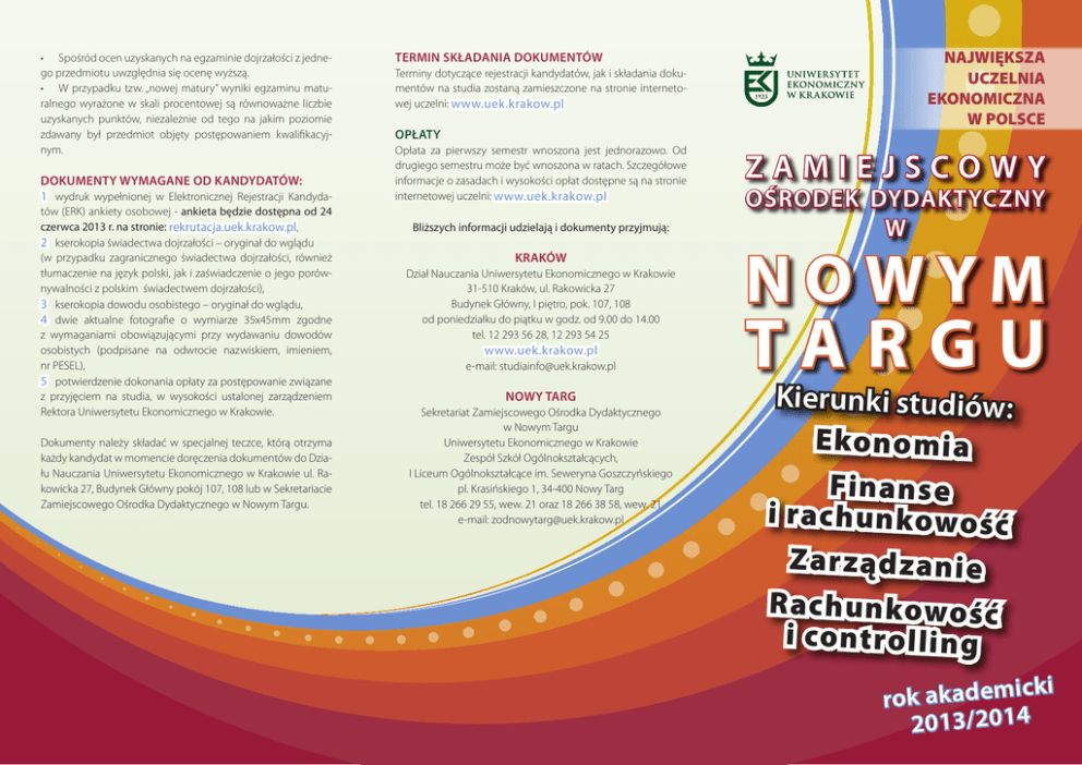• Spośród ocen uzyskanych na egzaminie dojrzałości z jednego przedmiotu uwzględnia się ocenę wyższą. • W przypadku tzw. „nowej matury” wyniki egzaminu maturalnego wyrażone w skali procentowej są równoważne liczbie uzyskanych punktów, niezależnie od tego na jakim poziomie zdawany był przedmiot objęty postępowaniem kwalifikacyjnym. DOKUMENTY WYMAGANE OD KANDYDATÓW: 1 wydruk wypełnionej w Elektronicznej Rejestracji Kandydatów (ERK) ankiety osobowej - ankieta będzie dostępna od 24 czerwca 2013 r. na stronie: rekrutacja.uek.krakow.pl, 2 kserokopia świadectwa dojrzałości – oryginał do wglądu (w przypadku zagranicznego świadectwa dojrzałości, również tłumaczenie na język polski, jak i zaświadczenie o jego porównywalności z polskim świadectwem dojrzałości), 3 kserokopia dowodu osobistego – oryginał do wglądu, 4 dwie aktualne fotografie o wymiarze 35x45mm zgodne z wymaganiami obowiązującymi przy wydawaniu dowodów osobistych (podpisane na odwrocie nazwiskiem, imieniem, nr PESEL), 5 potwierdzenie dokonania opłaty za postępowanie związane z przyjęciem na studia, w wysokości ustalonej zarządzeniem Rektora Uniwersytetu Ekonomicznego w Krakowie. Dokumenty należy składać w specjalnej teczce, którą otrzyma każdy kandydat w momencie doręczenia dokumentów do Działu Nauczania Uniwersytetu Ekonomicznego w Krakowie ul. Rakowicka 27, Budynek Główny pokój 107, 108 lub w Sekretariacie Zamiejscowego Ośrodka Dydaktycznego w Nowym Targu. TERMIN SKŁADANIA DOKUMENTÓW Terminy dotyczące rejestracji kandydatów, jak i składania dokumentów na studia zostaną zamieszczone na stronie internetowej uczelni: www.uek.krakow.pl OPŁATY Opłata za pierwszy semestr wnoszona jest jednorazowo. Od drugiego semestru może być wnoszona w ratach. Szczegółowe informacje o zasadach i wysokości opłat dostępne są na stronie internetowej uczelni: www.uek.krakow.pl Bliższych informacji udzielają i dokumenty przyjmują: KRAKÓW Dział Nauczania Uniwersytetu Ekonomicznego w Krakowie 31-510 Kraków, ul. Rakowicka 27 Budynek Główny, I piętro, pok. 107, 108 od poniedziałku do piątku w godz. od 9.00 do 14.00 tel. 12 293 56 28, 12 293 54 25 www.uek.krakow.pl e-mail: [email protected] NOWY TARG Sekretariat Zamiejscowego Ośrodka Dydaktycznego w Nowym Targu Uniwersytetu Ekonomicznego w Krakowie Zespół Szkół Ogólnokształcących, I Liceum Ogólnokształcące im. Seweryna Goszczyńskiego pl. Krasińskiego 1, 34-400 Nowy Targ tel. 18 266 29 55, wew. 21 oraz 18 266 38 58, wew. 21 e-mail: [email protected] NAJWIĘKSZA UCZELNIA EKONOMICZNA W POLSCE ZAMIEJSCOWY OŚRODEK DYDAKTYCZNY W NOWYM TA RG U Kierunki studiów: E k o n o m ia F in a n s e i ra c h u n kowo ś ć Z a r z ą d z a n ie R a c h u n kowo ś ć i c o n t r o ll in g ki rok ak ademic 2013/2014 Uniwersytet Ekonomiczny w Krakowie, którego korzenie sięgają 1925 r. jest jedną z pięciu publicznych uczelni ekonomicznych w Polsce i niezmiennie zajmuje wysokie miejsca na listach rankingowych przygotowywanych przez prestiżowe czasopisma. Posiada uprawnienia do nadawania stopni naukowych doktora i doktora habilitowanego, uprawnienia do prowadzenia wszystkich form i stopni studiów, ma szerokie kontakty z zagranicznymi uczelniami ekonomicznymi, współpracuje z około 200 uczelniami z całego świata, kształci ponad 20 tysięcy studentów. Kadra profesorska należy do wysoko wykwalifikowanych, a metodyka i programy nauczania są nieustannie udoskonalane, zgodnie z aktualnymi trendami. Uczelnia realizuje międzynarodowe programy badawcze, uczestniczy w wymianie naukowców i studentów. Prowadzi wielostronną współpracę w ramach globalnych i europejskich sieci (NIBES – Network of International Business and Economic Schools, EMBS – European Management and Business Sciences Consortium), umożliwiającą studentom zdobycie certyfikatów programów, sygnowanych przez 20 uczelni zagranicznych. Uczelnia jest także członkiem prestiżowych międzynarodowych organizacji i stowarzyszeń, takich jak: EUA – European University Association, Association of European School of Planning (AESOP), European Association for International Education (EAIE), Networked European Software&Services Initiative (NESSI), University Network of European Capitals of Culture (UNECC). W 2005 r. Uczelnia (jako pierwsza polska szkoła wyższa) przystąpiła do Stowarzyszenia Aleksander Von Humboldt – sieci europejskich ipołudniowoamerykańskich szkół wyższych, organizującej corocznie konferencje naukowe dotyczące zagadnień i praktyk biznesowych. OFERTA STUDIÓW w Zamiejscowym Ośrodku Dydaktycznym w NOWYM TARGU STUDIA NIESTACJONARNE PIERWSZEGO STOPNIA kierunek Ekonomia • specjalność: • specjalność: • specjalność: • specjalność: • specjalność: • specjalność: kierunek Finanse i rachunkowość • specjalność: • specjalność: • specjalność: • specjalność: • specjalność: • specjalność: Bankowość Doradztwo podatkowe Finanse i administracja publiczna Finanse przedsiębiorstw Rachunkowość i rewizja finansowa Corporate Finance & Accounting kierunek Zarządzanie • specjalność: • specjalność: • specjalność: • specjalność: • specjalność: Dyplom ukończenia Uniwersytetu Ekonomicznego w Krakowie jest atutem na rynku pracy! Ekonomia menedżerska Gospodarowanie nieruchomościami Przedsiębiorczość i innowacje Strategie rozwoju społeczno-ekonomicznego Strategie rozwoju biznesu Zarządzanie i doradztwo personalne Marketing Funkcjonowanie i rozwój przedsiębiorstw Zarządzanie firmą Zarządzanie sprzedażą w produkcji i handlu Zarządzanie zasobami ludzkimi kierunek Rachunkowość i controlling • specjalność: • specjalność: Rachunkowość Controlling Studia niestacjonarne pierwszego stopnia trwają 3 lata (6 semestrów) i kończą się tytułem licencjata. Absolwenci studiów niestacjonarnych mogą kontynuować naukę na studiach drugiego stopnia (stac