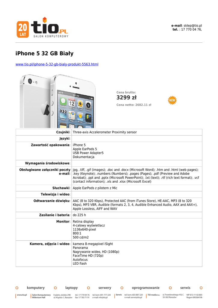 e-mail: [email protected] tel. : 17 770 04 76, iPhone 5 32 GB Biały www.tio.pl/iphone-5-32-gb-bialy-produkt-5563.html Cena brutto: 3299 zł Cena netto: 2682.11 zł Czujniki: Three-axis Accelerometer Proximity sensor Języki: Zawartość opakowania: iPhone 5 Apple EarPods 5 USB Power Adapter5 Dokumentacja Wymagania środowiskowe: Obsługiwane załączniki poczty jpg, .tiff, .gif (images); .doc and .docx (Microsoft Word); .htm and .html (web pages); e-mail: .key (Keynote); .numbers (Numbers); .pages (Pages); .pdf (Preview and Adobe Acrobat); .ppt and .pptx (Microsoft PowerPoint); .txt (text); .rtf (rich text format); .vcf (contact information); .xls and .xlsx (Microsoft Excel) Słuchawki: Apple EarPods z pilotem z Mic Telewizja i wideo: Odtwarzanie dźwięku: AAC (8 to 320 Kbps), Protected AAC (from iTunes Store), HE-AAC, MP3 (8 to 320 Kbps), MP3 VBR, Audible (formats 2, 3, 4, Audible Enhanced Audio, AAX and AAX+), Apple Lossless, AIFF and WAV Zasilanie i bateria: do 225 h Monitor: Retina display 4-calowy wyświetlacz 1136x640-pixel 800:1 500 cd/m2 Kamera, zdjęcia i wideo: kamera 8-megapixel iSight Panorama Nagrywanie wideo, HD (1080p) FaceTime HD (720p) Autofocus LED flash Lokalizacja: Assisted GPS and GLONASS Cyfrowy kompas Wi-Fi 3G Wymiary i masa: Wysokość: 123.8 mm Szerokość: 58.6 mm Głębokość: 7.6 mm Waga: 112 grams Sieci komórkowe i GSM model A1428*: UMTS/HSPA+/DC-HSDPA (850, 900, 1900, 2100 MHz); GSM/EDGE bezprzewodowe: (850, 900, 1800, 1900 MHz); LTE** (Bands 4 and 17) CDMA model A1429*: CDMA EV-DO Rev. A and Rev. B (800, 1900, 2100 MHz); UMTS/HSPA+/DC-HSDPA (850, 900, 1900, 2100 MHz); GSM/EDGE (850, 900, 1800, 1900 MHz); LTE** (Bands 1, 3, 5, 13, 25) GSM model A1429*: UMTS/HSPA+/DC-HSDPA (850, 900, 1900, 2100 MHz); GSM/EDGE (850, 900, 1800, 1900 MHz); LTE** (Bands 1, 3, 5) 802.11a/b/g/n Wi-Fi (802.11n 2.4GHz and 5GHz) Bluetooth 4.0 wireless technology Kolor: Biały Pojemność: 32 GB Model: iPhone 5 *Ceny obowiązują wyłącznie przy składaniu zamówień przez sklep internetowy. Ceny w salonie TiO media mogą nieznacznie różnić się od cen prezentowanych na stronach sklepu internetowego. Przedstawiona oferta w sklepie internetowym nie stanowi oferty w rozumieniu Kodeksu Cywilnego, i jest jedynie zaproszeniem do rozpoczęcia rokowań (zgodnie z art. 71 k.c.). Zastrzegamy sobie prawo do niezrealizowania zamówień z ważnych przyczyn ekonomicznych.