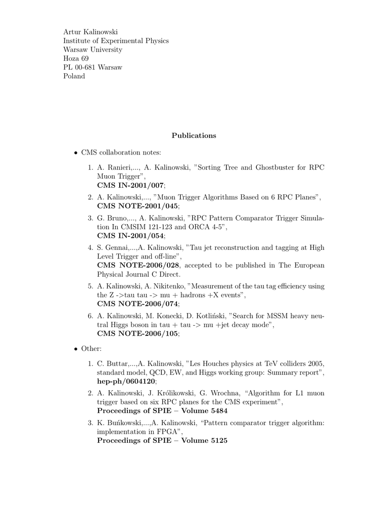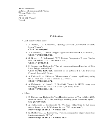 Artur Kalinowski Institute of Experimental Physics Warsaw University Hoza 69 PL 00-681 Warsaw Poland Publications • CMS collaboration notes: 1. A. Ranieri,..., A. Kalinowski, ”Sorting Tree and Ghostbuster for RPC Muon Trigger”, CMS IN-2001/007; 2. A. Kalinowski,..., ”Muon Trigger Algorithms Based on 6 RPC Planes”, CMS NOTE-2001/045; 3. G. Bruno,..., A. Kalinowski, ”RPC Pattern Comparator Trigger Simulation In CMSIM 121-123 and ORCA 4-5”, CMS IN-2001/054; 4. S. Gennai,...,A. Kalinowski, ”Tau jet reconstruction and tagging at High Level Trigger and off-line”, CMS NOTE-2006/028, accepted to be published in The European Physical Journal C Direct. 5. A. Kalinowski, A. Nikitenko, ”Measurement of the tau tag efficiency using the Z ->tau tau -> mu + hadrons +X events”, CMS NOTE-2006/074; 6. A. Kalinowski, M. Konecki, D. Kotliński, ”Search for MSSM heavy neutral Higgs boson in tau + tau -> mu +jet decay mode”, CMS NOTE-2006/105; • Other: 1. C. Buttar,...,A. Kalinowski, ”Les Houches physics at TeV colliders 2005, standard model, QCD, EW, and Higgs working group: Summary report”, hep-ph/0604120; 2. A. Kalinowski, J. Królikowski, G. Wrochna, “Algorithm for L1 muon trigger based on six RPC planes for the CMS experiment”, Proceedings of SPIE – Volume 5484 3. K. Buńkowski,...,A. Kalinowski, “Pattern comparator trigger algorithm: implementation in FPGA”, Proceedings of SPIE – Volume 5125