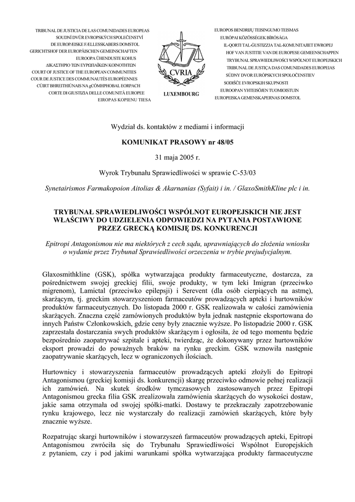 EUROPOS BENDRIJŲ TEISINGUMO TEISMAS TRIBUNAL DE JUSTICIA DE LAS COMUNIDADES EUROPEAS SOUDNÍ DVŮR EVROPSKÝCH SPOLEČENSTVÍ EURÓPAI KÖZÖSSÉGEK BÍRÓSÁGA DE EUROPÆISKE FÆLLESSKABERS DOMSTOL IL-QORTI TAL-ĠUSTIZZJA TAL-KOMUNITAJIET EWROPEJ GERICHTSHOF DER EUROPÄISCHEN GEMEINSCHAFTEN HOF VAN JUSTITIE VAN DE EUROPESE GEMEENSCHAPPEN EUROOPA ÜHENDUSTE KOHUS TRYBUNAŁ SPRAWIEDLIWOŚCI WSPÓLNOT EUROPEJSKICH ∆ΙΚΑΣΤΗΡΙΟ ΤΩΝ ΕΥΡΩΠΑΪΚΩΝ ΚΟΙΝΟΤΗΤΩΝ TRIBUNAL DE JUSTIÇA DAS COMUNIDADES EUROPEIAS COURT OF JUSTICE OF THE EUROPEAN COMMUNITIES SÚDNY DVOR EURÓPSKYCH SPOLOČENSTIEV COUR DE JUSTICE DES COMMUNAUTÉS EUROPÉENNES SODIŠČE EVROPSKIH SKUPNOSTI CÚIRT BHREITHIÚNAIS NA gCÓMHPHOBAL EORPACH EUROOPAN YHTEISÖJEN TUOMIOISTUIN CORTE DI GIUSTIZIA DELLE COMUNITÀ EUROPEE EUROPEISKA GEMENSKAPERNAS DOMSTOL EIROPAS KOPIENU TIESA Wydział ds. kontaktów z mediami i informacji KOMUNIKAT PRASOWY nr 48/05 31 maja 2005 r. Wyrok Trybunału Sprawiedliwości w sprawie C-53/03 Synetairismos Farmakopoion Aitolias & Akarnanias (Syfait) i in. / GlaxoSmithKline plc i in. TRYBUNAŁ SPRAWIEDLIWOŚCI WSPÓLNOT EUROPEJSKICH NIE JEST WŁAŚCIWY DO UDZIELENIA ODPOWIEDZI NA PYTANIA POSTAWIONE PRZEZ GRECKĄ KOMISJĘ DS. KONKURENCJI Epitropi Antagonismou nie ma niektórych z cech sądu, uprawniających do złożenia wniosku o wydanie przez Trybunał Sprawiedliwości orzeczenia w trybie prejudycjalnym. Glaxosmithkline (GSK), spółka wytwarzająca produkty farmaceutyczne, dostarcza, za pośrednictwem swojej greckiej filii, swoje produkty, w tym leki Imigran (przeciwko migrenom), Lamictal (przeciwko epilepsji) i Serevent (dla osób cierpiących na astmę), skarżącym, tj. greckim stowarzyszeniom farmaceutów prowadzących apteki i hurtowników produktów farmaceutycznych. Do listopada 2000 r. GSK realizowała w całości zamówienia skarżących. Znaczna część zamówionych produktów była jednak następnie eksportowana do innych Państw Członkowskich, gdzie ceny były znacznie wyższe. Po listopadzie 2000 r. GSK zaprzestała dostarczania swych produktów skarżącym i ogłosiła, że od tego momentu będzie bezpośrednio zaopatrywać szpitale i apteki, twierdząc, że dokonywany przez hurtowników eksport prowadzi do poważnych braków na rynku greckim. GSK wznowiła następnie zaopatrywanie skarżących, lecz w ograniczonych ilościach. Hurtownicy i stowarzyszenia farmaceutów prowadzących apteki złożyli do Epitropi Antagonismou (greckiej komisji ds. konkurencji) skargę przeciwko odmowie pełnej realizacji ich zamówień. Na skutek środków tymczasowych zastosowanych przez Epitropi Antagonismou grecka filia GSK zrealizowała zamówienia skarżących do wysokości dostaw, jakie sama otrzymała od swojej spółki-matki. Dostawy te przekraczały zapotrzebowanie rynku krajowego, lecz nie wystarczały do realizacji zamówień skarżących, które były znacznie wyższe. Rozpatrując skargi hurtowników i stowarzyszeń farmaceutów prowadzących apteki, Epitropi Antagonismou zwróciła się do Trybunału Sprawiedliwości Wspólnot Europejskich z pytaniem, czy i pod jakimi warunkami spółka wytwarzająca produkty farmaceutyczne mająca pozycję dominującą na rynku może odmówić pełnej realizacji zamówień hurtowników w celu ograniczenia importu równoległego swoich produktów. Trybunał stwierdził brak swojej właściwości do udzielenia odpowiedzi na pytania postawione przez Epitropi Antagonismou. Organ ten bowiem nie jest „sądem” w rozumieniu art. 234 Traktatu WE – postanowienia, które uprawnia sądy krajowe do składania wniosków o wydanie orzeczenia w trybie prejudycjalnym – ponieważ nie posiada niektórych z cech niezbędnych do uznania jej za sąd, a mianowicie nie jest niezależny i nie orzeka w ramach postępowania prowadzącego do rozstrzygnięcia o charakterze sądowym. Po pierwsze, Trybunał stwierdza, że Epitropi Antagonismou podlega nadzorowi ministra ds. rozwoju i że nadzór ten upoważnia ministra do dokonywania w pewnych granicach kontroli zgodności z prawem decyzji Epitropi Antagonismou. Po drugie, o ile rzeczywiście członkowie Epitropi Antagonismou są niezawiśli w wykonywaniu swoich zadań, to jednak nic nie wskazuje, by ich odwołanie lub unieważnienie ich mianowania poddane było szczególnym warunkom. Po trzecie, przewodniczący tego organu ma za zadanie organizować i kierować pracą obsługującego go urzędu i jest przełożonym służbowym personelu tego urzędu, w związku z czym nie ma funkcjonalnego rozdziału Epitropi Antagonismou, organu władczego, od jego urzędu, do którego zadań należy prowadzenie dochodzenia i na wniosek którego podejmuje on decyzje. Trybunał przypomina wreszcie, że organ ochrony konkurencji, jakim jest Epitropi Antagonismou, jest zobowiązany ściśle współpracować z Komisją Wspólnot Europejskich, i może, zgodnie ze wspólnotowym prawem konkurencji, zostać przez Komisję pozbawiony kompetencji, jeżeli ta ostatnia wszczęłaby postępowanie. Postępowanie prowadzone przed Epitropi Antagonismou może zatem nie doprowadzić do rozstrzygnięcia o charakterze sądowym. Do Trybunału zaś zwracać się mogą wyłącznie organy orzekające w ramach postępowania prowadzącego do rozstrzygnięcia o charakterze sądowym. Dokument nieoficjalny, sporządzony na użytek mediów, który nie wiąże w żaden sposób Trybunału Sprawiedliwości. Dostępne wersje językowe : DE, EL, EN, ES, FR, HU, IT, NL, PL Pełny tekst wyroku znajduje się na stronie internetowej Trybunału http://curia.eu.int/jurisp/cgi-bin/form.pl?lang=pl Tekst jest z reguły dostępny od godz. 12 CET w dniu ogłoszenia. W celu uzyskania dodatkowych informacji, proszę skontaktować się z panem Ireneuszem Gęsiorem tel. (00352) 4303 2878 faks (00352) 4303 2053