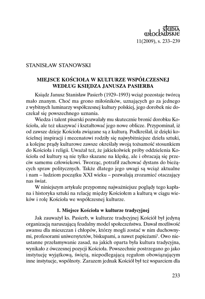 233 STANISŁAW STANOWSKI MIEJSCE KOŚCIOŁA W KULTURZE