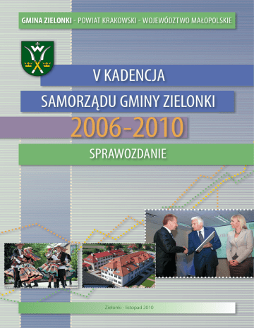 GMINA ZIELONKI - POWIAT KRAKOWSKI - WOJEWÓDZTWO MAŁOPOLSKIE V KADENCJA SAMORZĄDU GMINY ZIELONKI 2006 -2010 SPRAWOZDANIE Zielonki - listopad 2010 GMINA ZIELONKI WŚRÓD LIDERÓW ZGODA BUDUJE dlatego dobre wspólne decyzje Rady i Wójta Gminy, sprawne i dalekowzroczne zarządzanie oraz osiągnięte wyniki, docenione zostały szeregiem ogólnopolskich wyróżnień Najważniejsze z wyróżnień otrzymanych przez gminę Zielonki: 2010 IX miejsce spośród 1576 gmin wiejskich w Polsce w najbardziej prestiżowym Rankingu Samorządów „Rzeczpospolitej” (nazywanym też „Złotą Setką Samorządów”) więcej na stronie 39 2010 Wyróżnienie w konkursie „Wielkie Odkrywanie Małopolski 2010” w kategorii I - Miejscowość/gmina więcej na stronie 39 2010 V miejsce w rankingu na najlepszą w rozwoju gospodarczo-społecznym spośród 179 gmin małopolskich opracowanym przez Małopolski Instytut Samorządu Terytorialnego i Administracji w Krakowie i Urząd Statystyczny w Krakowie 2010 Nominacja do finału konkursu „Teraz Polska“ w kategorii Gmin Wiejskich 2009 II miejsce w Rankingu Samorządów „Rzeczpospolitej” więcej na stronie 39 2009 I miejsce i tytuł „EURO-Gmina Roku” dla najlepszej gminy wśród małopolskich samorządów gminnych więcej na stronie 39 2009 I nagroda w ogólnopolskim konkursie i tytuł „Modernizacja Roku 2008“ za realizację inwestycji pn. „Rewitalizacja terenów poprzemysłowych na Centrum Integracji Społecznej i Park Wiejski w Zielonkach“ więcej na stronie 39 2008 VI miejsce w Rankingu Samorządów „Rzeczpospolitej” więcej na stronie 39 2008 I miejsce w konkursie „Mądra Gmina 2007” organizowanym przez MISTiA za efektywne podnoszenie kwalifikacji pracowników i przedsiębiorców więcej na stronie 39 2007 I miejsce w Rankingu Samorządów „Rzeczpospolitej” spośród 1576 gmin wiejskich w Polsce więcej na stronie 39 2007 Wyróżnienia: • w konkursie „Teraz Polska“ w kategorii Gmin Wiejskich - 14 miejsce w I edycji • w konkursie „Najbardziej Proekologiczna Społeczność Gminna Małopolski 2007“ • w konkursie na Dobrą Markę pn. „Firma Przyjazna Rodzicom“ dla Urzędu Gminy Zielonki V KADENCJA SAMORZĄDU GMINY ZIELONKI 2006-2010 Tradycyjnie już prezentujemy Państwu podsumowanie realizacji zadań w okresie mijającej kadencji Samorządu Gminy Zielonki. Materiał zawiera szereg informacji statystycznych i finansowych opisujących główne kierunki działalności i najważniejsze inwestycje w mijającym czteroleciu (2006 – 2010). Podejmowane inicjatywy, przedsięwzięcia i trudy inwestycyjne systematycznie lokowały gmiBogusław Król - WÓJT GMINY ZIELONKI nę Zielonki w czołówce wielu ogólnopolskich rankingów pośród prawie 1600 gmin wiejskich. Tradycyjnie też zajmowaliśmy znaczące miejsca wśród małopolskich gmin. Gmina Zielonki to już dobrze kojarząca się marka, mająca utrwaloną renomę. Setki przedsięwzięć mogły zostać podjęte i zrealizowane kompleksowo dzięki zaangażowaniu, społecznej pracy, wsparciu wielu wspaniałych mieszkańców gminy, ale także radnych, sołtysów, jednostek OSP, Kół i Stowarzyszeń. Uprawnione są więc słowa mojej wdzięczności dla mieszkańców i wspólnej satysfakcji z wykorzystania szans przez nasz samorząd. Była przecież samorządowa konkurencja, stawialiśmy duże wyzwania, dotykają nas kryzysy, a ekstremalne zjawiska atmosferyczne nie były przecież nam obce w ciągu ostatnich czterech lat. Zachęcając do lektury publikacji, wyrażam przekonanie, że pozwoli ona Państwu uzyskać podstawowe informacje na temat zakresu działalności i różnorodnych wydatków gminy. Bogusław Król STATYSTYKA DZIAŁALNOŚCI ORGANÓW GMINY ORGAN WYKONAWCZY Wójt Gminy Zielonki - Bogusław Król Zastępca Wójta - Arnold Kuźniarski Skarbnik - Agata Adamczuk ORGAN UCHWAŁODAWCZY - RADA GMINY ZIELONKI Pierwsza sesja Rady Gminy Zielonki V kadencji odbyła się 27 listopada 2006 roku. W skład Prezydium Rady wchodzili przewodniczący i dwóch wiceprzewodniczących: Antoni Banaś Bibice - Wiceprzewodniczący Rady Gminy Ryszard Krawczyk Owczary - Przewodniczący Rady Gminy Krzysztof Olawski Zielonki - Wiceprzewodniczący Rady Gminy Radni Rady Gminy Zielonki Antoni Banaś Bibice - Wiceprzewodniczący Rady Gminy, członek KI, członek KIG, członek KRŚ Adam Chludek Brzozówka - Przewodniczący KRŚ, członek KIG Romuald Chwastek Bosutów-Boleń - członek KR, członek KS Adam Duliński Grębynice - członek KR, członek KRŚ Czesław Gaweł Trojanowice - członek KIG, członek KS (zmarł 21.04.2009 r.) Augustyn Jach Węgrzce - Przewodniczący KO, członek KR Ryszard Krawczyk Owczary - Przewodniczący Rady Gminy, przewodniczący KI, członek KO, członek KB Krzysztof Król Batowice - członek KIG, członek KRŚ KO Komisja Oświaty, Kultury, Zdrowia i Sportu KS Komisja Statutowa i Etyki Samorządowej KB Komisja Budżetowa KRŚ Komisja Rolnictwa i Ochrony Środowiska 2 V KADENCJA SAMORZĄDU GMINY ZIELONKI 2006-2010 Lucyna Kwiecień Wola Zachariaszowska - członek KB, członek KO Stefan Łysek Bibice - Przewodniczący KR, członek KO Halina Nowak Trojanowice - członek KIG, członek KS (od 27.09.2009 r. - wybrana w wyborach uzupełniających, przeprowadzonych w związku ze śmiercią radnego Czesława Gawła) Krzysztof Olawski Zielonki - Wiceprzewodniczący Rady Gminy, członek KB, członek KS, Władysław Orzechowski Zielonki - Przewodniczący KB, członek KO Jan Palimąka Zielonki - Przewodniczący KIG, członek KRŚ Marek Płonka Zielonki - członek KR, członek KS Marian Żurek Węgrzce - Przewodniczący KS, członek KB, członek KI KR Komisja Rewizyjna KI Komisja Inwentaryzacyjna KIG Komisja Infrastruktury Technicznej i Rozwoju Gospodarczego STATYSTYKA DZIAŁALNOŚCI ORGANÓW GMINY Sesje Rady Gminy Posiedzenia 41 Uchwały 330 Rezolucje 1 Komisje Rady Gminy Komisja Komisja Oświaty, Kultury, Zdrowia i Sportu Komisja Statutowa i Etyki Samorządowej Komisja Budżetow
