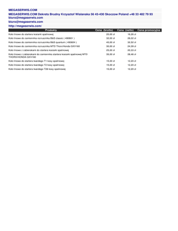 MEGASERWIS.COM MEGASERWIS.COM Dekrets Brudny Krzysztof Wislanska 56 43-430 Skoczow Poland +48 33 482 79 93 [email protected] [email protected] http://megaserwis.com/ Produkty Cena (brutto) Cena (netto) Cena promocyjna Koło linowe do startera kosiarki spalinowej 20,00 zł 16,26 zł Koło linowe do zamiennika rozrusznika B&S classic ( 499901 ) 32,00 zł 26,02 zł Koło linowe do zamiennika rozrusznika B&S quantum ( 493824 ) 40,00 zł 32,52 zł Koło linowe do zamiennika rozrusznika MTD Thorx/Honda GXV160 30,00 zł 24,39 zł Koło linowe z zabierakami do startera kosiarki spalinowej 25,00 zł 20,33 zł Koło linowe z zabierakami do zamiennika startera kosiarki spalinowej MTD THORX/HONDA GXV160 35,00 zł 28,46 zł Koło linowe do startera twardego T1 kosy spalinowej 15,00 zł 12,20 zł Koło linowe do startera twardego T2 kosy spalinowej 15,00 zł 12,20 zł Koło linowe do startera twardego T26 kosy spalinowej 15,00 zł 12,20 zł