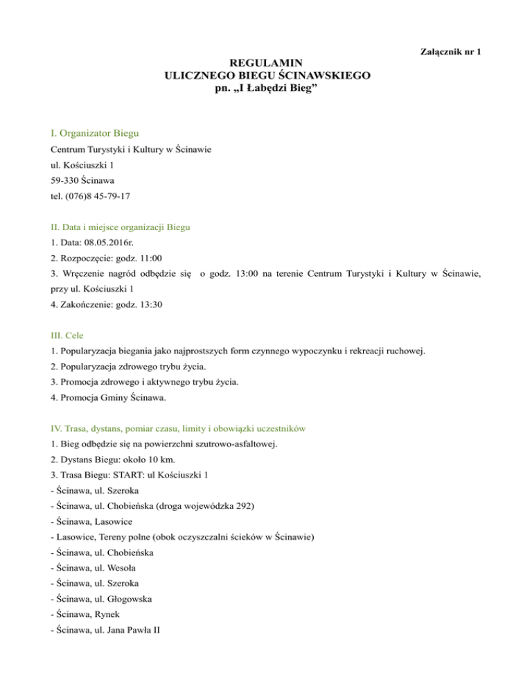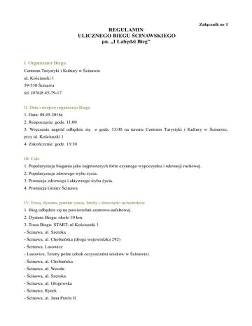 Załącznik nr 1 REGULAMIN ULICZNEGO BIEGU ŚCINAWSKIEGO pn. „I Łabędzi Bieg” I. Organizator Biegu Centrum Turystyki i Kultury w Ścinawie ul. Kościuszki 1 59-330 Ścinawa tel. (076)8 45-79-17 II. Data i miejsce organizacji Biegu 1. Data: 08.05.2016r. 2. Rozpoczęcie: godz. 11:00 3. Wręczenie nagród odbędzie się o godz. 13:00 na terenie Centrum Turystyki i Kultury w Ścinawie, przy ul. Kościuszki 1 4. Zakończenie: godz. 13:30 III. Cele 1. Popularyzacja biegania jako najprostszych form czynnego wypoczynku i rekreacji ruchowej. 2. Popularyzacja zdrowego trybu życia. 3. Promocja zdrowego i aktywnego trybu życia. 4. Promocja Gminy Ścinawa. IV. Trasa, dystans, pomiar czasu, limity i obowiązki uczestników 1. Bieg odbędzie się na powierzchni szutrowo-asfaltowej. 2. Dystans Biegu: około 10 km. 3. Trasa Biegu: START: ul Kościuszki 1 - Ścinawa, ul. Szeroka - Ścinawa, ul. Chobieńska (droga wojewódzka 292) - Ścinawa, Lasowice - Lasowice, Tereny polne (obok oczyszczalni ścieków w Ścinawie) - Ścinawa, ul. Chobieńska - Ścinawa, ul. Wesoła - Ścinawa, ul. Szeroka - Ścinawa, ul. Głogowska - Ścinawa, Rynek - Ścinawa, ul. Jana Pawła II - Ścinawa, ul. Władysława Jagiełły - Ścinawa, ul. Mickiewicza - Ścinawa, ul. Żołnierska - Ścinawa, Tereny nadodrzańskie (Port w Ścinawie) - Ścinawa, ul. Rybna - Ścinawa, Skrzyżowanie ulic Wrocławskiej i Sportowej (przecięcie Drogi Krajowej 36) - Ścinawa, ul. Sportowa - Ścinawa, ul. Polna - Ścinawa, ul. Przyjaciół Żołnierza - Ścinawa, ul. Królowej Jadwigi - Ścinawa, ul. Władysława Jagiełły - Ścinawa, ul. Kościuszki 1 - Ścinawa, Meta: Kościuszki 1 4. Trasa nie posiada atestu PZLA. 5. Limit czasu ustala się na 2 godziny, po tym czasie zawodnicy powinni zejść z trasy. 6. Dopuszcza się zawodników z kijkami Nordic Walking – nie klasyfikowani w osobnej kategorii. 7. Każda osoba startująca w biegu zobowiązana jest do podpisania stosownego oświadczenia o zdolności do uczestnictwa w zawodach sportowych na własną odpowiedzialność. W przypadku startu osób niepełnoletnich obowiązkowa jest zgoda prawnego opiekuna dziecka. V. Zgłoszenia, wpisowe i pakiety startowe 1. Zapisów można dokonywać od dnia 15 marca 2016r. do dnia 4 maja 2016r. poprzez stronę internetową. Po tym terminie w dniu imprezy w biurze organizatora w godzinach od 9:00 do 10:30. 2. Organizator przewiduje możliwość udziału 500 uczestników. W przypadku przekroczenia limitu przewidzianego przez organizatora, zapisy internetowe zostaną zamknięte przed datą 5 maja 2016r. 3. Opłata startowa za bieg wynosi 35 zł, w dniu zawodów 45 zł. 4. Opłatę należy wnieść przelewem na konto: Klub Sportowy START ŚCINAWA, ul. Cisowa 2 59-330 Ścinawa, BS Wschowa Oddział w Ścinawie nr konta 70866900012035035243230001 do dnia 4 maja 2016r.. Po tym terminie opłaty w wysokości 45 zł przyjmowane będą tylko w dniu biegu przy odbiorze pakietów. 5. Wpisowe jest bezzwrotne i nie ma możliwości przeniesienia go na inną osobę. 6. Odbiór pakietów startowych w dniu zawodów od 9:00 do 10:30 w biurze zawodów, które mieści się przy starcie. 7. Zawodnicy na mecie mają zapewniony ciepły posiłek i wodę. 8 Opłacenie startowego oraz odbiór numeru jest równoznaczne z akceptacją niniejszego regulaminu. VI. Nagrody, klasyfikacje 1. We wszystkich kategoriach przewidziane są nagrody rzeczowe. 2. Każdy uczestnik, który dotrze do mety otrzyma pamiątkowy medal. 3. Organizator nie przewiduje podziału na kategorie wiekowe. 4. Klasyfikacje: ● Klasyfikacja generalna mężczyzn i kobiet (miejsca 1-3) ● Klasyfikacja mężczyzn i kobiet mieszkańców Gminy Ścinawa (miejsca 1-3) ● Klasyfikacja mężczyzn i kobiet Powiatu Lubińskiego (miejsca 1-3) ● Klasyfikacja FLY TEAM – 3osobowe mieszane drużyny firmowe VII. Zabezpieczenie trasy Biegu 1. Zabezpieczenie trasy Biegu przebiegać będzie zgodnie z projektem organizacji ruchu zatwierdzonym przez Generalną Dyrekcję Dróg Krajowych i Autostrad Oddział we Wrocławiu. 2. Uczestnicy Biegu poruszają się zajmując wyznaczoną szerokość jezdni. 3. Uczestnicy Biegu mają bezwzględny obowiązek podporządkowania się poleceniom Policji, Organizatorom oraz służbom porządkowym. VIII. Postanowienia końcowe 1. Zawody odbędą się bez względu na warunki atmosferyczne. 2. Organizator zastrzega sobie prawo zmian w regulaminie. 3. Kontakt do organizatora pod nr telefonu (76)845-79-17) 4. We wszystkich sprawach nieujętych Regulaminem decyduje Organizator Biegu, któremu przysługuje wiążąca i ostateczna interpretacja Regulaminu.
