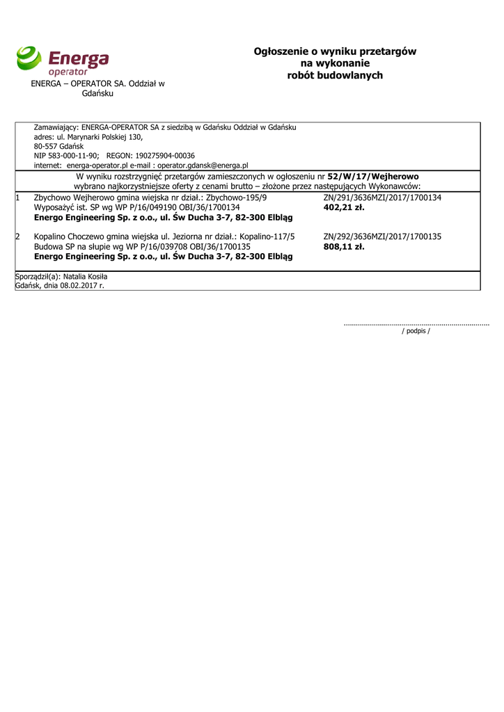 ENERGA – OPERATOR SA. Oddział w Gdańsku Ogłoszenie o wyniku przetargów na wykonanie robót budowlanych Zamawiający: ENERGA-OPERATOR SA z siedzibą w Gdańsku Oddział w Gdańsku adres: ul. Marynarki Polskiej 130, 80-557 Gdańsk NIP 583-000-11-90; REGON: 190275904-00036 internet: energa-operator.pl e-mail : [email protected] 1 2 W wyniku rozstrzygnięć przetargów zamieszczonych w ogłoszeniu nr 52/W/17/Wejherowo wybrano najkorzystniejsze oferty z cenami brutto – złożone przez następujących Wykonawców: Zbychowo Wejherowo gmina wiejska nr dział.: Zbychowo-195/9 ZN/291/3636MZI/2017/1700134 Wyposażyć ist. SP wg WP P/16/049190 OBI/36/1700134 402,21 zł. Energo Engineering Sp. z o.o., ul. Św Ducha 3-7, 82-300 Elbląg Kopalino Choczewo gmina wiejska ul. Jeziorna nr dział.: Kopalino-117/5 Budowa SP na słupie wg WP P/16/039708 OBI/36/1700135 Energo Engineering Sp. z o.o., ul. Św Ducha 3-7, 82-300 Elbląg ZN/292/3636MZI/2017/1700135 808,11 zł. Sporządził(a): Natalia Kosiła Gdańsk, dnia 08.02.2017 r. ......................................................................... / podpis /