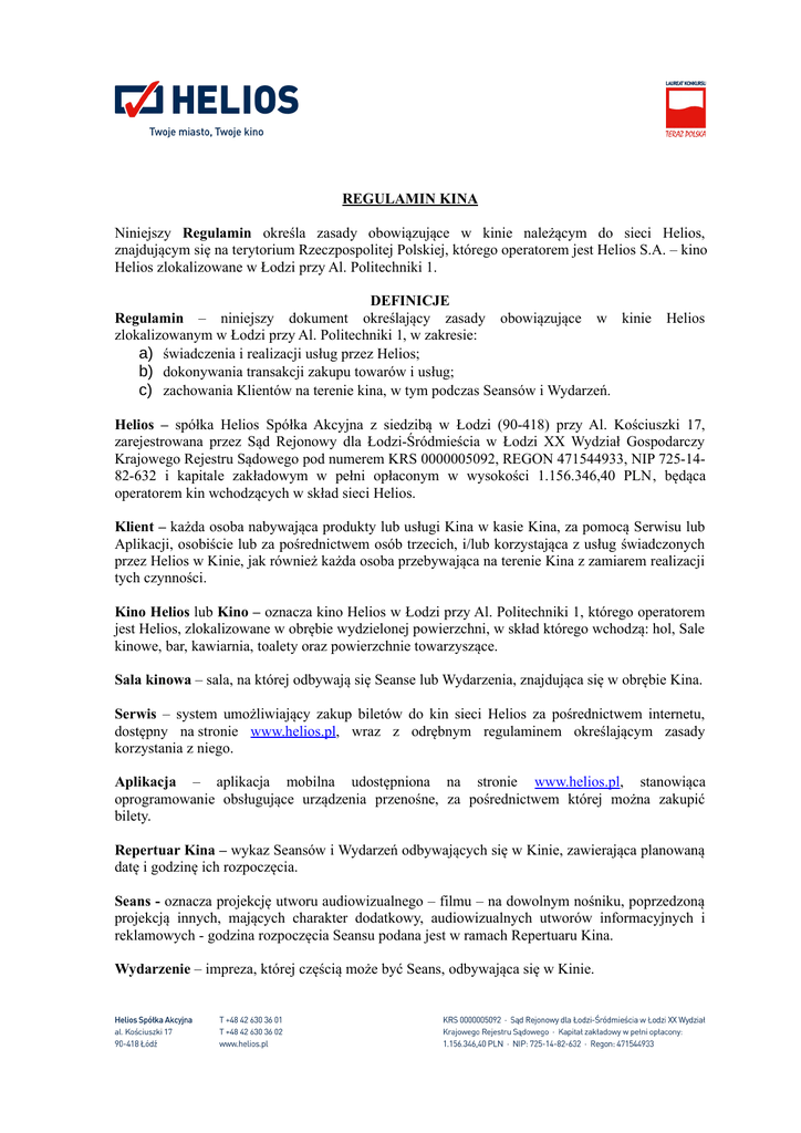 REGULAMIN KINA Niniejszy Regulamin określa zasady obowiązujące w kinie należącym do sieci Helios, znajdującym się na terytorium Rzeczpospolitej Polskiej, którego operatorem jest Helios S.A. – kino Helios zlokalizowane w Łodzi przy Al. Politechniki 1. DEFINICJE Regulamin – niniejszy dokument określający zasady obowiązujące w kinie zlokalizowanym w Łodzi przy Al. Politechniki 1, w zakresie: a) świadczenia i realizacji usług przez Helios; b) dokonywania transakcji zakupu towarów i usług; c) zachowania Klientów na terenie kina, w tym podczas Seansów i Wydarzeń. Helios Helios – spółka Helios Spółka Akcyjna z siedzibą w Łodzi (90-418) przy Al. Kościuszki 17, zarejestrowana przez Sąd Rejonowy dla Łodzi-Śródmieścia w Łodzi XX Wydział Gospodarczy Krajowego Rejestru Sądowego pod numerem KRS 0000005092, REGON 471544933, NIP 725-1482-632 i kapitale zakładowym w pełni opłaconym w wysokości 1.156.346,40 PLN, będąca operatorem kin wchodzących w skład sieci Helios. Klient – każda osoba nabywająca produkty lub usługi Kina w kasie Kina, za pomocą Serwisu lub Aplikacji, osobiście lub za pośrednictwem osób trzecich, i/lub korzystająca z usług świadczonych przez Helios w Kinie, jak również każda osoba przebywająca na terenie Kina z zamiarem realizacji tych czynności. Kino Helios lub Kino – oznacza kino Helios w Łodzi przy Al. Politechniki 1, którego operatorem jest Helios, zlokalizowane w obrębie wydzielonej powierzchni, w skład którego wchodzą: hol, Sale kinowe, bar, kawiarnia, toalety oraz powierzchnie towarzyszące. Sala kinowa – sala, na której odbywają się Seanse lub Wydarzenia, znajdująca się w obrębie Kina. Serwis – system umożliwiający zakup biletów do kin sieci Helios za pośrednictwem internetu, dostępny na stronie www.helios.pl, wraz z odrębnym regulaminem określającym zasady korzystania z niego. Aplikacja – aplikacja mobilna udostępniona na stronie www.helios.pl, stanowiąca oprogramowanie obsługujące urządzenia przenośne, za pośrednictwem której można zakupić bilety. Repertuar Kina – wykaz Seansów i Wydarzeń odbywających się w Kinie, zawierająca planowaną datę i godzinę ich rozpoczęcia. Seans - oznacza projekcję utworu audiowizualnego – filmu – na dowolnym nośniku, poprzedzoną projekcją innych, mających charakter dodatkowy, audiowizualnych utworów informacyjnych i reklamowych - godzina rozpoczęcia Seansu podana jest w ramach Repertuaru Kina. Wydarzenie – impreza, której częścią może być Seans, odbywająca się w Kinie. Seans Specjalny - to Seans oznaczony w Repertuarze Kina (*). Wydarzenie Specjalne – to Wydarzenie oznaczone w Repertuarze Kina (*). Bilet - dokument wystawiony przez Helios w formie papierowej lub elektronicznej, upoważniający do uczestnictwa w Seansie lub Wydarzeniu, określający tytuł, datę, godzinę Seansu lub Wydarzenia, Salę kinową oraz miejsce. Kupon – dokument wystawiony przez Helios lub honorowany przez Helios, w formie papierowej lub elektronicznej, posiadający swój unikalny kod i datę ważności, upoważniający jego posiadacza do uczestnictwa w Seansie, na zasadach określonych przy jego zakupie. Zaproszenie – dokument wystawiony przez Helios w formie papierowej lub elektronicznej upoważniający jego posiadacza do nieodpłatnego uczestnictwa w Seansie, na zasadach określonych w jego treści. 1. 2. 3. 4. 5. 6. POSTANOWIENIA OGÓLNE Klient przebywający na terenie Kina zobowiązany jest do przestrzegania Regulaminu. Wejście na teren Sali kinowej możliwe jest jedynie po okazaniu ważnego Biletu uprawniającego do uczestnictwa w Seansie lub Wydarzeniu odbywającym się na danej Sali kinowej. Bilet ważny jest jedynie na wyznaczony na nim Seans lub Wydarzenie. Klient uczestniczący w Seansie lub Wydarzeniu zobowiązany jest do zajęcia miejsca określonego na posiadanym przez siebie Bilecie. Za osoby małoletnie, przebywające na terenie Kina lub uczestniczące w Seansie czy Wydarzeniu odpowiedzialność, w tym również materialną, ponoszą stosownie do właściwych przepisów prawa ich rodzice lub opiekunowie prawni. Helios nie ponosi odpowiedzialności za rzeczy pozostawione lub zagubione w Kinie. Rzeczy te w Kinie będą przekazywane do biura rzeczy znalezionych po upływie 30 dni od ich znalezienia. Na terenie Kina zabrania się: a) palenia papierosów i korzystania z elektronicznych papierosów oraz urządzeń i przedmiotów o tej samej lub zbliżonej funkcji lub działaniu; b) posiadania i używania środków odurzających; c) spożywania artykułów spożywczych zakupionych poza Kinem, oraz wnoszenia artykułów mogących spowodować zabrudzenie mienia, odzieży innych Klientów lub w inny sposób, np. zapachem, mogących utrudniać innym Klientom uczestnictwo w Seansie lub Wydarzeniu d) wnoszenia i/lub spożywania napojów alkoholowych zakupionych poza Kinem; e) wnoszenia i spożywania napojów alkoholowych zakupionych w Kinie na Seanse od lat: b.o. (bez ograniczeń wiekowych); f) wprowadzania zwierząt, za wyjątkiem psów przewodników dla osób niewidomych i niedowidzących; g) niszczenia mienia; h) zachowań obraźliwych, niekulturalnych i sprzecznych z zasadami współżycia społecznego, w tym głośnego zachowania zakłócającego odbiór Seansu lub Wydarzenia; i) niestosownego zachowania mogącego naruszać dobre obyczaje; j) wnoszenia przedmiotów i substancji niebezpiecznych, które mogą zagrażać zdrowiu lub bezpieczeństwu osób przebywających w Kinie; k) sprzedaży innym osobom biletów, kuponów i voucherów; l) prowadzenia jakiejkolwiek działalności handlowej bądź usługowej, działalności marketingowej, działalności charytatywnej itp. (w tym celu wymagana jest bezwzględna zgoda Helios). 7. W trakcie Seansu lub Wydarzenia dodatkowo zabrania się: a) dokonywania jakichkolwiek rejestracji obrazu i dźwięku, jako działań prawnie zabronionych ( na podstawie: Ustawy o prawach autorskich Dz.U