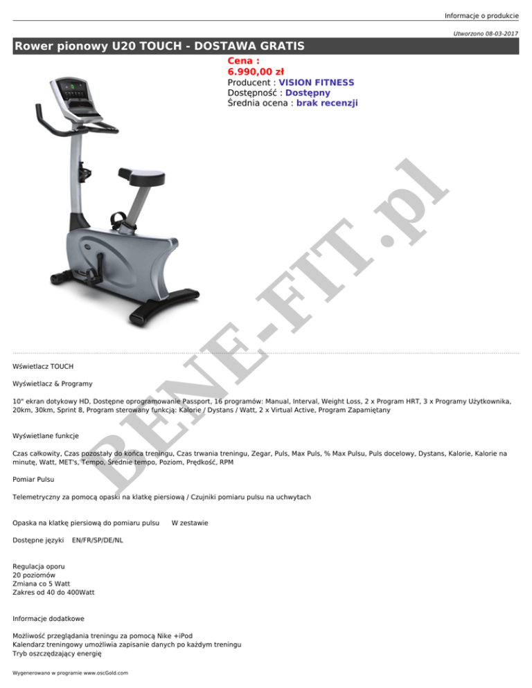 Informacje o produkcie Utworzono 08-03-2017 Rower pionowy U20 TOUCH - DOSTAWA GRATIS Cena : 6.990,00 zł B EN E- FI T .p l Producent : VISION FITNESS Dostępność : Dostępny Średnia ocena : brak recenzji Wświetlacz TOUCH Wyświetlacz & Programy 10" ekran dotykowy HD, Dostępne oprogramowanie Passport, 16 programów: Manual, Interval, Weight Loss, 2 x Program HRT, 3 x Programy Użytkownika, 20km, 30km, Sprint 8, Program sterowany funkcją: Kalorie / Dystans / Watt, 2 x Virtual Active, Program Zapamiętany Wyświetlane funkcje Czas całkowity, Czas pozostały do końca treningu, Czas trwania treningu, Zegar, Puls, Max Puls, % Max Pulsu, Puls docelowy, Dystans, Kalorie, Kalorie na minutę, Watt, MET's, Tempo, Średnie tempo, Poziom, Prędkość, RPM Pomiar Pulsu Telemetryczny za pomocą opaski na klatkę piersiową / Czujniki pomiaru pulsu na uchwytach Opaska na klatkę piersiową do pomiaru pulsu Dostępne języki W zestawie EN/FR/SP/DE/NL Regulacja oporu 20 poziomów Zmiana co 5 Watt Zakres od 40 do 400Watt Informacje dodatkowe Możliwość przeglądania treningu za pomocą Nike +iPod Kalendarz treningowy umożliwia zapisanie danych po każdym treningu Tryb oszczędzający energię Wygenerowano w programie www.oscGold.com Głośnik 2 Watt Wejście słuchawkowe Uchwyt na gazetę B EN E- FI T .p l Specyfikacja U20 System oporu Elektromagnetyczny system oporu Napęd Pas Poly-V Koło zamachowe 10,5kg Siodełko Comfort Arc Regulacja siodełka W pionie Sztyca siodełka Stalowa Kierownica Z czujnikami pomiaru pulsu Pedały Samopoziomujące z paskami Zasilanie Zewnętrzne Wymiary 102 x 66 x 147cm Waga 37kg Max. waga Użytkownika 135kg