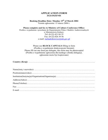 APPLICATION FORM ZGŁOSZENIE Booking Deadline Date: Monday 15th of March 2004 Termin zgłoszenia: 15 marca 2004 r. Please complete and fax to Ministry of Culture Conference Office: Prośba o wypełnienie i przesłanie do Departamentu Filmu i Mediów Audiowizualnych w Ministerstwie Kultury: Tel: (0-22) 421 04 35 Fax: (0-22) 826 39 56 e-mail: [email protected] Please use BLOCK CAPITALS filling in form (Prośba o wypełnienie drukowanymi literami) Please fill out one form per delegate, this form may be photocopied (Prośba o wypełnienie zgłoszenia dla każdego członka delegacji, zgłoszenie może być kopiowane) Country (Kraj): ……………………………………………………………………………….. Name(imię i nazwisko): ……………………………………………………………………….. Position(stanowisko):…………………………………………………………………………… Institution(Instytucja)/Organisation(Organizacja):……………………………………………... Address(Adres):………………………………………………………………………………… Phone(Telefon):………………………………………………………………………………… Fax: …………………………………………………………………………………………….. E-mail: ………………………………………………………………………………………….