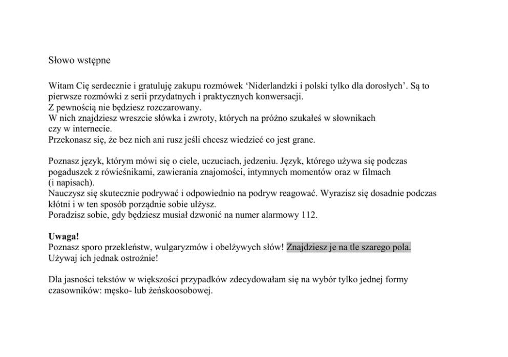 Słowo wstępne Witam Cię serdecznie i gratuluję zakupu rozmówek ‘Niderlandzki i polski tylko dla dorosłych’. Są to pierwsze rozmówki z serii przydatnych i praktycznych konwersacji. Z pewnością nie będziesz rozczarowany. W nich znajdziesz wreszcie słówka i zwroty, których na próżno szukałeś w słownikach czy w internecie. Przekonasz się, że bez nich ani rusz jeśli chcesz wiedzieć co jest grane. Poznasz język, którym mówi się o ciele, uczuciach, jedzeniu. Język, którego używa się podczas pogaduszek z rówieśnikami, zawierania znajomości, intymnych momentów oraz w filmach (i napisach). Nauczysz się skutecznie podrywać i odpowiednio na podryw reagować. Wyrazisz się dosadnie podczas kłótni i w ten sposób porządnie sobie ulżysz. Poradzisz sobie, gdy będziesz musiał dzwonić na numer alarmowy 112. Uwaga! Poznasz sporo przekleństw, wulgaryzmów i obelżywych słów! Znajdziesz je na tle szarego pola. Używaj ich jednak ostrożnie! Dla jasności tekstów w większości przypadków zdecydowałam się na wybór tylko jednej formy czasowników: męsko- lub żeńskoosobowej. Dodatkowe informacje zaznaczone są kursywą. I jeszcze coś! Nie przejmuj się, jeśli nie znajdziesz tu wszystkich słów czy zwrotów. Jest to wręcz niemożliwe. Ale z pomocą tych pieczołowicie wybranych poradzisz sobie w wielu sytuacjach. Nabierzesz pewności siebie i pożegnasz się z kompleksami! A jak zadziwisz Holendrów! Za cenne uwagi i pomoc serdecznie dziękuję Izabeli Bejnar, Remco Heijmen, Ani Kobylińskiej, Chrisowi Held, Karolinie Grendzie, Mikołajowi Roszakowi, mojemu mężowi Alexandrowi oraz tacie Wojciechowi Krawczykowi. Nieźle się przy okazji bawiliśmy. Nie zwlekaj! Zabierz się do nauki, a przekonasz się, jak łatwo Ci ona przyjdzie! I na pewno nie będzie nudna. Życzę sukcesów! Agata van Ekeren - Krawczyk Woord vooraf Gefeliciteerd met je aankoop van het boek ‘Pools en Nederlands alleen voor volwassenen’. Dit is het eerste boek van een praktische serie met gesprekken in allerlei situaties. Je leert bijvoorbeeld hoe je kunt praten over gevoelens, wat je kunt zeggen als je met iemand kennismaakt of als je ruzie maakt. Ook leer je woorden die je kunt gebruiken om te flirten of te verleiden. Eindelijk kun je in elke situatie duidelijk maken wat je bedoelt! Met dit boek kom je verder en maak je indruk op je gesprekspartners. Je vindt in dit boek ook scheldwoorden en vloeken. Die staan in een grijs veld. Ik adviseer je deze woorden met mate te gebruiken! Om de Poolse teksten zo overzichtelijk mogelijk te maken heb ik gekozen voor gebruik van maar één werkwoordsvorm: mannelijk of vrouwelijk. Extra informatie staat altijd cursief gedrukt. Bij het schrijven van dit boek kreeg ik advies en hulp van de volgende personen, die ik hartelijk bedank: Izabela Bejnar, Remco Heijmen, Ania Kobylińska, Chris Held, Karolina Grenda, Mikołaj Roszak, mijn man Alexander en mijn vader Wojciech Krawczyk. Wij hebben veel plezier gehad om alle soorten gesprekken uit te werken. Ga nu aan de slag en merk hoe makkelijk het gaat! Met deze praktische woorden wordt een nieuwe taal leren nog leuker. Ik wens je veel succes! Agata van Ekeren - Krawczyk Inhoudsopgave: Spis treści: Het voorwoord 7 1. Aangenaam 11 2. Op het strand 15 3. In de kroeg 19 4. Versieren 23 5. Lieve woordjes 27 6. Kus me 31 7. Ruzie 35 8. Rot op 39 9. Verzoening 43 10. Ga niet weg 47 11. Alarmnummer 51 12. Over haar en hem anders 55 13. Lijf, seks, eten 61 Słowo wstępne 9 1. Miło mi 11 2. Na plaży 15 3. W knajpie 19 4. Podryw 23 5. Czułe słówka 27 6. Pocałuj mnie 31 7. Kłótnia 35 8. Odwal się 39 9. Zgoda 43 10. Nie odchodź 47 11. Numer alarmowy 51 12. O niej i o nim inaczej 55 13. Ciało, seks, jedzenie 61 6 Kus me. Pocałuj mnie. Geef me een kus! Haal je het uit je hoofd! Eerst moet je je scheren! Daj buziaka! Wybij to sobie z głowy! Najpierw się ogol! Wat kan je lekker zoenen! Ik word geil. Kom, ik laat je zien wat een tongzoen is. Wspaniale się całujesz. Podniecasz mnie. Chodź, pokażę ci jak się całuje z języczkiem. Ik wil met je naar bed. Het is voor mij de eerste keer. Ik wil met je vrijen. Maar ik niet. Ik heb hoofdpijn. Chcę iść z tobą do łóżka. To mój pierwszy raz. Chcę się z tobą kochać. Ale ja nie. Boli mnie głowa. Ik vind het moeilijk om over seks te praten. Karen, wees niet zo preuts. Ik wil niet zwanger worden. Ben je niet aan de pil? Nee. Ik neem binnenkort een spiraaltje. Nie umiem rozmawiać o seksie. Karen, nie bądź taka pruderyjna. Nie chcę zajść w ciążę. Nie bierzesz pigułek? Nie. Niedługo założę sobie spiralę. Ik wil niet zomaar met je rotzooien. Wat heb je een lekker kontje! Ik wil niet verder gaan. Relax, schatje. Nie chcę tak po prostu iść z tobą do łóżka. Ale masz fajną pupcię. Nie chcę posuwać się dalej. Wyluzuj się, złotko. Ik wil geen geslachtsziekte krijgen. Ik wil ook alleen veilig vrijen. Nie chcę załapać choroby wenerycznej. Ja też chcę tylko bezpiecznie się kochać. Heb je dan een kapotje bij je? Masz kondom? Niet doen alsjeblieft. Niet hier en niet nu. Laten we het leuk houden. Blijf van me af! Proszę, przestań. Nie chcę tutaj i nie teraz. Jest tak miło, nie psuj tego. Nie dotykaj mnie! Dat vind ik niet leuk. Je doet me pijn. Je overdrijft. Je wilde het zelf. Nie podoba mi się to. Sprawiasz mi ból. Przesadzasz. Sama tego chciałaś. Tot hier en niet verder. Doe niet zo moeilijk. Hou op! Ik ben ongesteld. Nie posuwaj się dalej. No nie bądź taka… Przestań! Mam okres. Vind je dat lekker? Ja, dat is lekker. Ga door. Lubisz to? Tak, lubię. Nie przerywaj. Ik wil nog een keer. Vergeet het! Chcę jeszcze raz. Zapomnij! Mijn vriend bakt er niks van in bed. Dus daarom doe je het met iedereen? Mój chłopak nie jest dobry w łóżku. To dlatego bzykasz się na prawo i lewo? 7 Ruzie. Kłótnia. Kom, doe eens rustig. Maak je niet zo druk. Nu moet je ophouden! Ik wil geen ruzie. No uspokuj się. Nie dener