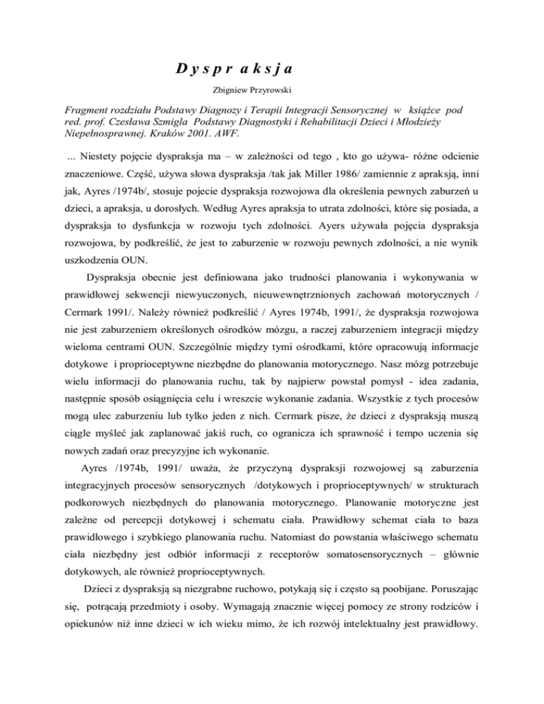 Dyspr aksja Zbigniew Przyrowski Fragment rozdziału Podstawy Diagnozy i Terapii Integracji Sensorycznej w książce pod red. prof. Czesława Szmigla Podstawy Diagnostyki i Rehabilitacji Dzieci i Młodzieży Niepełnosprawnej. Kraków 2001. AWF. ... Niestety pojęcie dyspraksja ma – w zależności od tego , kto go używa- różne odcienie znaczeniowe. Część, używa słowa dyspraksja /tak jak Miller 1986/ zamiennie z apraksją, inni jak, Ayres /1974b/, stosuje pojecie dyspraksja rozwojowa dla określenia pewnych zaburzeń u dzieci, a apraksja, u dorosłych. Według Ayres apraksja to utrata zdolności, które się posiada, a dyspraksja to dysfunkcja w rozwoju tych zdolności. Ayers używała pojęcia dyspraksja rozwojowa, by podkreślić, że jest to zaburzenie w rozwoju pewnych zdolności, a nie wynik uszkodzenia OUN. Dyspraksja obecnie jest definiowana jako trudności planowania i wykonywania w prawidłowej sekwencji niewyuczonych, nieuwewnętrznionych zachowań motorycznych / Cermark 1991/. Należy również podkreślić / Ayres 1974b, 1991/, że dyspraksja rozwojowa nie jest zaburzeniem określonych ośrodków mózgu, a raczej zaburzeniem integracji między wieloma centrami OUN. Szczególnie między tymi ośrodkami, które opracowują informacje dotykowe i proprioceptywne niezbędne do planowania motorycznego. Nasz mózg potrzebuje wielu informacji do planowania ruchu, tak by najpierw powstał pomysł - idea zadania, następnie sposób osiągnięcia celu i wreszcie wykonanie zadania. Wszystkie z tych procesów mogą ulec zaburzeniu lub tylko jeden z nich. Cermark pisze, że dzieci z dyspraksją muszą ciągle myśleć jak zaplanować jakiś ruch, co ogranicza ich sprawność i tempo uczenia się nowych zadań oraz precyzyjne ich wykonanie. Ayres /1974b, 1991/ uważa, że przyczyną dyspraksji rozwojowej są zaburzenia integracyjnych procesów sensorycznych /dotykowych i proprioceptywnych/ w strukturach podkorowych niezbędnych do planowania motorycznego. Planowanie motoryczne jest zależne od percepcji dotykowej i schematu ciała. Prawidłowy schemat ciała to baza prawidłowego i szybkiego planowania ruchu. Natomiast do powstania właściwego schematu ciała niezbędny jest odbiór informacji z receptorów somatosensorycznych – głównie dotykowych, ale również proprioceptywnych. Dzieci z dyspraksją są niezgrabne ruchowo, potykają się i często są poobijane. Poruszając się, potrącają przedmioty i osoby. Wymagają znacznie więcej pomocy ze strony rodziców i opiekunów niż inne dzieci w ich wieku mimo, że ich rozwój intelektualny jest prawidłowy. Rozwój ruchowy w zakresie tak zwanych „kamieni milowych” może być opóźniony w niewielkim stopniu. Natomiast obserwujemy duże opóźnienia w zakresie samoobsługi, takie jak trudności z nauką zapinania i odpinania guzików, suwaków, wiązania sznurowadeł, ubierania i rozbierania się, posługiwania się sztućcami i innych. Deficyty w planowaniu ruchu będące źródłem dyspraksji dotyczą zarówno motoryki dużej, jak i motoryki małej. Można również obserwować różne zaburzenia artykulacji /Ayers 1991/. W przeciwieństwie do dzieci prawidłowo rozwijających się dzieci z dyspraksją mają trudności z opracowaniem spójnego planu działania opartego na informacjach wzrokowych i na somatosensorycznym sprzężeniu zwrotnym, powstającym podczas wykonywania zadania. Jeśli plan działania nie jest prawidłowy za pierwszym razem, tak by zadanie kończyło się sukcesem to dzieci te nie potrafią go tak zmodyfikować, by następnym razem mogły wykonać zadanie poprawnie. Dzieje się tak dlatego, że nie czują, gdzie znajdują się ich części ciała w przestrzeni ani w jakiej relacji są one do siebie i ciała jako całości. Nie potrafią szybko i sprawnie uczyć się czynności samoobsługowych, takich jak np. wiązanie sznurówek, ponieważ nie potrafią zbudować planu takiego działania. Nie są w stanie również przechowywać w pamięci takiego planu, by móc go użyć po modyfikacji do wykonywania podobnych czynności w przyszłości. Jeśli wyuczą się wykonywania jakiejś czynności to nie potrafią tego planu działania modyfikować stosownie do nowych okoliczności. Nie mają więc zdolności do generalizacji zachowań. Mogą, choć z dużymi trudnościami, nauczyć się wiązania sznurówek, ale nie będą potrafiły zawiązać wstążki na włosach itp. Lane /1991/ uważa, że dzieci dyspraktyczne wymagają pomocy zarówno w opracowaniu planu działania, jak i jego skutecznej realizacji. Jeśli plan podczas działania wymaga nawet drobnych korekt, nie potrafią tego dokonać ze względu na nieefektywne sensoryczne sprzężenie zwrotne. Sinclair /1992/ pisze, że dzieci z dyspraksją mają problemy w jednej lub wszystkich zdolnościach niezbędnych do wykonania określonych działalności, takich jak sformułowanie pomysłu działania, procesu planowania i wykonania zadania . Ayres /1974b, 1991/ i Mass /1998/ uważają, że dzieci z dyspraksją mają trudności w uczeniu się szkolnym, ponieważ jest ono dla nich dużo trudniejsze niż dla innych, szczególnie w początkowym okresie nauczania. Trudności te dotyczą przede wszystkim pisania i rysowania, ale również zajęć ruchowych, jakimi są wychowanie fizyczne oraz gry i zabawy zespołowe. Ayres /1991/ zauważyła również, że dyspraksja często wiąże się z dezorganizacją zachowania. Dotyczy ona wielu aspektów codziennego życia. Dzieci dyspraktyczne nie potrafią utrzymać porządku ani na biurku ani u siebie w pokoju. Mają kłopoty z właściwym ubieraniem się – często obserwujemy u nich wystającą koszulę, skarpetki założone piętą do góry, buty nie zawiązane, kurtkę nie zapiętą itp. Jeśli zajrzymy do teczki, tam również króluje nieporządek. Ayres, tłumacząc to, pisze, że jeśli dziecko nie czuje swego ciała, jeśli jego mózg nie potrafi organizować doznań płynących z ciała, nie będzie też w