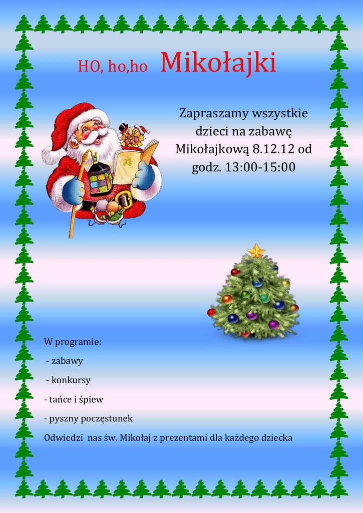 HO, ho,ho Mikołajki Zapraszamy wszystkie dzieci na zabawę Mikołajkową 8.12.12 od godz. 13:00-15:00 W programie: - zabawy - konkursy - tańce i śpiew - pyszny poczęstunek Odwiedzi nas św. Mikołaj z prezentami dla każdego dziecka