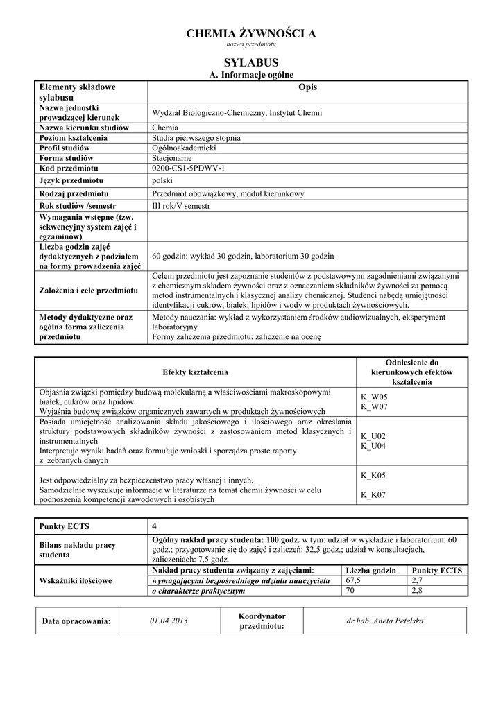 chemia żywności a sylabus - Wydział Biologiczno