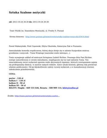 Sztuka Szalone nożyczki od: 2013-10-24 20:30 do: 2013-10-24 20:30 Teatr Wielki im. Stanisława Moniuszki, ul. Fredry 9, Poznań Strona domowa: http://www.poznan.pl/mim/events/sztuka-szalone-nozyczki,65414.html Paweł Małaszyński, Piotr Gąsowski, Edyta Olszówka, Katarzyna Żak w Poznaniu. Amerykańska komedia współczesna, której akcja dzieje się w salonie fryzjerskim mistrza grzebienia i nożyczek - Tonia Wziętego (nazwisko wiele mówiące...). Tonio wynajmuje zakład od mistrzyni fortepianu Izabeli Richter. Pewnego dnia Pani Richter zostaje zamordowana w swoim mieszkaniu, znajdującym się tuż nad salonem Tonia. Ten nieoczekiwany zwrot wydarzeń ujawnia wiele skrywanych tajemnic, których rozwiązaniem zajmie się profesjonalny śledczy, w asyście samych widzów. Autor sztuki bowiem, główną rolę powierzył właśnie publiczności. Od jej błyskotliwości zależy rozwój wydarzeń, a w konsekwencji również zakończenie przedstawienia. CENA: parter - 120 zł balkon I - 120 zł balkon II - 90 zł balkon III - 50 zł BILETY: Magda - 669 555 646, Renata - 508 909 114, [email protected] Źródło: http://www.poznan.pl/mim/events/sztuka-szalon…