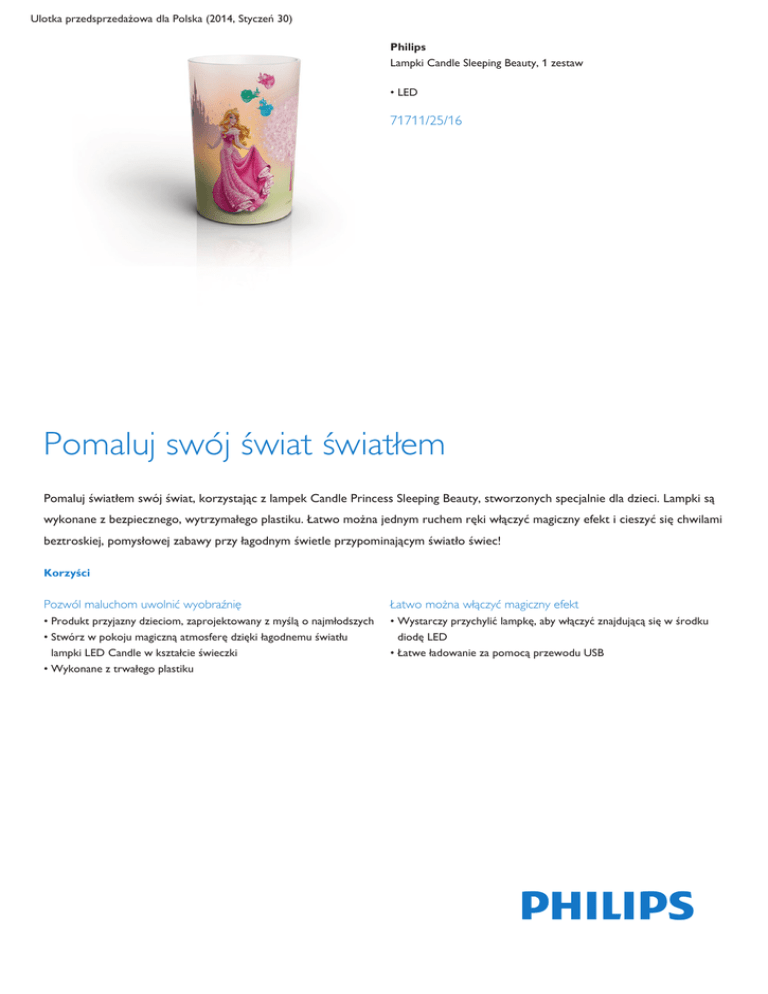 Ulotka przedsprzedażowa dla Polska (2014, Styczeń 30) Philips Lampki Candle Sleeping Beauty, 1 zestaw • LED 71711/25/16 Pomaluj swój świat światłem Pomaluj światłem swój świat, korzystając z lampek Candle Princess Sleeping Beauty, stworzonych specjalnie dla dzieci. Lampki są wykonane z bezpiecznego, wytrzymałego plastiku. Łatwo można jednym ruchem ręki włączyć magiczny efekt i cieszyć się chwilami beztroskiej, pomysłowej zabawy przy łagodnym świetle przypominającym światło świec! Korzyści Pozwól maluchom uwolnić wyobraźnię Łatwo można włączyć magiczny efekt • Produkt przyjazny dzieciom, zaprojektowany z myślą o najmłodszych • Stwórz w pokoju magiczną atmosferę dzięki łagodnemu światłu lampki LED Candle w kształcie świeczki • Wykonane z trwałego plastiku • Wystarczy przychylić lampkę, aby włączyć znajdującą się w środku diodę LED • Łatwe ładowanie za pomocą przewodu USB Cechy Dla dzieci Ładowanie przez USB Zaprojektowane z myślą o najmłodszych lampki LED Candle w kształcie świeczek oświetlają pokój lub miejsce zabaw dziecka, stwarzając wrażenie bezpieczeństwa i przytulności. Lampki LED Candle ładuje się w bezpieczny i prosty sposób przy pomocy znajdującego się w zestawie przewodu USB. Po naładowaniu lampka LED Candle może pobudzać wyobraźnię nawet przez 10 godzin. Łagodny, ciepły efekt światła świec Trwały plastik Lampka LED Candle zapewnia łagodny, ciepły efekt światła świec z delikatnym migotaniem płomienia. Tworzy magiczną atmosferę podczas beztroskiej zabawy. Lampka LED Candle jest wykonana z trwałego plastiku. Wytrzymała lampka w kształcie świeczki to bezpieczny towarzysz zabaw dziecka. Włączanie przez przechylenie Pozwól maluchom uwolnić wyobraźnię! Łatwo można włączyć magiczny efekt, przechylając lampkę. Znajdująca się w środku dioda LED włącza się i wyłącza przy każdym przechyleniu. Dane wkrótce ulegną zmianie 2014, Styczeń 30 Specyfikacje Prosimy pamiętać, że jest to ulotka przedsprzedażowa. Treść ulotki jest zgodna z naszą najlepszą wiedzą w momencie publikacji i w odniesieniu do danego kraju (podane powyżej). Treść ulotki może ulec zmianie bez powiadomienia. Firma Philips nie ponosi odpowiedzialności za treść ulotki. Stylistyka i wykończenie Materiał Kolor Współczynnik IP syntetyk biały Dodatkowe funkcje/akcesoria w zestawie Wbudowane diody LED Doskonale tworzy nastrój Zasilacz w zestawie Klasa ochronności TAK Serwis TAK Gwarancja TAK Wysokość Długość Szerokość Waga 10 cm 6,5 cm 6,5 cm 0,220 kg 11,8 cm 7,3 cm 7,3 cm 0,378 kg Różne Specyfikacja techniczna Zasilanie sieciowe Liczba źródeł światła Moc źródła światła w zestawie Maksymalna moc wymiennego źródła światła 2 lata Wymiary i waga opakowania Wymiary i waga produktu Wysokość Długość Szerokość Waga netto IP20 ochrona przed przedmiotami powyżej 12,5 mm brak ochrony przed wodą III — bezpieczne, bardzo niskie napięcie Opracowano z myślą o Styl Typ 12 V 4 0,06 W Pokój dziecka Salon i sypialnia Pełen ekspresji Oprawa stołowa 1,5 W Dane wkrótce ulegną zmianie 2014, Styczeń 30 Version: 1.0.1 EAN: 8718291489900 © 2014 Koninklijke Philips Electronics N.V. Wszelkie prawa zastrzeżone Dane mogą ulec zmianie bez uprzedniego powiadomienia. Znak towarowy jest własnością Koninklijke Philips Electronics N.V. lub odpowiednich podmiotów . www.philips.com