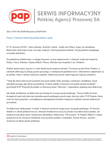 2012-10-07 06:30:00 Warszawa (PAP/PAP) Polacy w Rumunii kultywują polską kulturę i język 07.10. Suczawa (PAP) - Dom rodzinny, Kościół i szkoła - dzięki nim Polacy żyjący na rumuńskiej Bukowinie zachowują swoje zwyczaje, tradycje i mówią językiem polskim. Swoją polskość pielęgnują wszystkie pokolenia. Na południowej Bukowinie, w okręgu Suczawa, są trzy miejscowości, w których większość stanowią Polacy: Nowy Sołoniec, Pojana Mikuli i Plesza. Mieszka tam niespełna 2 tys. Polaków. Polskie społeczności żyją też w wielu okolicznych miejscowościach. Tworzone są tam Domy Polskie, w szkołach odbywają się lekcje języka ojczystego, w tamtejszych parafiach msze i nabożeństwa odprawiane są po polsku. Starsi i młodzi należą do zespołów folklorystycznych, kultywujących tradycje narodowe. "Tutaj dla dzieci pierwszym językiem jest język polski, który poznają z rodzicami i dziadkami. Język rumuński poznają, gdy idą do przedszkola. Z domu jednak wyniesiony jest polski sposób myślenia" powiedział PAP Wojciech Krysiński ze Stowarzyszenia "Obczyny", regionalista, popularyzator Bukowiny. Jak dodał, problemem na Bukowinie jest dostęp do żywego języka polskiego. "Jeszcze kilka lat temu dostępnych tutaj było dziewięć niekodowanych polskojęzycznych stacji, dziś jest tylko TVP Polonia. Może warto by było pomyśleć o nieodpłatnym udostępnieniu kanałów tutejszym wiejskim sieciom kablowym" powiedział. Na Bukowinie funkcjonuje 14 szkół, w których uczniowie mogą uczyć się języka polskiego. W Nowym Sołońcu w szkole podstawowej im. Henryka Sienkiewicza uczą się przede wszystkim dzieci polskie, ale chodzą do niej także dzieci mniejszości ukraińskiej. Szkoła liczy 140 uczniów. W Pojanie Mikuli w szkole podstawowej im. Krystyny Bochenek uczą się dzieci polskie i rumuńskie. Prawie 80 proc. uczniów uczęszcza na lekcje języka polskiego. Copyright PAP SA 2012 http://biznes.pap.pl Mali Polacy przez pierwsze cztery lata mają cztery lekcje języka polskiego w tygodniu, starsi uczniowie trzy lekcje. Od szóstej klasy również uczą się historii Polski w języku polskim. Jak powiedziała PAP Monika Jatczak, nauczycielka języka polskiego z Nowego Sołońca, mimo że szkoła nosi imię polskiego noblisty, z Sienkiewiczem uczniowie zapoznają się dopiero w szkole średniej. "Lektury czytane są raczej we fragmentach. Mamy niestety okrojony program, w ciągu trzech godzin nie ma szans na przerobienie gramatyki, literatury, czytania i mówienia" - powiedziała. "Z lekturami nie jest łatwo także z tego powodu, że potrzebne książki w bibliotece są w dwóch - trzech egzemplarzach. Niektóre fragmenty czytałam z dziećmi na lekcjach" - dodała. Młodzież poznaje język i kulturę także poprzez polskie zespoły ludowe. Do działającego w Pojanie Mikuli zespołu "Mała Pojana" należy 60 osób: dzieci, młodzież i dorośli - często całe rodziny. "Zespół istnieje od 1990 roku. Występujemy w naszych, góralskich strojach, w repertuarze mamy tradycyjne polskie pieśni i tańce. Śpiewamy to, co tu od zawsze na wsi się śpiewało. Zespół to też pewna forma nauki tego, co polskie, choć my czysto po polsku nie mówimy, u nas się gwari" - powiedziała PAP Agnieszka Polaczek, kierownik zespołu. Ksiądz Mariusz Buczewski, proboszcz kościoła w Nowym Sołońcu, podkreślił w rozmowie z PAP, że Polaków za granicą wszędzie łączy Kościół i wspólna wiara. "Tutaj ludzie mówią po polsku, bo tak mówi się w domu, ale też dlatego, że w kościele wszystko odbywa się po polsku. Każdego dnia jest msza święta, są nabożeństwa, to wszystko rozwija się wokół polskiej tradycji" - powiedział. Środki na pielęgnowanie kultury polskiej na Bukowinie przekazują zarówno rumuńskie, jak i polskie władze. Polskie MSZ w ciągu ostatnich dwóch lat przekazało ponad 22 tys. euro na wsparcie wydawnictw polonijnych, projekty kulturalne i oświatowe dla Polaków mieszających na Bukowinie. Ambasada RP w Rumunii pośredniczy w procesie kierowania nauczycieli języka polskiego do szkół znajdujących się w polskich społecznościach na Bukowinie. Na uniwersytetach za stypendia finansowane z budżetu polskiego państwa uczy się w całej Polsce kilkudziesięciu studentów polskiego pochodzenia z rumuńskiej Bukowiny. Przewodniczący Związku Polaków w Rumunii Gerwazy Longier powiedział PAP, że organizacja zrzeszająca 14 polskich organizacji, w tym 11 działających na Bukowinie, prowadzi szereg programów, związanych z tworzeniem szkół i Domów Polskich, oraz programów edukacyjnych. Środki na inwestycje i inne przedsięwzięcia przekazuje zarówno strona polska, jak i rumuńska. Copyright PAP SA 2012 http://biznes.pap.pl Związek Polaków w Rumunii ma sześć własnych Domów Polskich, dwa kolejne są w budowie. Domy Polskie działają też w wynajętych obiektach. "Naszym zamierzeniem jest, by każda z lokalnych organizacji miała swój Dom Polski. Miedzy innymi za pieniądze z Polski wybudowano szkołę w Pojanie Mikuli, będącą dzisiaj wzorcem dla szkół w innych miejscowościach" - wskazał Longier. W sumie na Bukowinie żyje niespełna 6 tys. Polaków. To m.in. potomkowie przybyłych tu w XVIII wieku górników, którzy stworzyli kopalnię soli w miejscowości Kaczyka, a także górali czadeckich, którzy osiedlili się na Bukowinie na początku XIX wieku. Poza tym regionem w Rumunii mieszka ok. 1 tys. Polaków. Z Suczawy Rafał Pogrzebny (PAP) rpo/ ksaj/ ap/ Copyright PAP SA 2012 http://biznes.pap.pl
