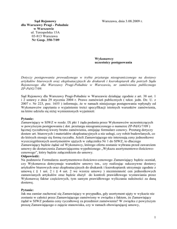 Sąd Rejonowy dla Warszawy Pragi - Południe w Warszawie ul. Terespolska 15A 03-813 Warszawa Nr Gosp. 350-7/09 Warszawa, dnia 3.08.2009 r. Wykonawcy uczestnicy postępowania Dotyczy postępowania prowadzonego w trybie przetargu nieograniczonego na dostawy artykułów biurowych oraz eksploatacyjnych do drukarek i kserokopiarek dla potrzeb Sądu Rejonowego dla Warszawy Pragi-Południe w Warszawie, nr zamówienia publicznego ZP-Pd/G/7/09. Sąd Rejonowy dla Warszawy Pragi-Południe w Warszawie działając zgodnie z art. 38 ust. 1 i 2 ustawy z dnia 29 stycznia 2004 r. Prawo zamówień publicznych ( tekst. jedn. Dz. U. z 2007 r. Nr 223, poz. 1655 ) informuje, Ŝe w ramach niniejszego postępowania wpłynęły od Wykonawców zapytania o wyjaśnienie treści specyfikacji istotnych warunków zamówienia, na które udziela się niŜej wymienionych wyjaśnień: Pytanie: Zamawiający w SIWZ w rozdz. IX pkt 1 Ŝąda podania przez Wykonawców uczestniczących w powyŜszym postępowaniu ( dot. przetargu nieograniczonego o numerze ZP-Pd/G/7/09 ) łącznej ryczałtowej kwoty brutto zamówienia, omijając formularz cenowy. Przetarg dotyczy dostaw art. biurowych i materiałów eksploatacyjnych a nie usługi, czy robót budowlanych, co do których stosuje się formę ryczałtu. JeŜeli Zamawiającego nie interesują ceny jednostkowe wyszczególnionych asortymentów ujętych w załączniku Nr 1 do SIWZ, to dlaczego Zamawiający będzie Ŝądać od Wykonawcy, którego oferta zostanie wybrana przed zawarciem umowy do dostarczenia Zamawiającemu wypełnionego „Wykazu asortymentowo-ilościowocenowego”, który będzie załącznikiem do umowy. Odpowiedź: Na podstawie Formularza asortymentowo-ilościowo-cenowego Zamawiający będzie oceniał, czy Wykonawca dotrzymuje warunków umowy tzn., czy realizując sukcesywne dostawy artykułów biurowych oraz eksploatacyjnych do drukarek i kserokopiarek utrzymuje zgodnie z umową ( § 1 ust. 2 i § 4 ust. 2 we wzorze umowy ) niezmienność cen jednostkowych zamawianych artykułów oraz będzie słuŜył do kontroli prawidłowego wystawiania przez Wykonawcę faktur częściowych, tym samym prawidłowego wyliczania naleŜności za daną dostawę. Pytanie: Jak ma zamiar zachować się Zamawiający w przypadku, gdy asortyment ujęty w wykazie nie zostanie w całości przez Zamawiającego zamówiony w związku z faktem, Ŝe Zamawiający Ŝądał w SIWZ podania ceny ryczałtowej za przedmiot zamówienia? W związku z powyŜszym proszę Zamawiającego o zajęcie stanowiska, czy w ramach obowiązującej umowy, 1 wynagrodzenie będzie płacone w formie ryczałtu, czy zgodnie z „Wykazem ilościowocenowym”?. Odpowiedź: Zgodnie z § 4 ust. 4 i ust. 5 umowy naleŜność za daną dostawę obliczona będzie w oparciu o faktyczną ilość dostarczonych w tej dostawie artykułów biurowych i eksploatacyjnych oraz ich ceny jednostkowe, wynikające z „Wykazu asortymentowo-ilościowo-cenowego”, stanowiącego załącznik nr 2 do umowy. Suma naleŜności z wszystkich faktur wystawionych przez Wykonawcę w ramach realizacji niniejszej umowy nie moŜe przekroczyć określonej w § 4 ust. 1 umowy, tj. łącznej ryczałtowej ceny brutto oferty. Pytanie: Zamawiający w rozdz. XI pkt. 1 i 2 będzie Ŝądał od Wykonawcy, którego oferta zostanie wybrana przed zawarciem umowy do dostarczenia Zamawiającemu wypełnionego „Wykazu asortymentowo-ilościowo-cenowego”, który będzie załącznikiem do umowy z jednoczesnym zaznaczeniem, Ŝe wykaz ten winien być zgodny z ceną brutto oferty. Jak zachowa się Zamawiający, kiedy Wykonawca pomyli się w obliczeniach przy sporządzeniu „Wykazu asortymentowo-ilościowo-cenowym” i wartość ogólna w powyŜszym wykazie będzie się róŜniła od ryczałtu? Odpowiedź: Wykonawca przed podpisaniem umowy zobowiązany będzie do sporządzenia ponownej kalkulacji cenowej w „Wykazie asortymentowo-ilościowo-cenowym” w taki sposób, aby łączna cena brutto za wszystkie wymienione w nim artykuły odpowiadała łącznej ryczałtowej cenie brutto oferty. W przypadku odmowy Zamawiający uzna, Ŝe Wykonawca dokonał po wyborze oferty najkorzystniejszej zmiany swojej oferty i uchyla się od zawarcia z Zamawiającym umowy. Pytania do opisu przedmiotu zamówienia zawartego w Wykazie asortymentowo-ilościowym – załącznik nr 1 do siwz. Pytanie: • poz.6 - nie występuje taśma 19mmx32m; opisane taśmy występują jedynie w rozmiarach 19mmx33m i pakowane są pojedynczo lub w słupku po 10 szt. ewentualnie taśmy 18mmx30m dostępne są w słupkach po 8 sztuk; prosimy o stanowisko Zamawiającego i zmianę zapisu, Odpowiedź do poz. 6: Taśma 19mm x 33m pakowane w słupku po 10 szuk. Pytanie: • poz. 12 i 13 - opis segregatora zawiera wymóg posiadania „na dolnych krawędziach metalowego okucia” ale jednocześnie segregatory mają być „bez listwy metalowej” – prosimy o zmianę zapisu, Odpowiedź do poz. 12 Segregator mechaniczny Donau A-4 wykonany z tektury pokrytej ekologiczną folią polipropylenową o strukturze płótna (100mic),gramatura kartonu 1290g/m² , grubość kartonu 2,1 mm, wymiary 285x320mm, szerokość grzbietu 50 mm, dźwignia wysokiej jakości z dociskaczem, na dolnych krawędziach metalowe okucia. Segregatory w róŜnych kolorach ( czerwony, zielony ,Ŝółty – kolor i ilość w zaleŜności od potrzeb zamawiającego ). Odpowiedź do poz. 13 2 Segregator mechaniczny Donau A-4 wykonany z tektury pokrytej ekologiczną folią polipropylenową o strukturze płótna (100mic),gramatura kartonu 1290g/m² , grubość kartonu 2,1 mm wymiary 285mm x 320mm, szerokość grzbietu 75 mm dźwignia wysokiej jakości z dociskaczem, na dolnych krawędziach metalowe okucia. Segregatory w róŜnych kolorach ( czerwony, zielony ,Ŝółty – kolor i ilość w zaleŜności od potrzeb zamawiającego ). Pytanie: • poz. 39 - nawilŜacze do palców nie posiadają pojemności, prosimy podać minimalną wymaganą średnicę. Odpowiedź do poz. 39: