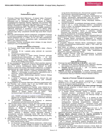 REGULAMIN PROMOCJI „POLECAM BANK MILLENNIUM – III edycja”(dalej „Regulamin”) § 1. Postanowienia ogólne 1. Promocja „Polecam Bank Millennium - III edycja” (dalej: „Promocja”) organizowana jest przez Bank Millennium S.A. z siedzibą w Warszawie przy ul. Stanisława Żaryna 2A, wpisany do Rejestru Przedsiębiorców Krajowego Rejestru Sądowego pod numerem KRS 0000010186, prowadzonego przez Sąd Rejonowy w Warszawie - XIII Wydział Gospodarczy Krajowego Rejestru Sądowego, o numerze identyfikacji podatkowej (NIP) – 526-021-29-31 i kapitale zakładowym całkowicie wpłaconym w wysokości 1.213.116.777 złotych (dalej: „Organizator” lub „Bank”) i ma na celu zachęcenie klientów Banku do polecania jego usług i pozyskanie wskutek tego przez Bank nowych klientów. 2. Bank jest administratorem danych osobowych uczestników Promocji w rozumieniu przepisów Ustawy z dnia 29 sierpnia 1997 r. o ochronie danych osobowych (Dz. U. z 2002 r. Nr 101, poz. 926 z późniejszymi zmianami). Dane osobowe uczestników będą przetwarzane przez Bank w celu realizacji Promocji. 3. Uczestnikowi Promocji przysługuje prawo dostępu do jego danych osobowych oraz ich poprawienia. § 2. Zasady uczestnictwa w Promocji 1. W Promocji może wziąć udział osoba fizyczna (dalej: „Obecny Klient”), która: 1) ukończyła 18 lat i posiada pełną zdolność do czynności prawnych, 2) nie jest pracownikiem Banku, 3) posiada lub otworzy w czasie trwania Promocji rachunek oszczędnościowo-rozliczeniowy w Banku, i do dnia zakończenia Promocji, określonego w § 3 ust. 1., nie rozwiąże lub nie wypowie umowy dotyczącej otwarcia i prowadzenia Konta lub nie odstąpi od tej umowy. 2. W celu przystąpienia do Promocji Obecny Klient powinien zapoznać się z Regulaminem , dostępnym na stronie internetowej Banku, jak również w serwisie transakcyjnym Banku „Millenet” na profilu własnym w sekcji pod nazwą „Polecam Bank Millennium”, a następnie zaakceptować go, czego dokonuje w jeden z poniższych sposobów: 1) logując się przez internet w systemie transakcyjnym Banku „Millenet” i i odznaczając na swoim profilu odpowiednie pole w sekcji pod nazwą „Polecam Bank Millennium”; 2) podczas kontaktu telefonicznego poprzez Centrum Obsługi Telefonicznej ; 3) w jednej z wybranych placówek Banku, których lista jest dostępna w placówkach Banku oraz pod numerem Telemillennium. 3. Po przystąpieniu do Promocji Obecnemu Klientowi przypisywany jest kod Promocji, czyli unikalny ciąg 6 cyfr (np.123456) (dalej „Kod Promocji”), generowanych systemowo , który: 1) w przypadku przystąpienia do Promocji przez internet lub za pośrednictwem Centrum Obsługi Telefonicznej znajduje się w sekcji poświęconej Promocji w systemie transakcyjnym Banku „Millenet” w postaci sześciu cyfr na końcu linku zamieszczonego w tej sekcji (np. w przypadku linku: https://polecam.bankmillennium.pl/?id=123456 Kod Promocji to cyfry „123456”) gotowego do wysłania w poleceniu we własnym zakresie lub za pośrednictwem Banku w wiadomości tekstowej SMS lub drogą mailową; 2) w przypadku przystąpienia do Promocji w placówce przekazywany jest przez pracownika Banku. 4. Obecny Klient bierze udział w Promocji, gdy poleca osobie, która nie ma zawartej żadnej umowy z Bankiem i nie jest lub nie była uprawniona do składania dyspozycji dotyczących jakiegokolwiek rachunku w Banku po 01.04.2015 r., jako posiadacz, współposiadacz rachunku lub pełnomocnik, przedstawiciel ustawowy, opiekun lub kurator posiadacza rachunku (dalej: „Nowy Klient”), zawarcie z Bankiem umowy dotyczącej otwarcia i prowadzenia rachunku bankowego Konto 360° lub Konto 360° Student (dalej: „Konto”), przekazując Nowemu Klientowi w dowolny sposób Kod Promocji. 5. Nowy Klient może, zawrzeć umowę, o której mowa w ust. 4., przy wykorzystaniu polecenia Konta, w jeden z poniższych sposobów: 1) przez internet (online), wtedy: a) po otrzymaniu od Obecnego Klienta wiadomości, o której mowa w ust. 3 pkt 1 powyżej, klikając na zawarty w niej link, przejść do strony internetowej, do której on odsyła (w znajdującym się 6. 7. 8. 9. 1. 2. na tej stronie internetowej polu „Kod promocji” powinien widnieć Kod Promocji z otrzymanej wiadomości, np. 123456), b) zapoznać się z Regulaminem , a następnie zaakceptować go poprzez zaznaczenie odpowiedniego pola we wniosku o zawarcie umowy dotyczącej otwarcia i prowadzenia Konta., c) złożyć wniosek o zawarcie umowy dotyczącej otwarcia i prowadzenia Konta d) zawrzeć z Bankiem, na podstawie złożonego wniosku, o którym mowa w pkt. c., umowę dotyczącą otwarcia i prowadzenia Konta, w trybie i na zasadach określonych w regulaminach, o których mowa w § 6 ust. 3. 2) w placówce Banku, przy czym Nowy Klient zobowiązany jest poinformować pracownika Banku o poleceniu, podając otrzymany Kod promocji, a przed złożeniem wniosku złożyć pisemne oświadczenie, że akceptuje Regulamin. Akceptacja Regulaminu oznacza, że Nowy Klient upoważnia Bank do przekazywania Obecnemu Klientowi informacji o dokonanych przez Bank i Nowego Klienta czynnościach bankowych, w zakresie niezbędnym do uzyskania przez Obecnego Klienta nagrody, o której mowa w § 4 ust. 1. W przypadku Obecnych Klientów Banku posiadających wspólny rachunek oszczędnościowo-rozliczeniowy, każdy z nich może być uczestnikiem Promocji. Nowy Klient, po zawarciu w ramach Promocji umowy dotyczącej otwarcia i prowadzenia Konta, może polecać Konto innym osobom. W takim przypadku zastosowanie będą miały postanowienia Regulaminu, dotyczące Obecnego Klienta. Każdy uczestnik Promocji, może być zarejestrowany w ramach Promocji tylko raz, przy czym rejestracja oznacza dokonanie czynności, o których mowa w ust. 3. § 3. Czas trwania Promocji Promocja trwa od 13.06.2016 do 31.08.2016 r., przy czym: 1) polecanie Konta Nowym Klientom przez Obecnych Klientów jest możliwe w okresie od13.06.2016 do 31