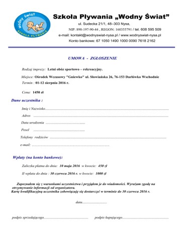 Szkoła Pływania „Wodny Świat” ul. Sudecka 21/1, 48–303 Nysa, NIP: 898-197-90-44 , REGON: 160355791 / tel. 608 595 509 e-mail: [email protected] / www.wodnyswiat-nysa.pl Konto bankowe: 67 1050 1490 1000 0090 7618 2162 UMOWA - ZGŁOSZENIE Rodzaj imprezy: Letni obóz sportowo – rekreacyjny. Miejsce: Ośrodek Wczasowy "Gniewko" ul. Słowiańska 26, 76-153 Darłówko Wschodnie Termin : 01-12 sierpnia 2016 r. Cena: 1450 zł Dane uczestnika : Imię i Nazwisko........................................................................................................................................ Adres .................................................................................................................................................... Data urodzenia ........................................... Pesel ........................................................ Telefony rodziców ................................................................................................................................ e-mail: ………………………………………………………. Wpłaty (na konto bankowe): Zaliczka płatna do dnia: 10 maja 2016 w kwocie: 450 zł II wpłata do dnia : 30 czerwca 2016 r. w kwocie: 1000 zł Zapoznałem się z warunkami uczestnictwa i przyjąłem je do wiadomości. Wyrażam zgodę na otrzymywanie informacji od organizatora. Kartę kwalifikacyjną uczestnika zobowiązuję się dostarczyć w terminie do 30 czerwca 2016 r. data........................... podpis sprzedającego................................................. podpis kupującego...................................................
