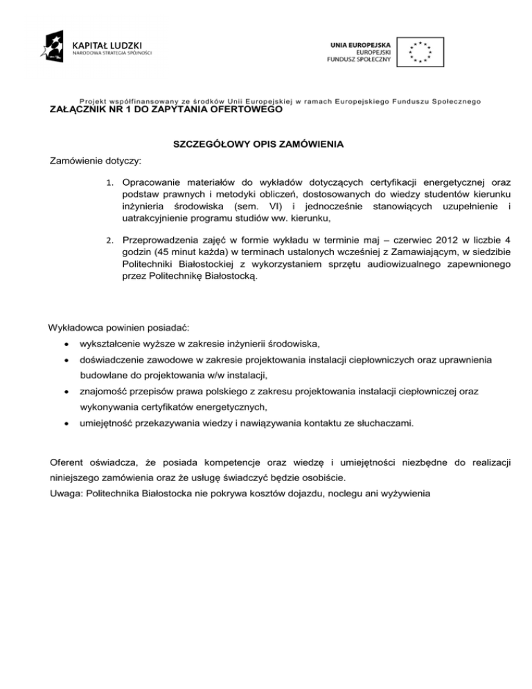 P roj ekt ws p ółf i na ns o wa n y ze ś rodk ó w Uni i E u ro p ejsk iej w ram ac h E uro p ejsk ie g o Fun d us zu S p oł ec zn eg o ZAŁĄCZNIK NR 1 DO ZAPYTANIA OFERTOWEGO SZCZEGÓŁOWY OPIS ZAMÓWIENIA Zamówienie dotyczy: 1. Opracowanie materiałów do wykładów dotyczących certyfikacji energetycznej oraz podstaw prawnych i metodyki obliczeń, dostosowanych do wiedzy studentów kierunku inżynieria środowiska (sem. VI) i jednocześnie stanowiących uzupełnienie i uatrakcyjnienie programu studiów ww. kierunku, 2. Przeprowadzenia zajęć w formie wykładu w terminie maj – czerwiec 2012 w liczbie 4 godzin (45 minut każda) w terminach ustalonych wcześniej z Zamawiającym, w siedzibie Politechniki Białostockiej z wykorzystaniem sprzętu audiowizualnego zapewnionego przez Politechnikę Białostocką. Wykładowca powinien posiadać: • wykształcenie wyższe w zakresie inżynierii środowiska, • doświadczenie zawodowe w zakresie projektowania instalacji ciepłowniczych oraz uprawnienia budowlane do projektowania w/w instalacji, • znajomość przepisów prawa polskiego z zakresu projektowania instalacji ciepłowniczej oraz wykonywania certyfikatów energetycznych, • umiejętność przekazywania wiedzy i nawiązywania kontaktu ze słuchaczami. Oferent oświadcza, że posiada kompetencje oraz wiedzę i umiejętności niezbędne do realizacji niniejszego zamówienia oraz że usługę świadczyć będzie osobiście. Uwaga: Politechnika Białostocka nie pokrywa kosztów dojazdu, noclegu ani wyżywienia P roj ekt ws p ółf i na ns o wa n y ze ś rodk ó w Uni i E u ro p ejsk iej w ram ac h E uro p ejsk ie g o Fun d us zu S p oł ec zn eg o ZAŁĄCZNIK NR 2 DO ZAPYTANIA OFERTOWEGO FORMULARZ OFERTOWY /miejscowość i data/ /Nazwa i adres Oferenta/ OFERTA Politechnika Białostocka Wydział Budownictwa i Inżynierii Środowiska Odpowiadając na zapytanie ofertowe dotyczące osoby prowadzącej zajęcia w formie wykładów dotyczących certyfikacji energetycznej, podstaw prawnych i metodyki obliczeń w ramach realizacji projektu „Podniesienie atrakcyjności oferty edukacyjnej kierunków: budownictwo, inżynieria środowiska i ochrona środowiska na Wydziale Budownictwa i Inżynierii Środowiska Politechniki Białostockiej", Zadanie: Wykłady zamawiane ze specjalistami/praktykami z inżynierii środowiska, oświadczam, że: 1. oferuję realizację przedmiotu zamówienia za godzinę zajęć (45 minut każda) w cenie .................................... zł brutto (słownie: .......................................... ), łącznie za .................................... zł brutto (słownie: ......................................... .), w ilości . ......... godzin (45 minut każda) zgodnie z programem autorskim w terminach ustalonych z Zamawiającym, 2. cena wskazana w pkt. 1 jest ceną ryczałtową i uwzględnia wszystkie koszty wykonania zamówienia (m.in. koszty dojazdu, przygotowanie materiałów dydaktycznych); 3. zapoznałem się z treścią Zapytania Ofertowego i nie wnoszę do niego zastrzeżeń oraz przyjmuję warunki w nim zawarte; 4. w przypadku przyznania mi zamówienia, zobowiązuję się do zawarcia umowy w miejscu i terminie wskazanym przez Zamawiającego. /podpis Oferenta/