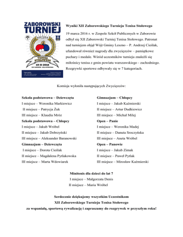 Wyniki XII Zaborowskiego Turnieju Tenisa Stołowego 19 marca 2016 r. w Zespole Szkół Publicznych w Zaborowie odbył się XII Zaborowski Turniej Tenisa Stołowego. Patronat nad turniejem objął Wójt Gminy Leszno – P. Andrzej Cieślak, ufundował również nagrody dla zwycięzców – pamiątkowe puchary i medale. Wśród uczestników turnieju znaleźli się miłośnicy tenisa z gmin powiatu warszawskiego - zachodniego. Rozgrywki sportowe odbywały się w 7 kategoriach. Komisja wyłoniła następujących Zwycięzców: Szkoła podstawowa – Dziewczęta Gimnazjum – Chłopcy I miejsce – Weronika Markiewicz I miejsce – Jakub Kaźmierski II miejsce – Patrycja Żuk II miejsce – Artur Dudkiewicz III miejsce – Klaudia Mróz III miejsce – Michał Milej Szkoła podstawowa – Chłopcy Open – Panie I miejsce – Jakub Wróbel I miejsce – Weronika Madej II miejsce – Jakub Dobrzyński II miejsce – Danuta Sroczyńska III miejsce – Aleksander Baranowski III miejsce – Aneta Wróbel Gimnazjum – Dziewczęta Open – Panowie I miejsce – Dorota Cieślak I miejsce – Jakub Zimak II miejsce – Magdalena Pytlakowska II miejsce – Paweł Pytlak III miejsce – Marta Wdowiarek III miejsce – Mirosław Kaźmierski Minitenis dla dzieci do lat 7 I miejsce – Małgorzata Denis II miejsce – Maria Wróbel Serdecznie dziękujemy wszystkim Uczestnikom XII Zaborowskiego Turnieju Tenisa Stołowego za wspaniałą, sportową rywalizację i zapraszamy do rozgrywek w przyszłym roku!